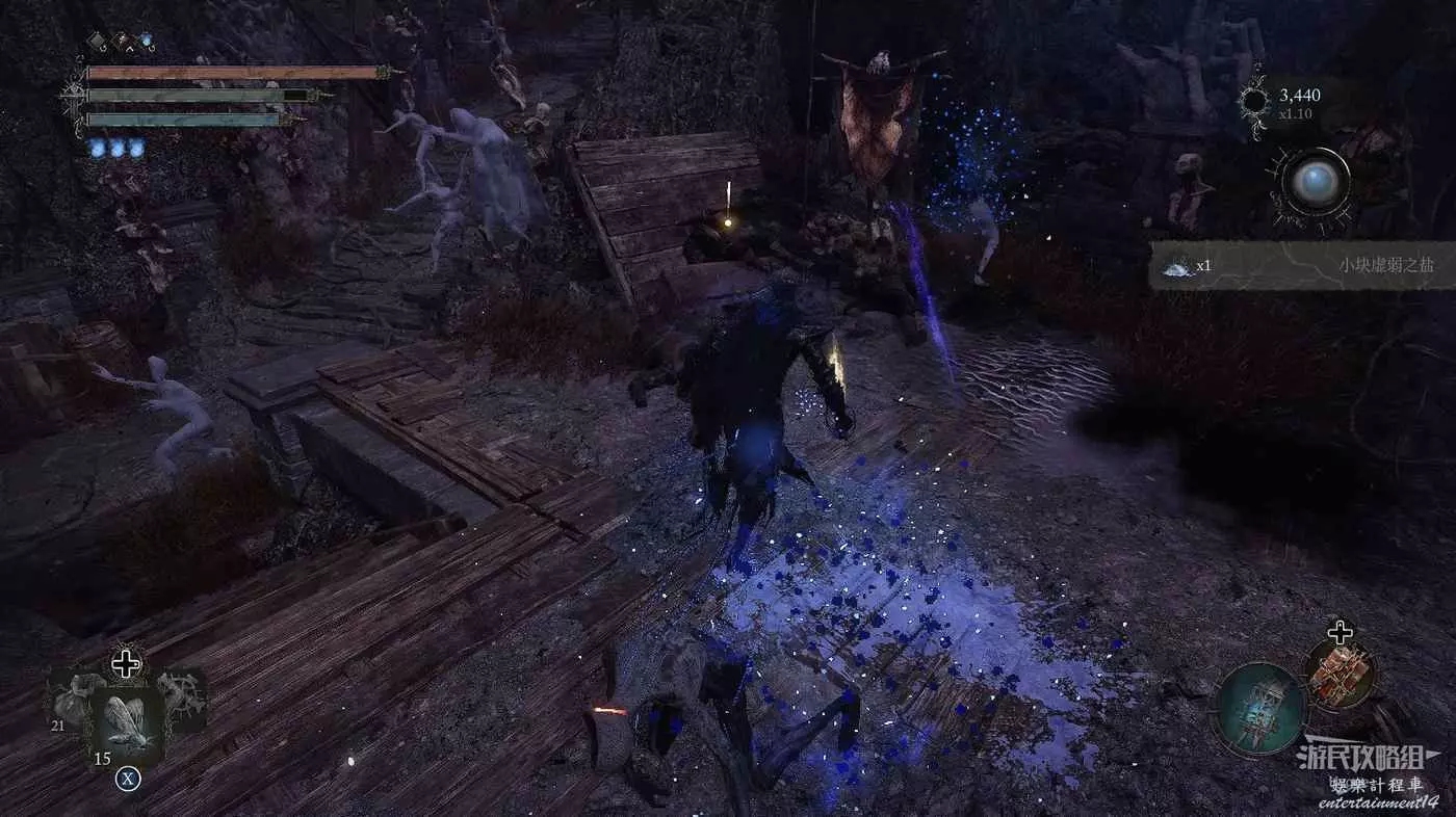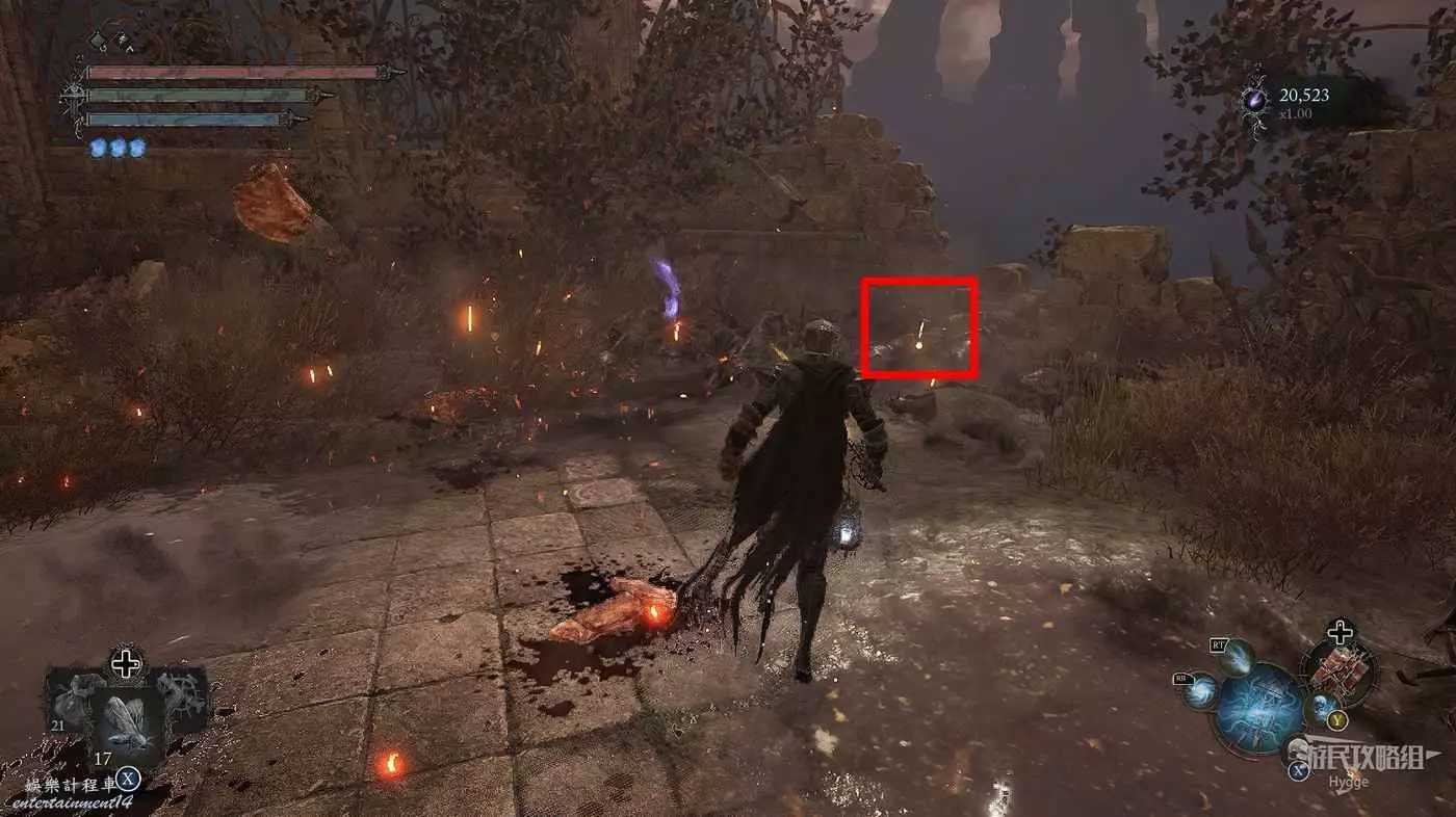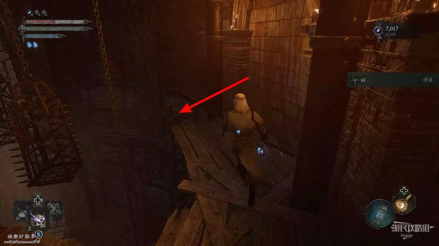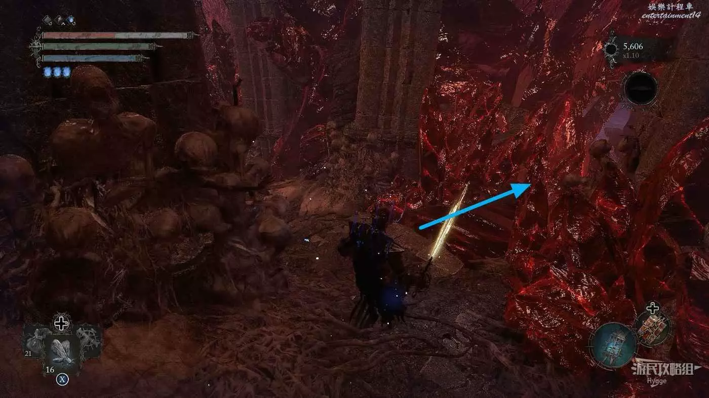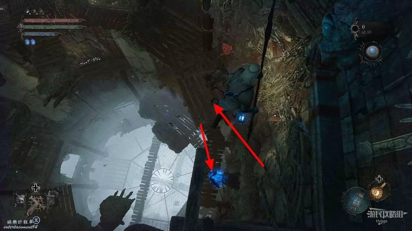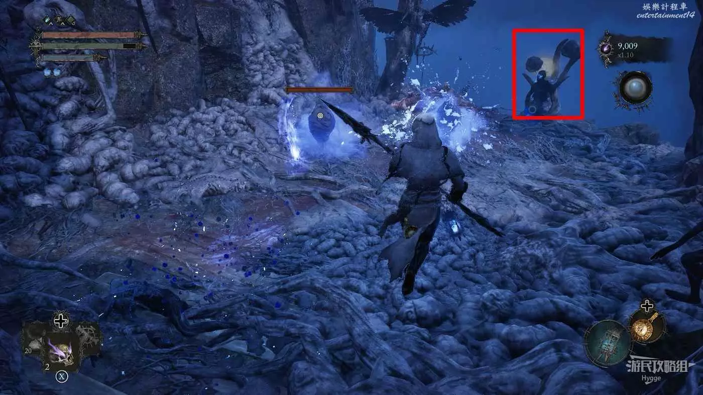 在上層進入影界,從右側平臺旁牆壁上的靈魂處可以獲得【麻木女巫莉蒂亞的影界之眼】。旁邊的道具是影界陷阱。