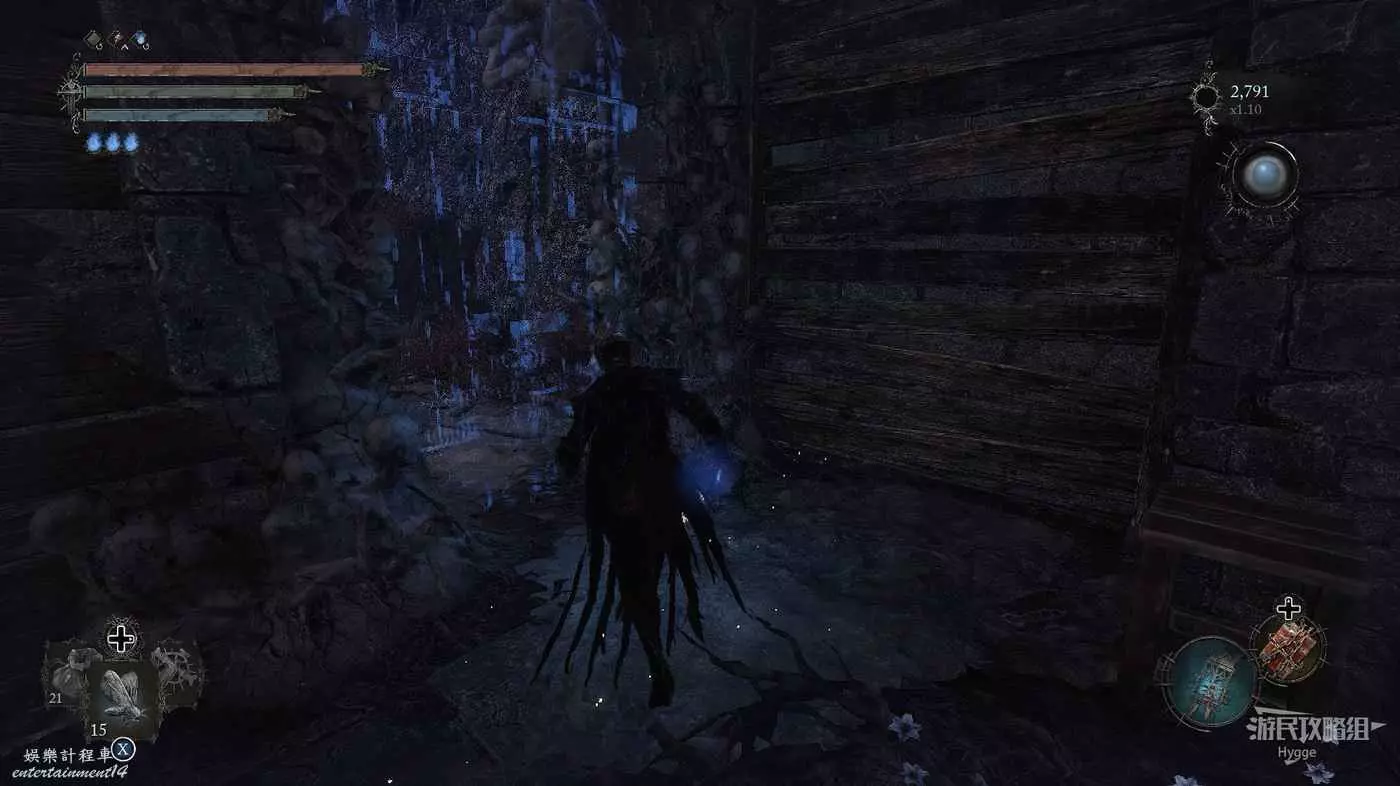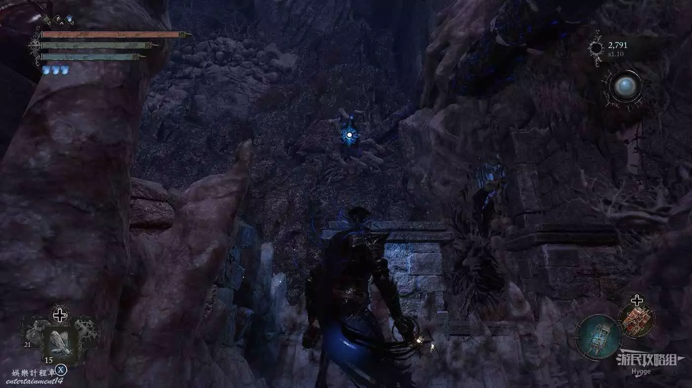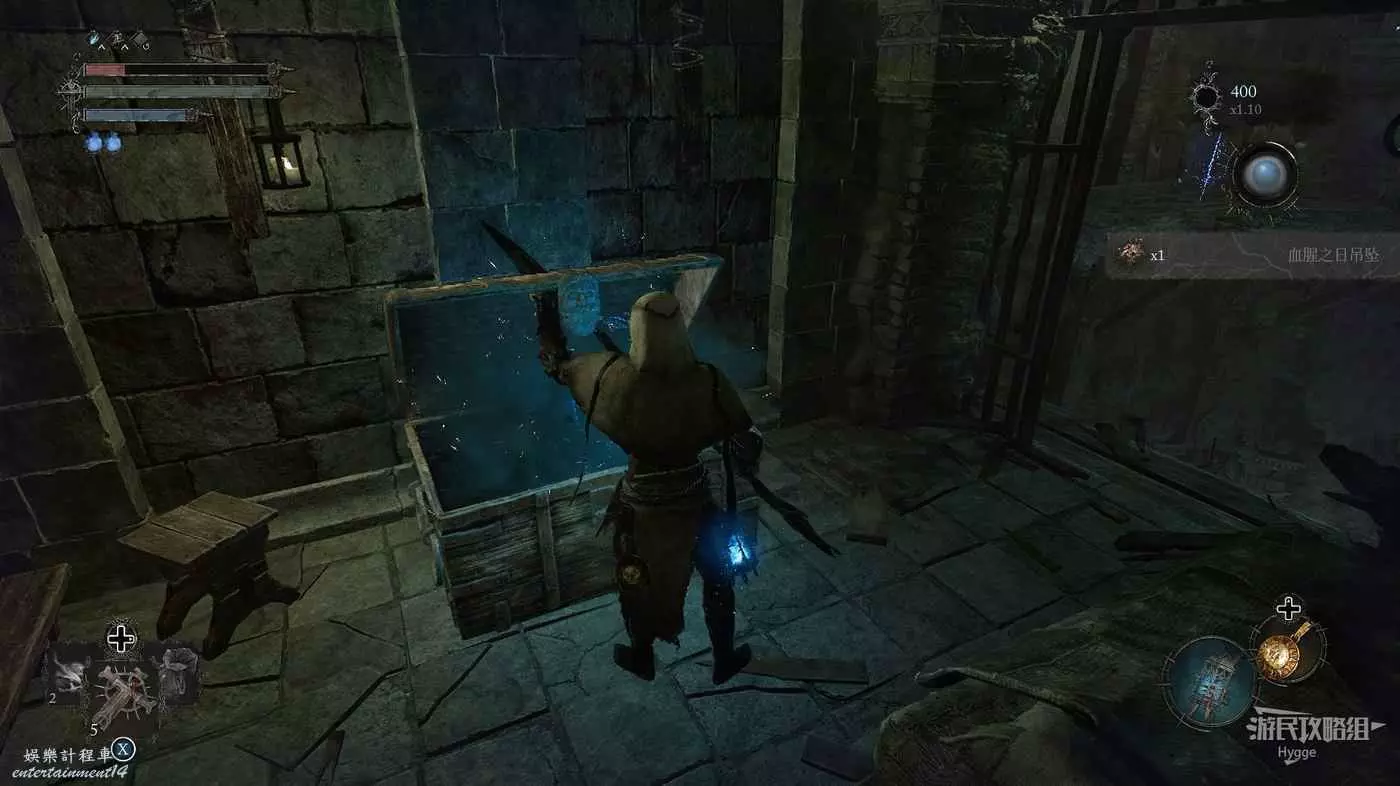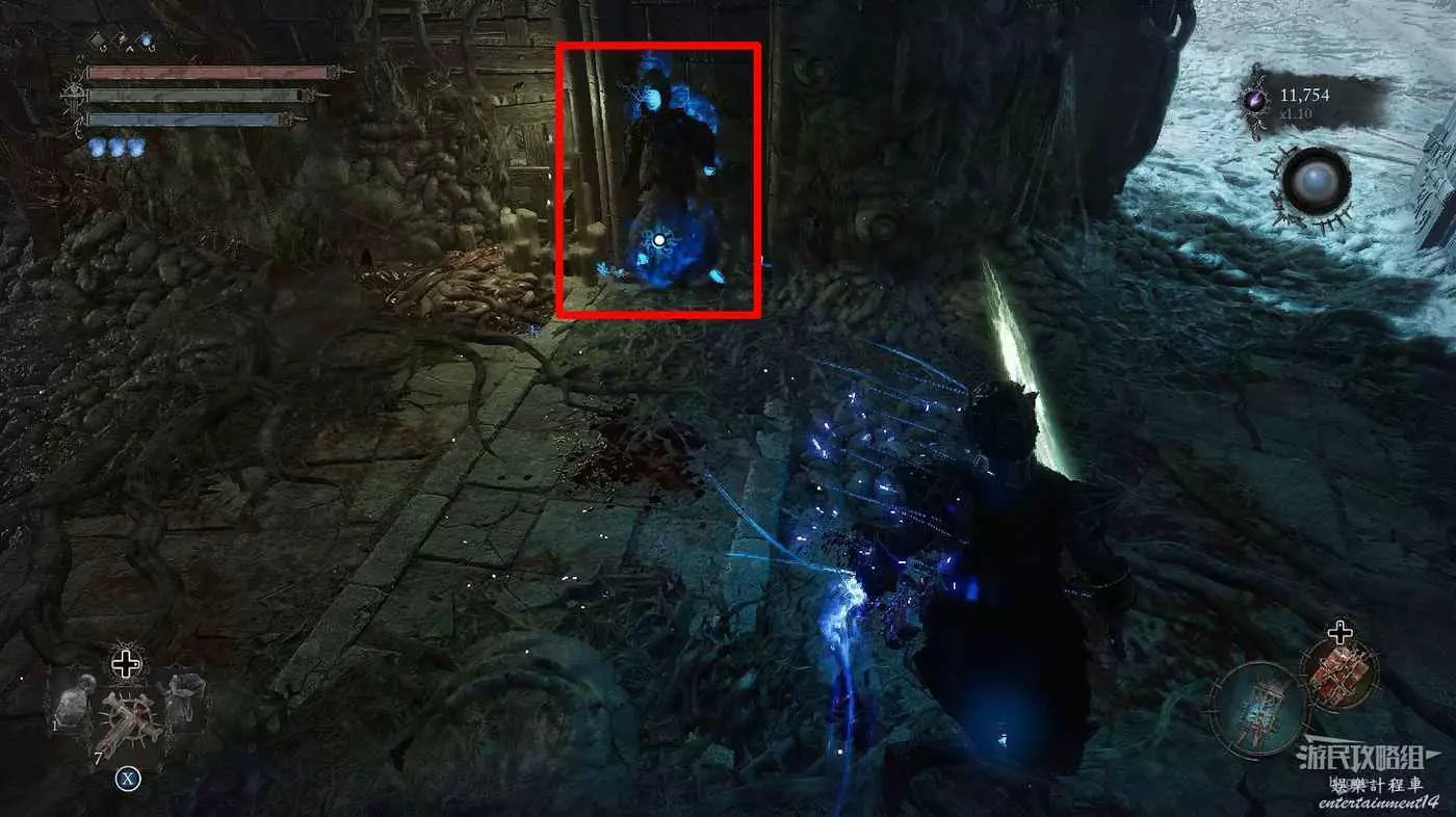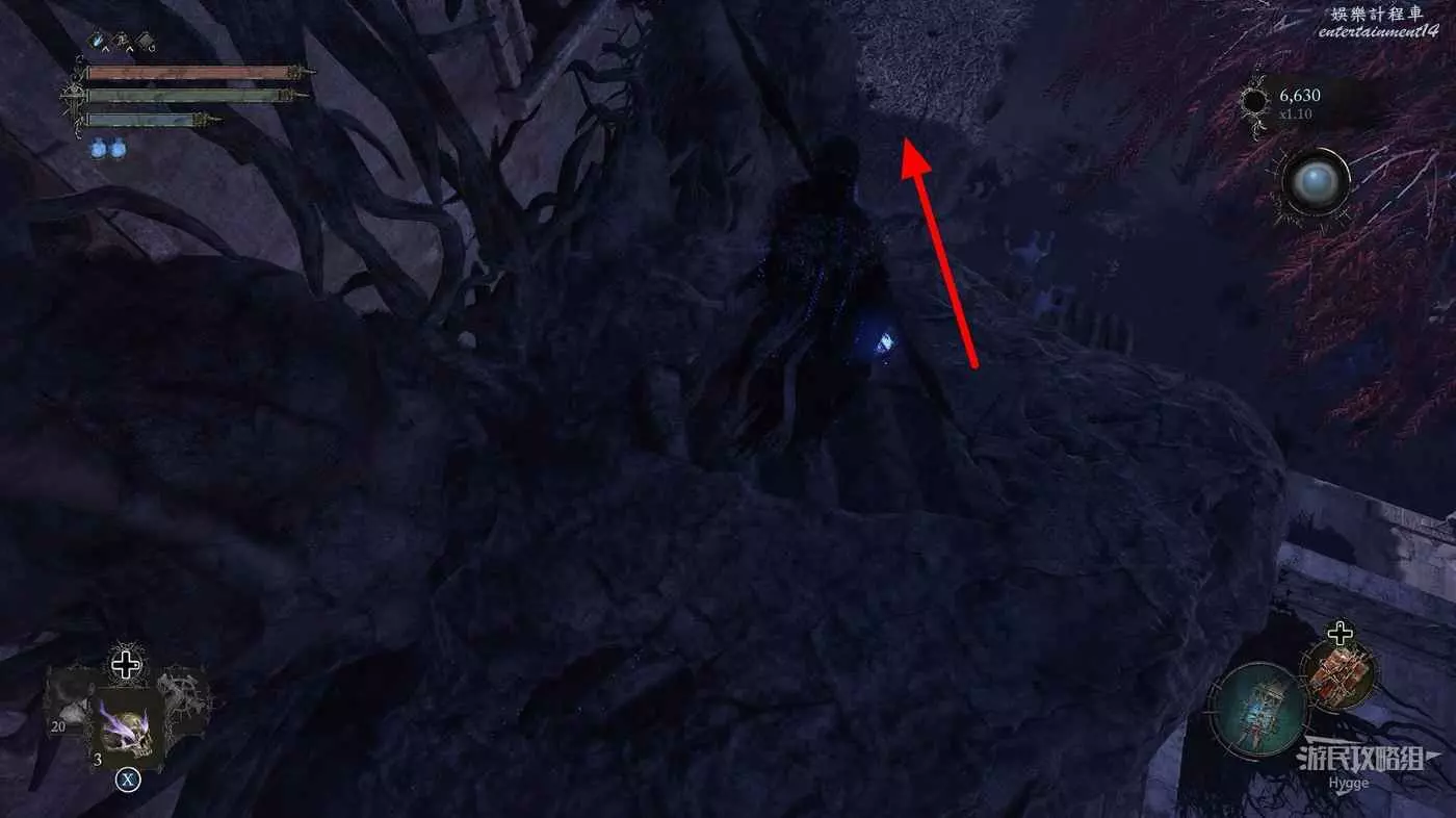 在上層進入影界,從右側平臺旁牆壁上的靈魂處可以獲得【麻木女巫莉蒂亞的影界之眼】。旁邊的道具是影界陷阱。