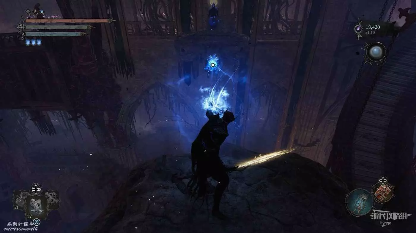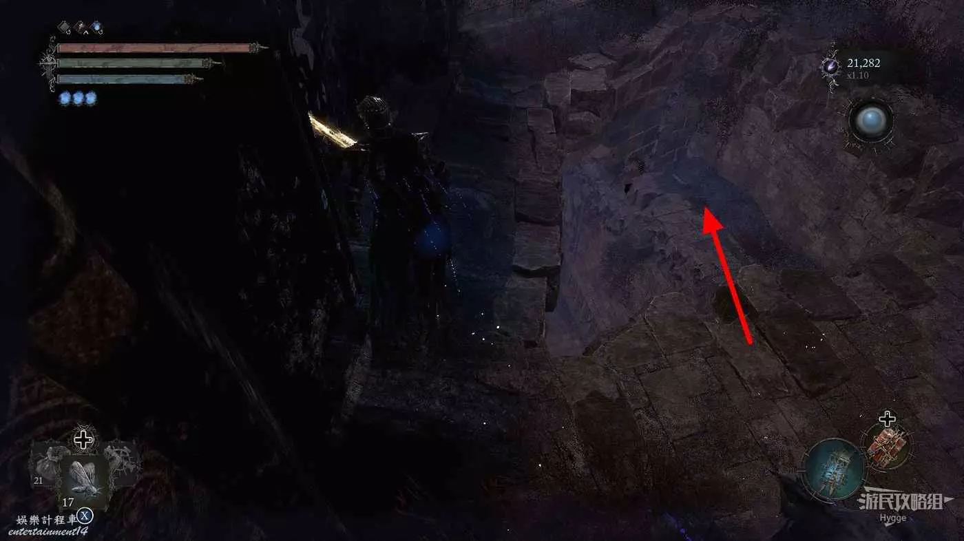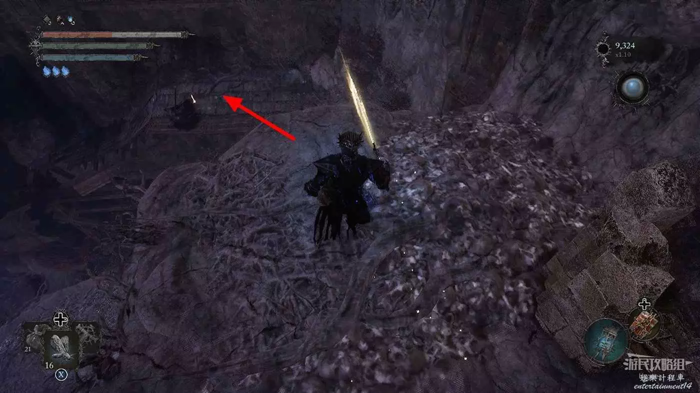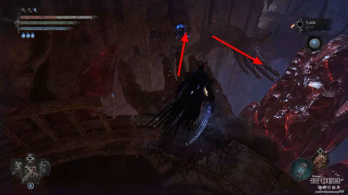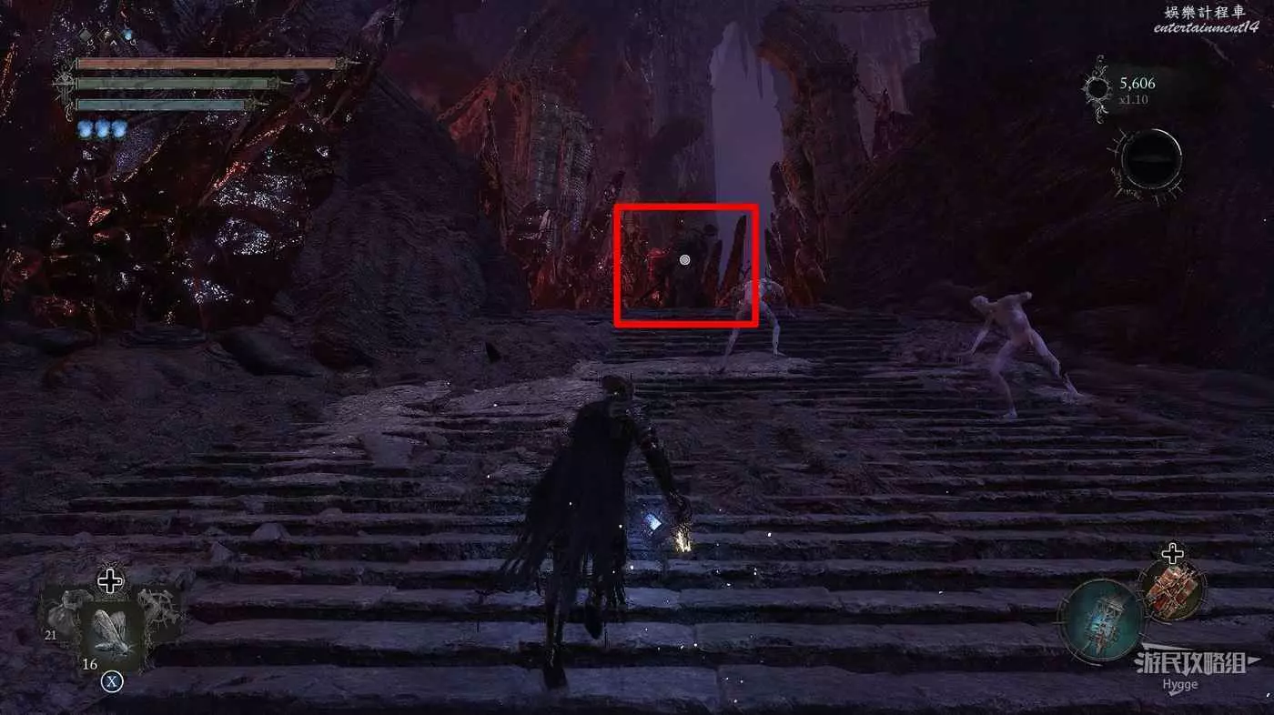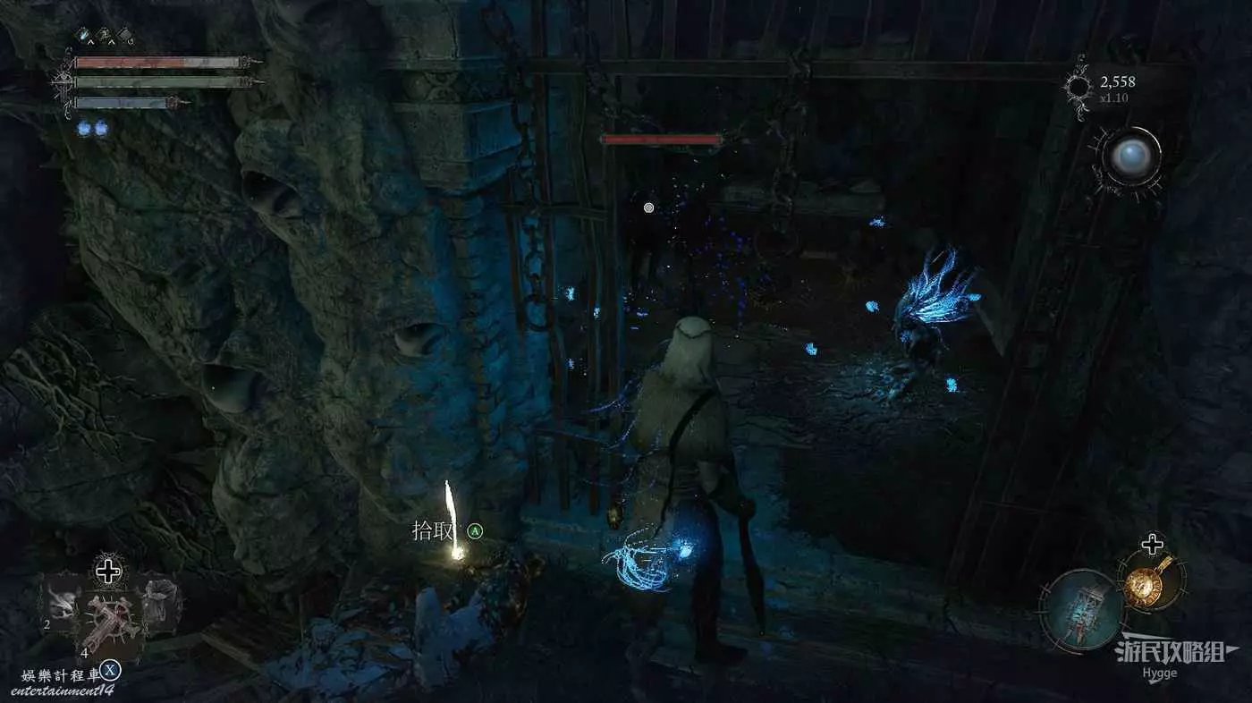 在上層進入影界,從右側平臺旁牆壁上的靈魂處可以獲得【麻木女巫莉蒂亞的影界之眼】。旁邊的道具是影界陷阱。