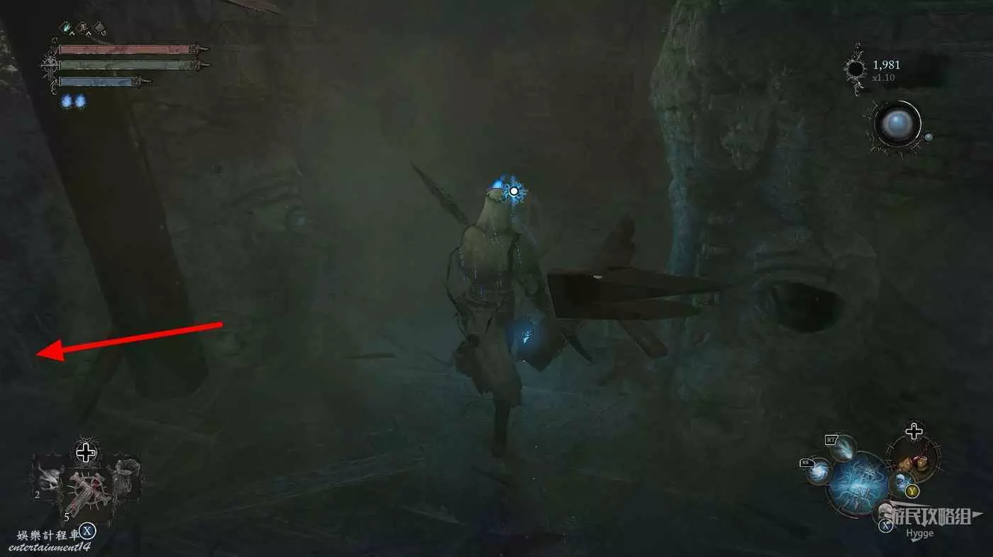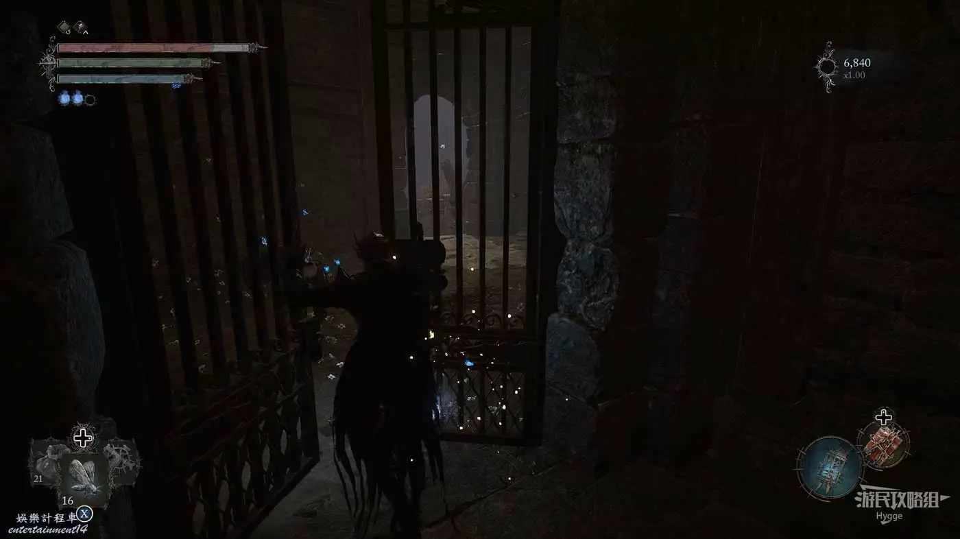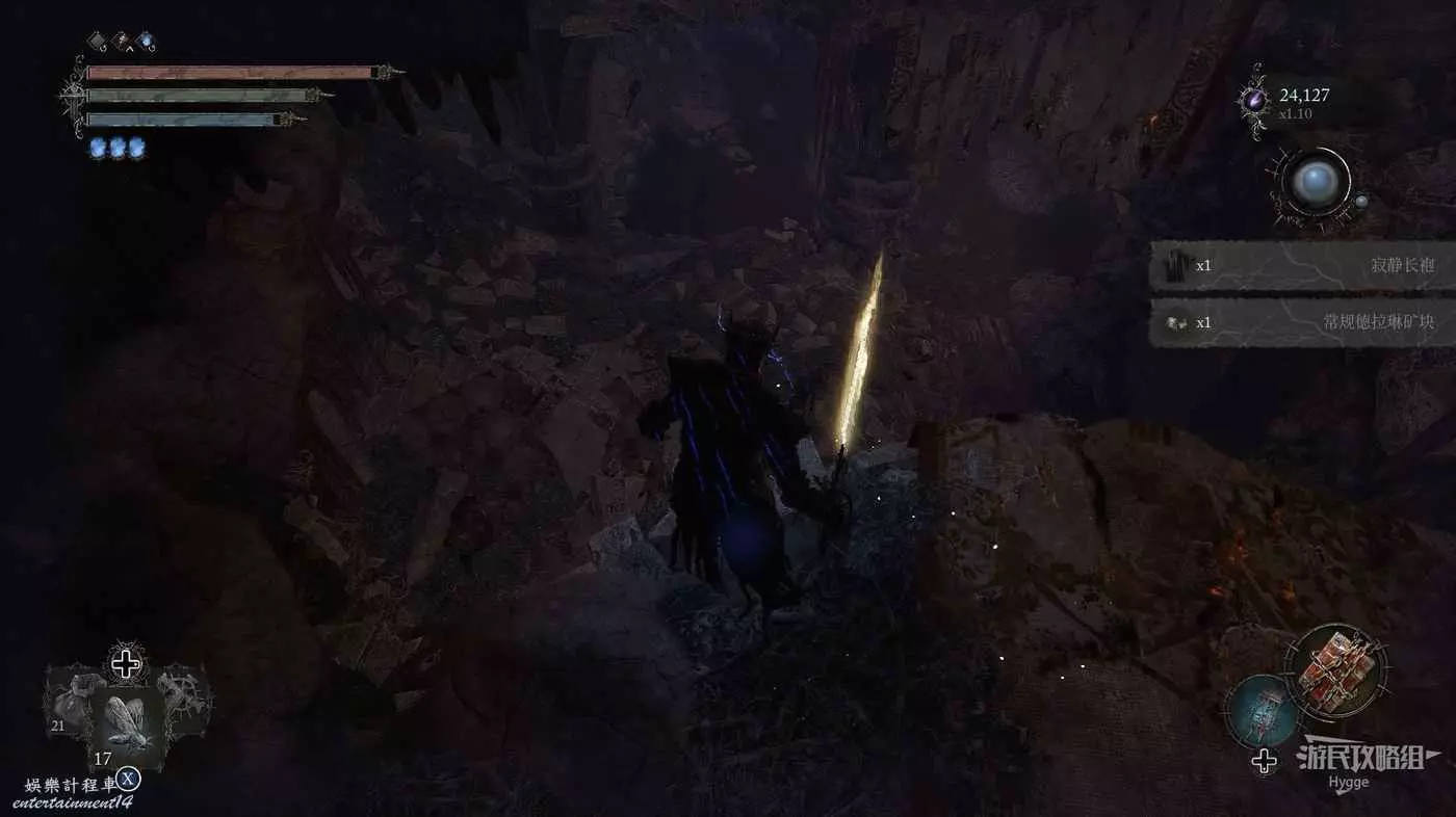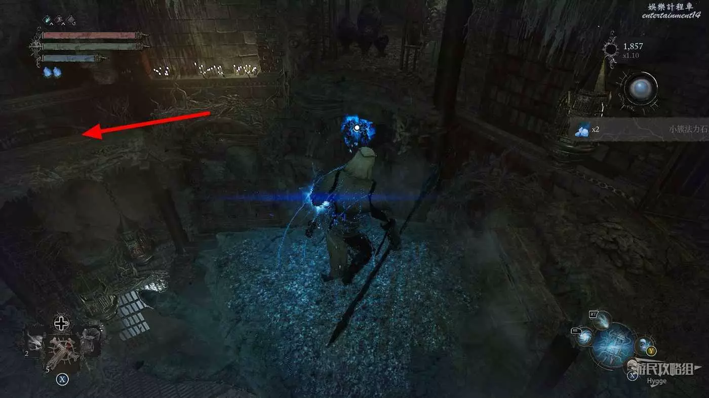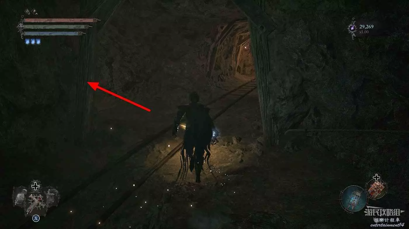 在上層進入影界,從右側平臺旁牆壁上的靈魂處可以獲得【麻木女巫莉蒂亞的影界之眼】。旁邊的道具是影界陷阱。