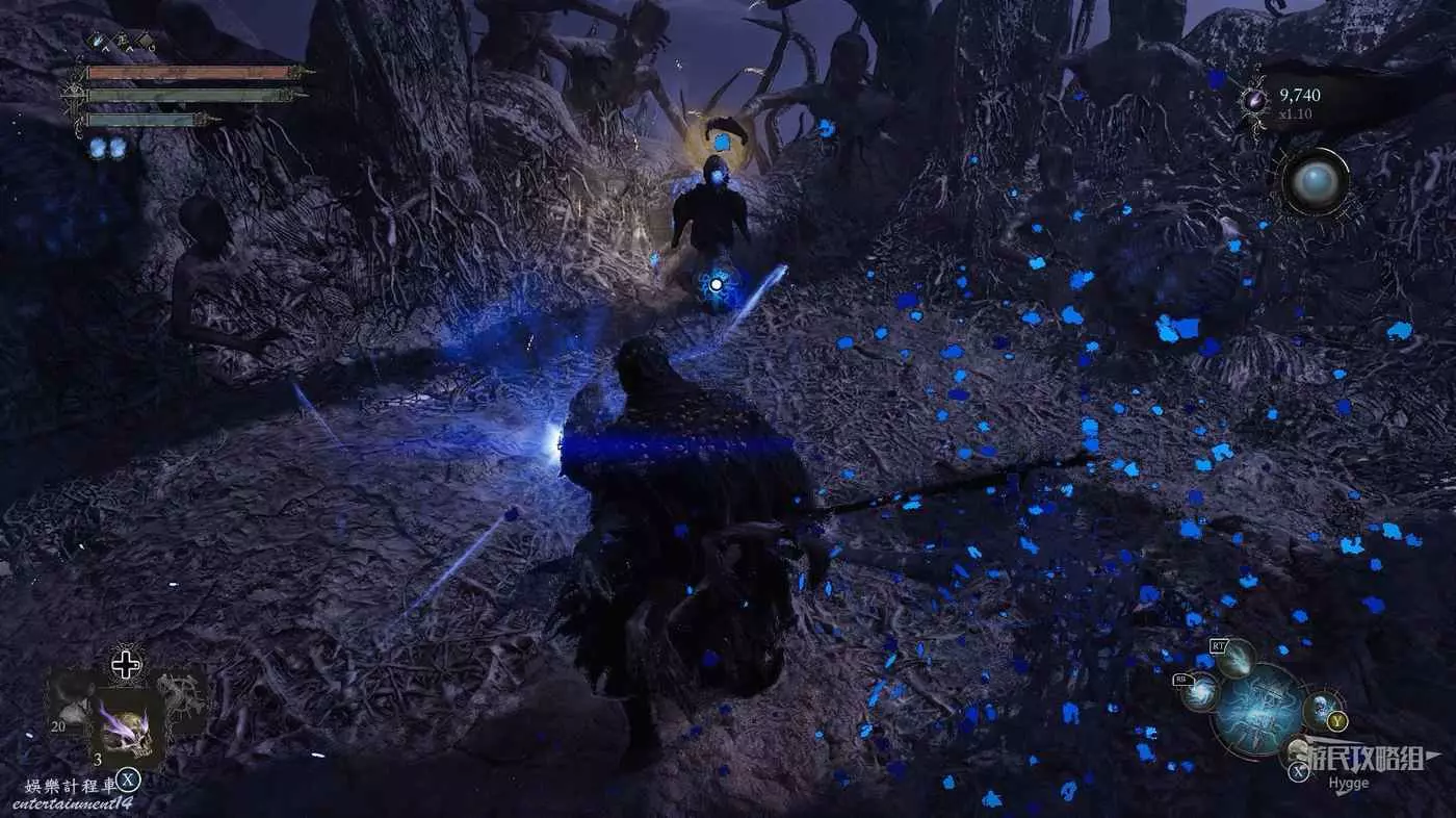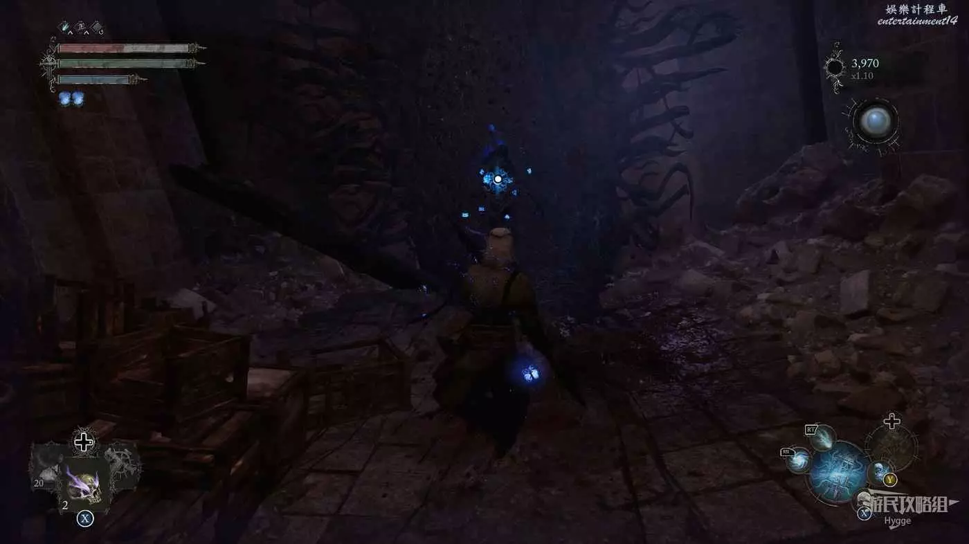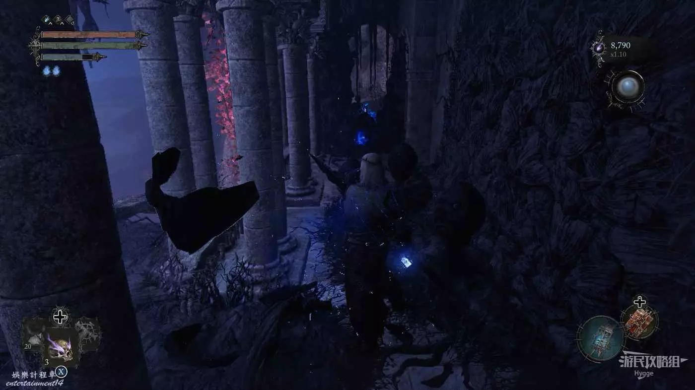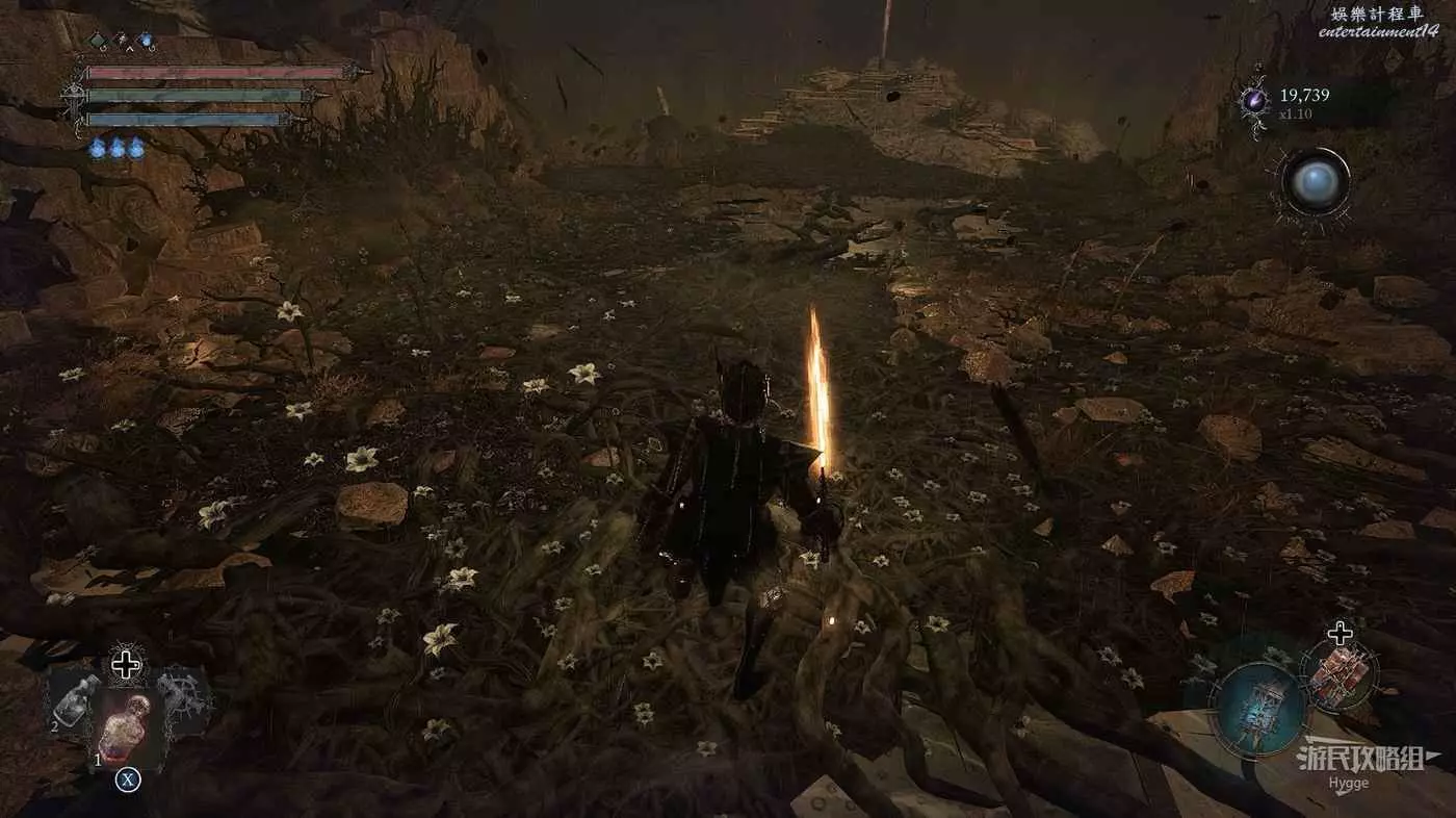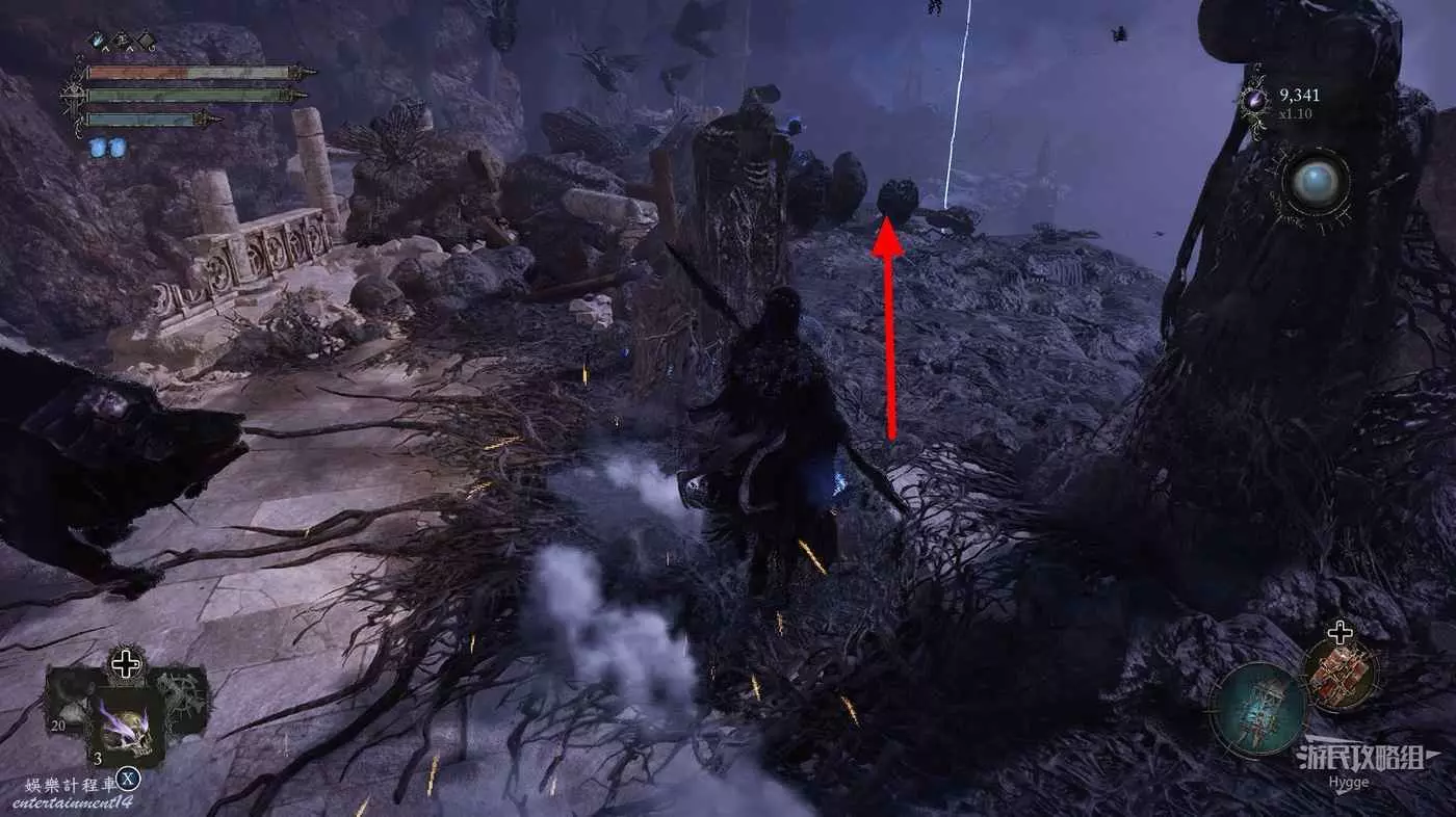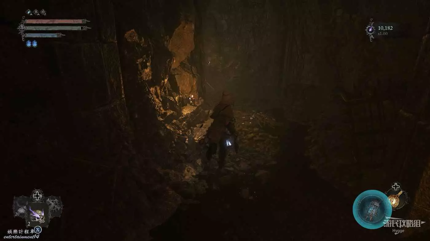 在上層進入影界,從右側平臺旁牆壁上的靈魂處可以獲得【麻木女巫莉蒂亞的影界之眼】。旁邊的道具是影界陷阱。