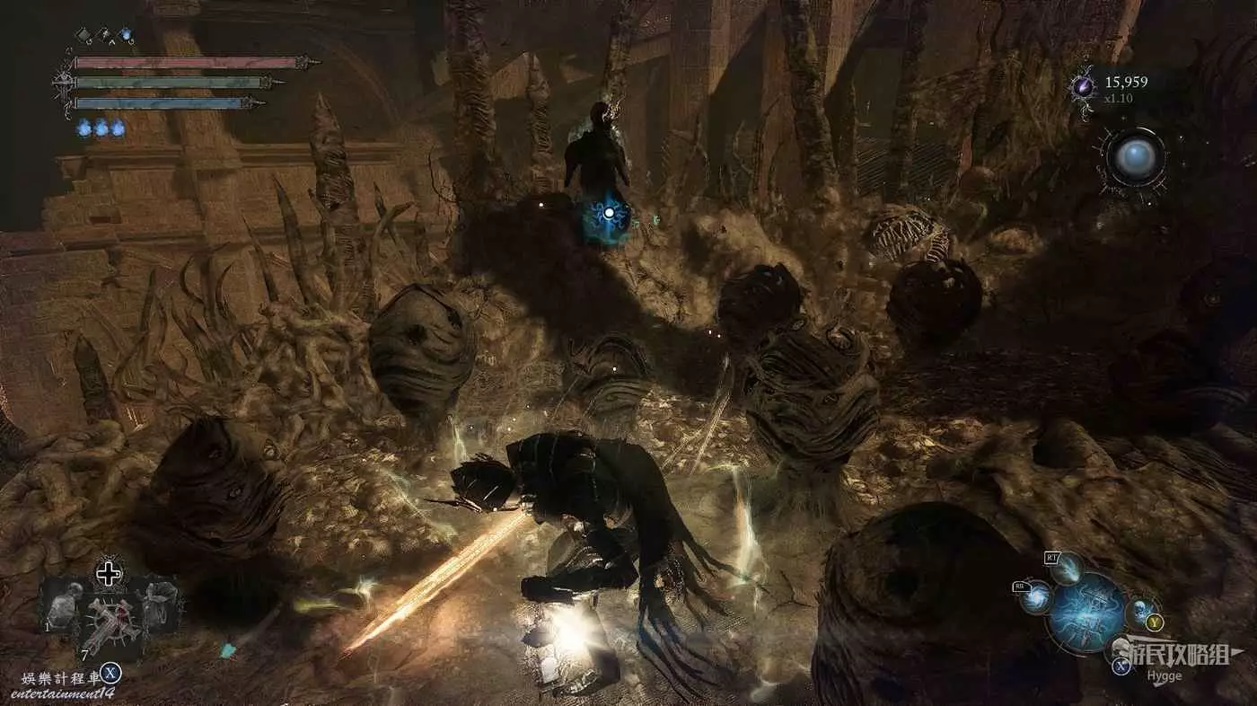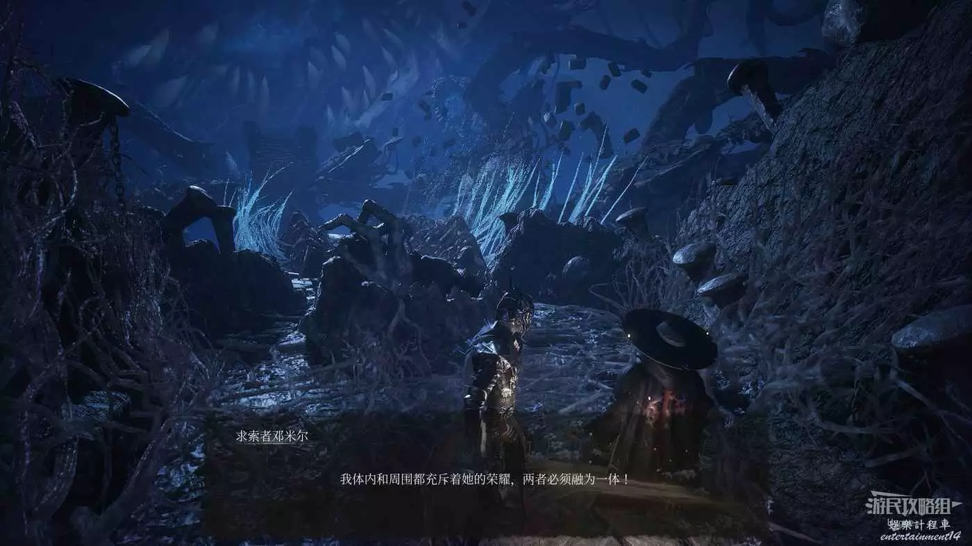 來到和誓約者德夫拉戰鬥的場地,在祭壇上可以拿到鄧米爾的吊墜和戒指。然後在旁邊的祭壇上放入從莫爾胡處購買的【影界殘渣團】,進入新的地圖【母親的呢喃】。
