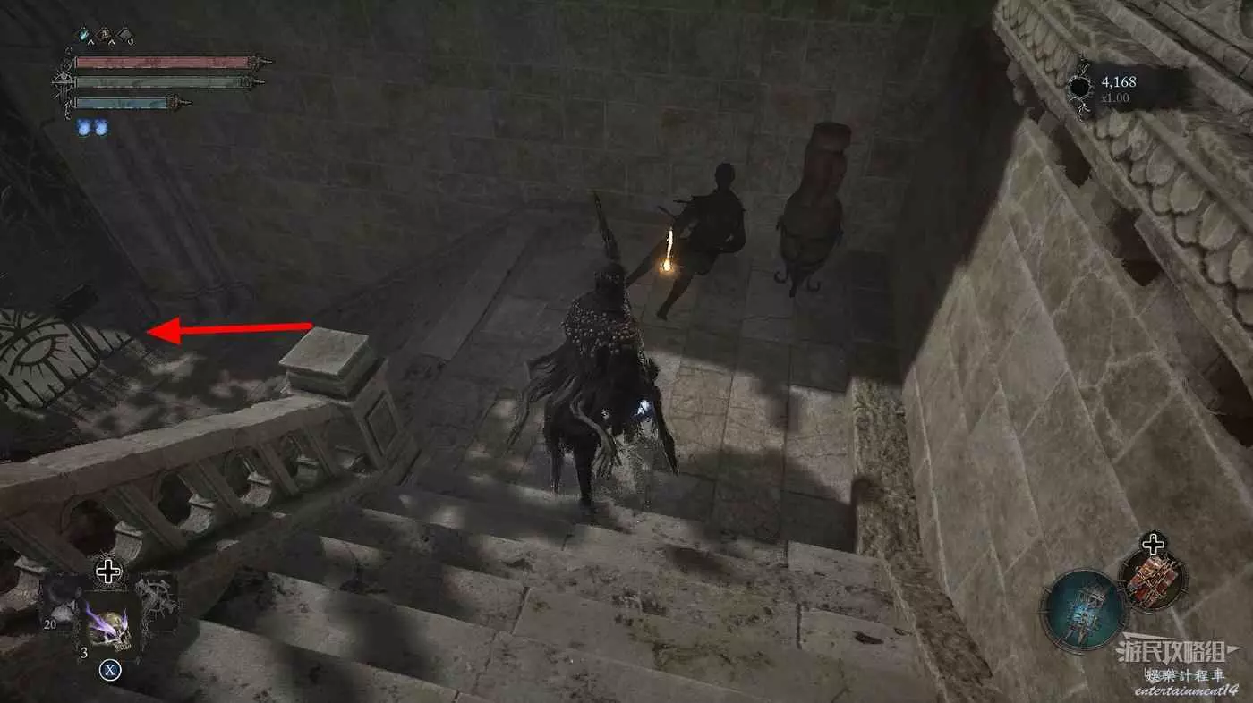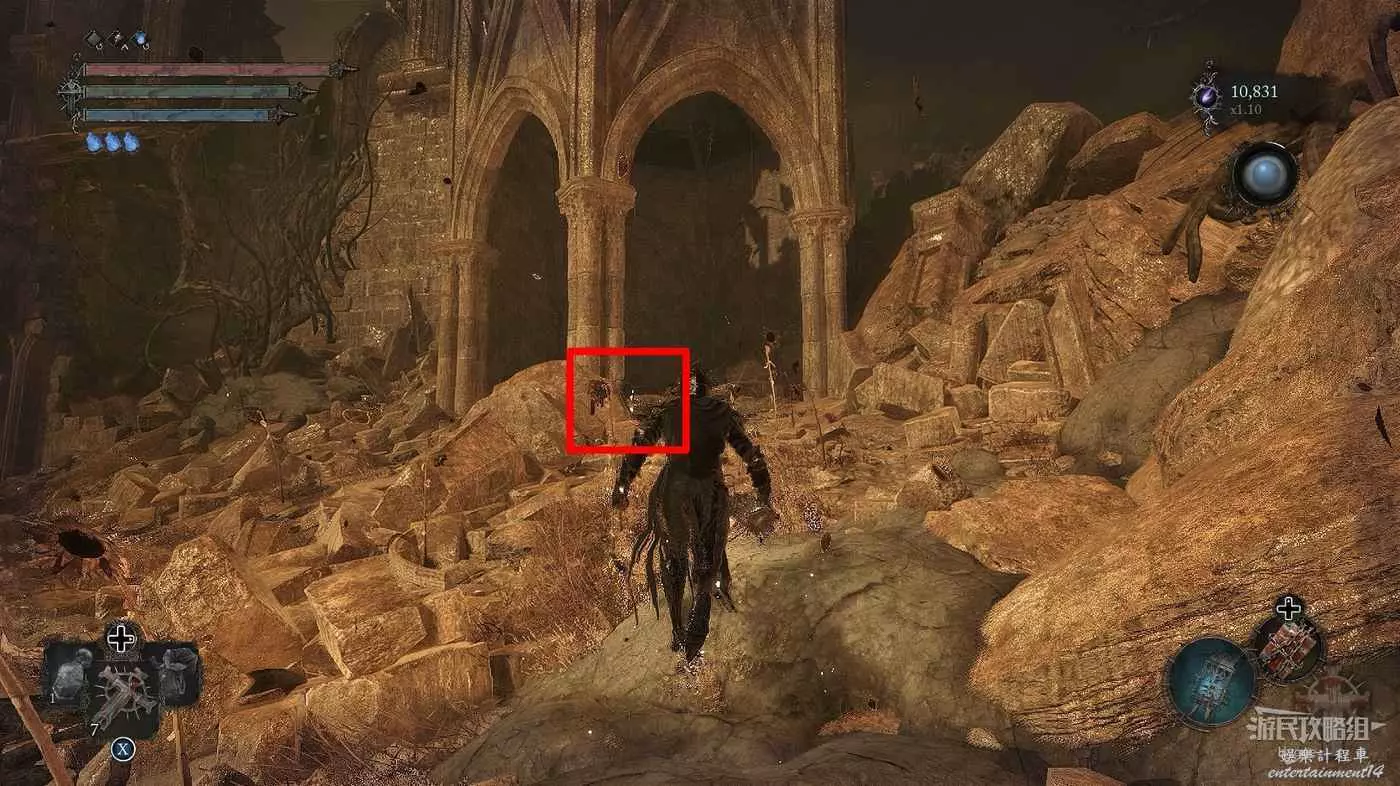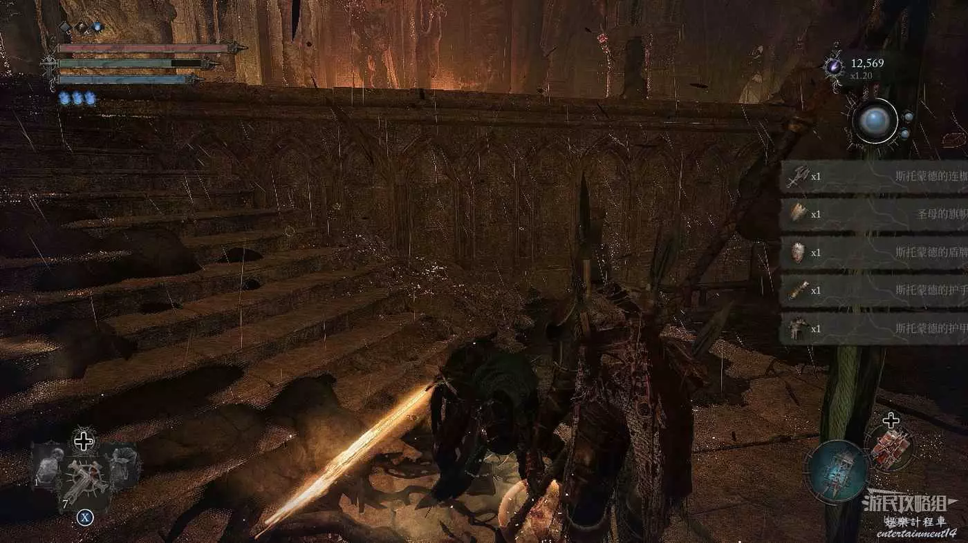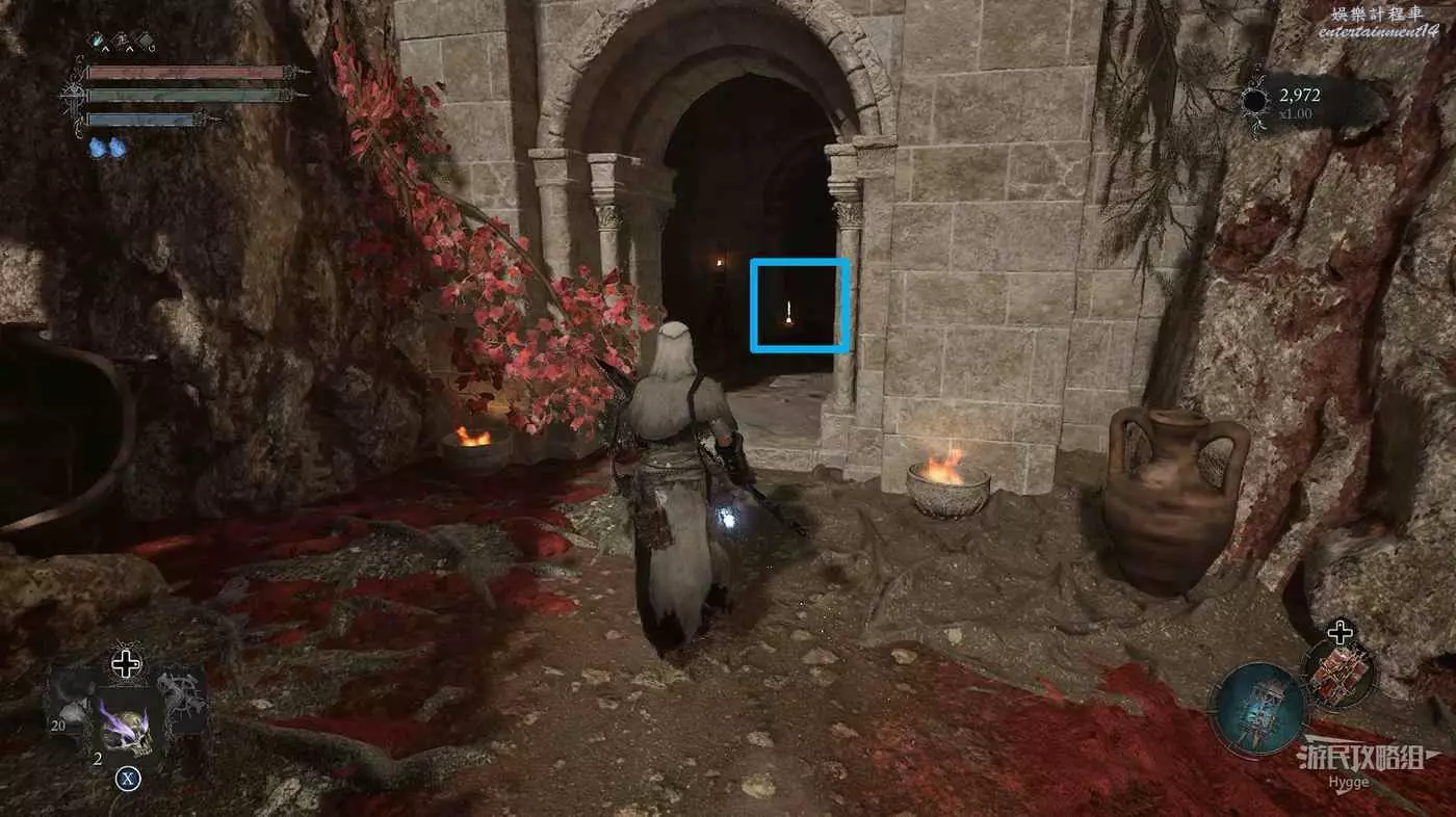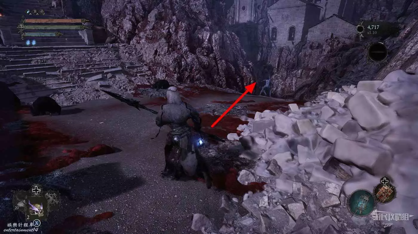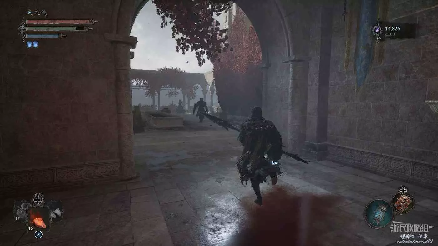 在平臺邊緣的屍體上拿到【布拉米斯城堡地圖】,隨後跳到下層的樓梯上進入城堡內堡。