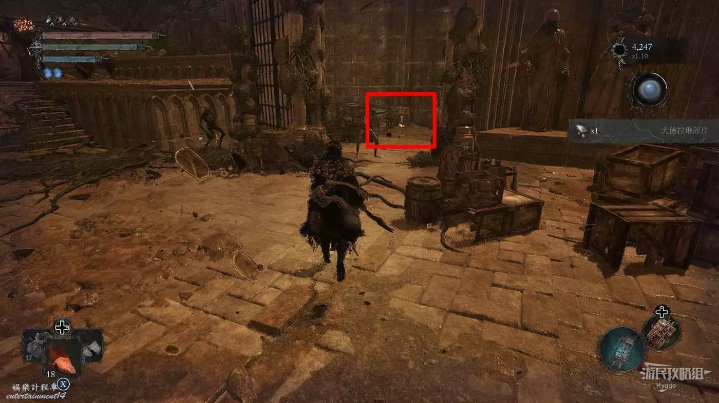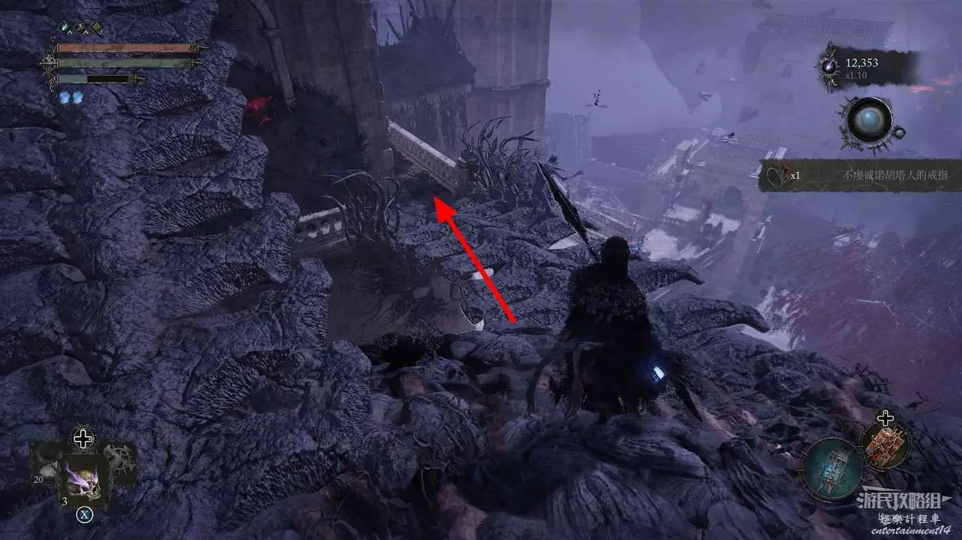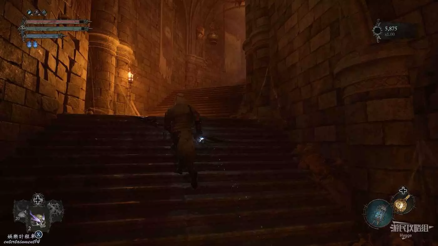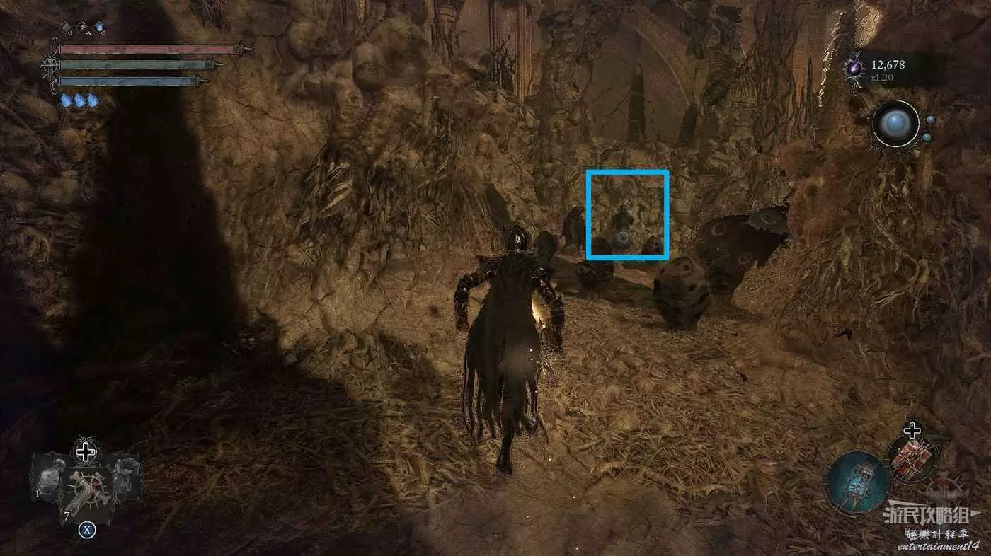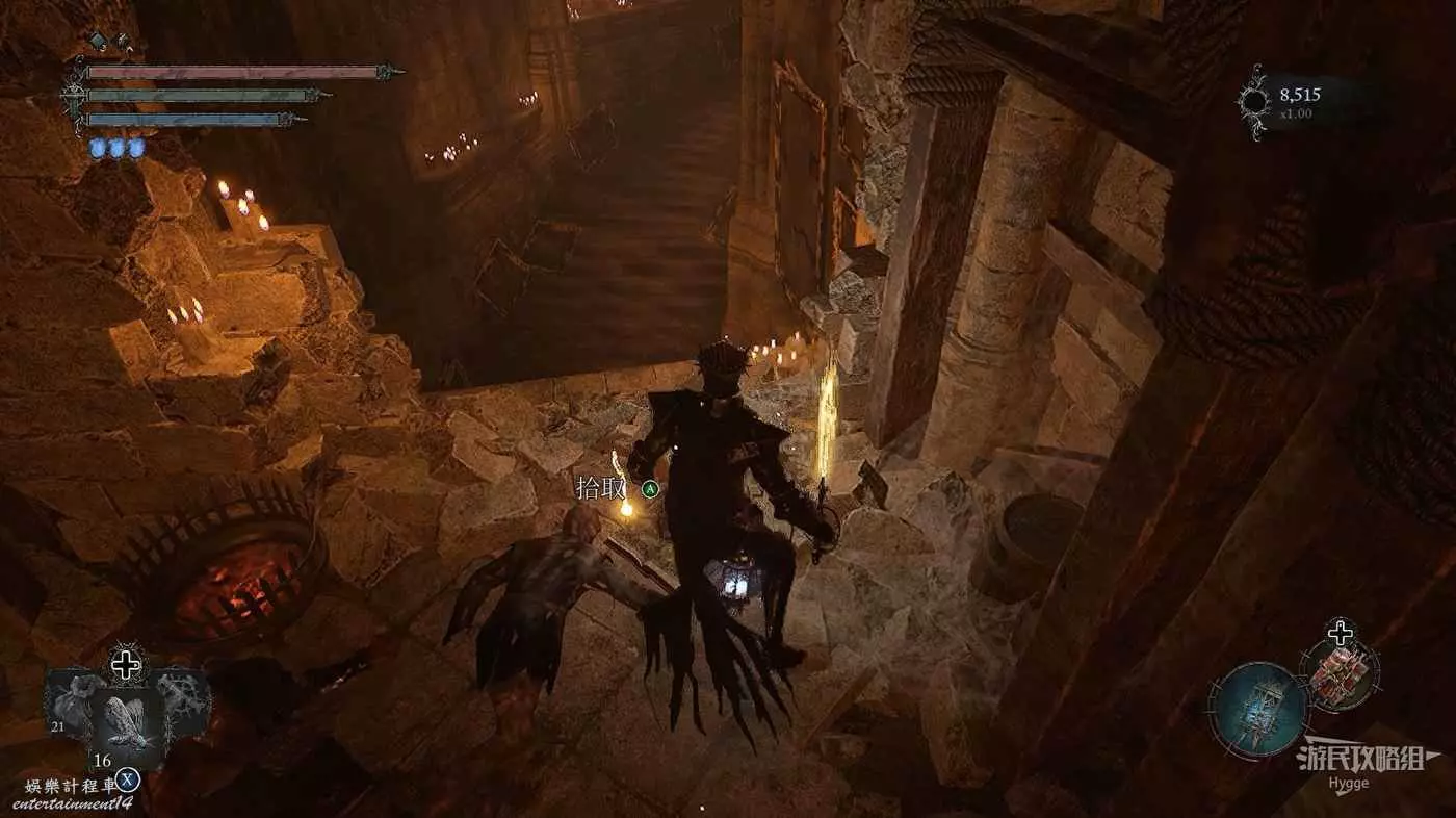 在平臺邊緣的屍體上拿到【布拉米斯城堡地圖】,隨後跳到下層的樓梯上進入城堡內堡。