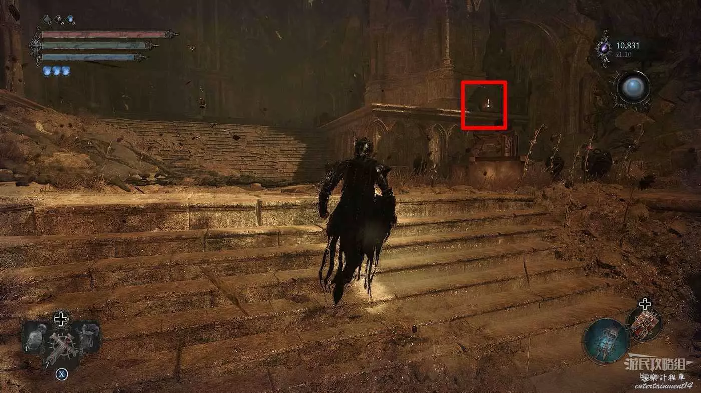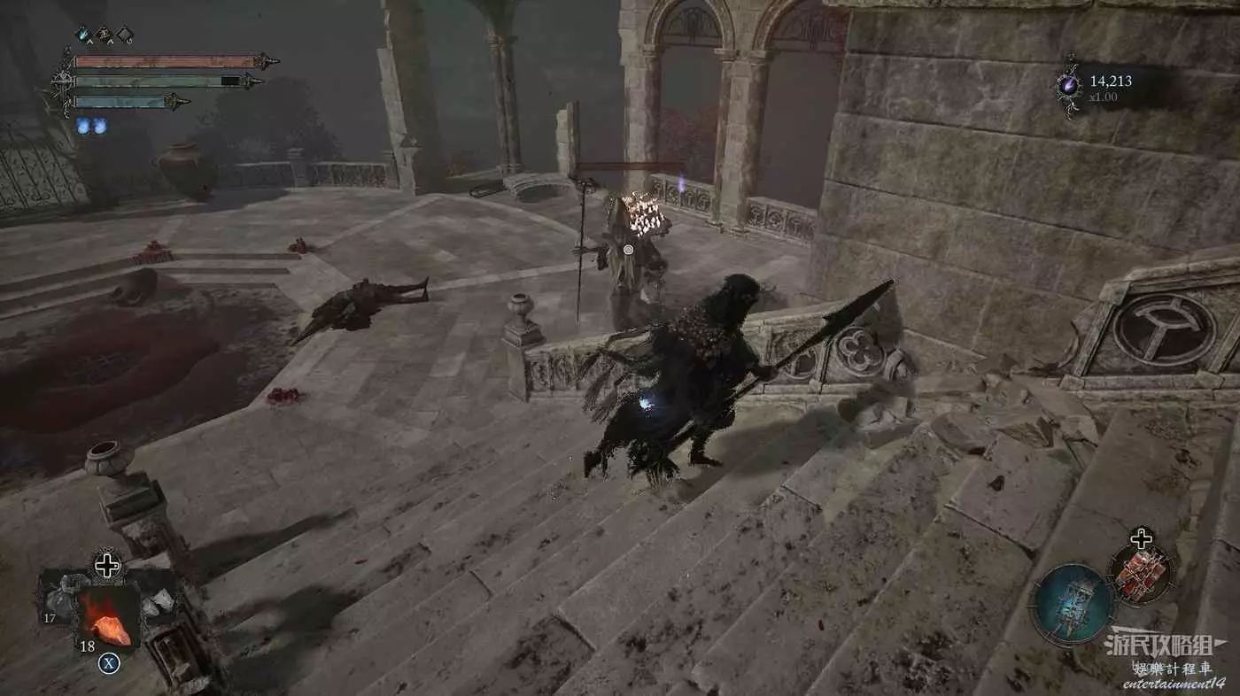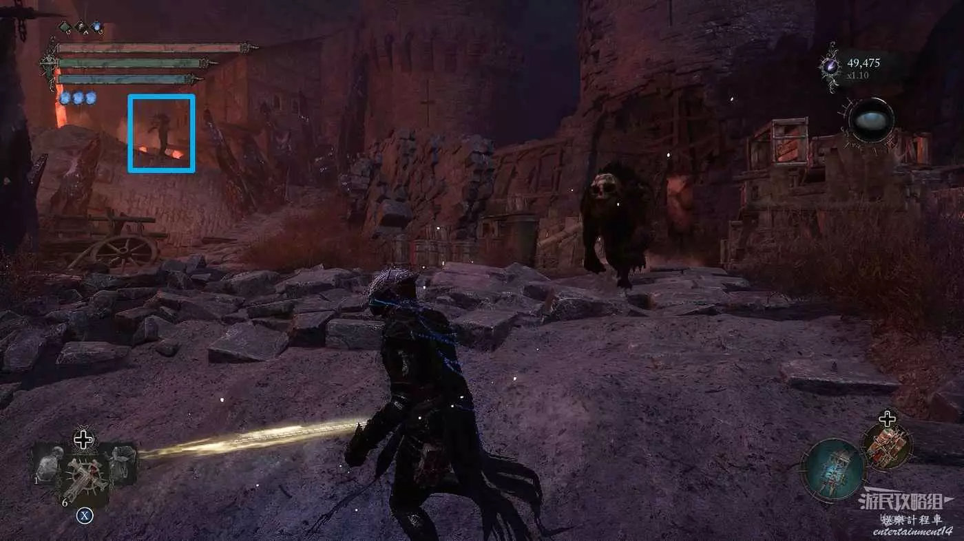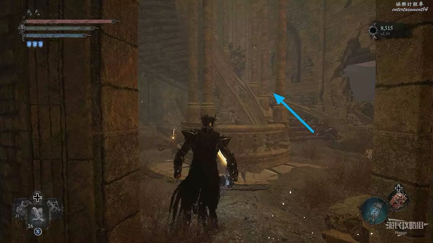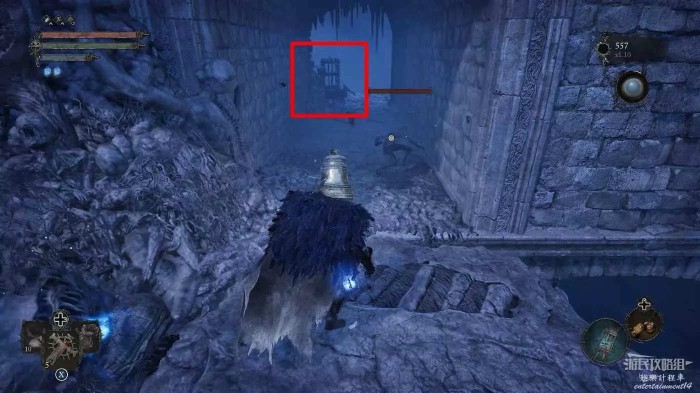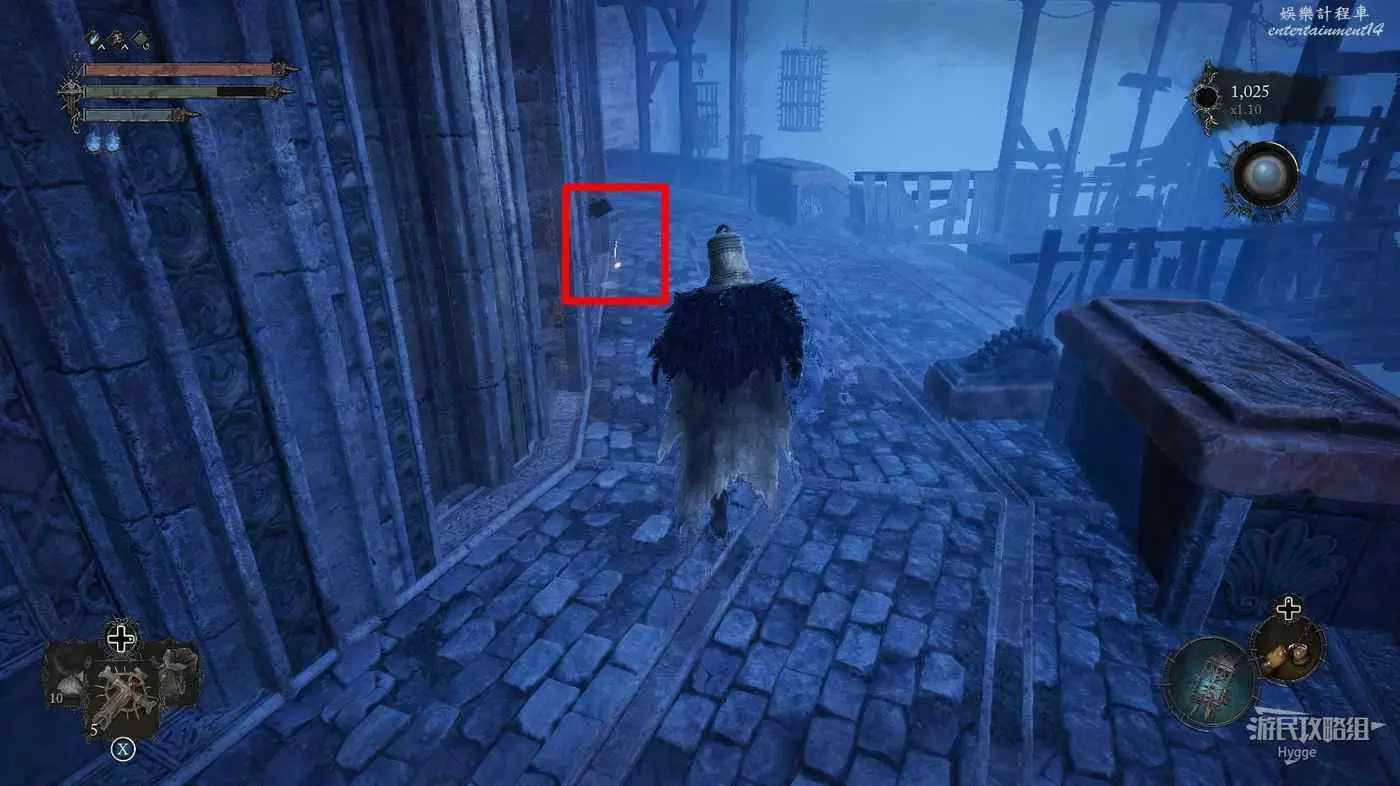 在平臺邊緣的屍體上拿到【布拉米斯城堡地圖】,隨後跳到下層的樓梯上進入城堡內堡。
