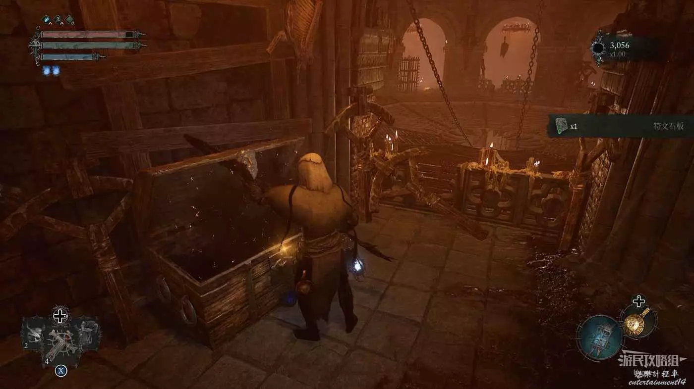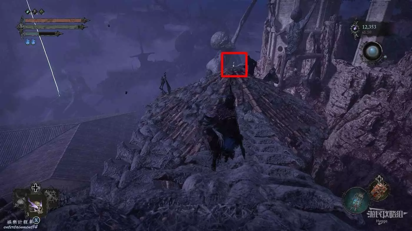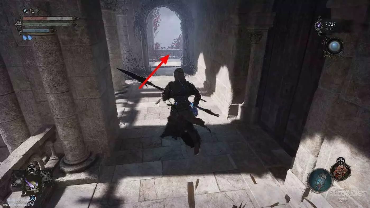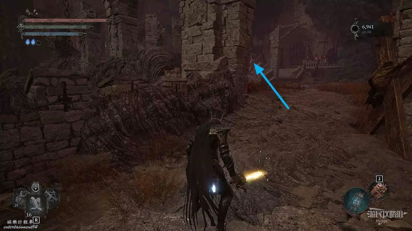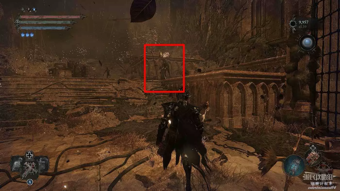 在平臺邊緣的屍體上拿到【布拉米斯城堡地圖】,隨後跳到下層的樓梯上進入城堡內堡。