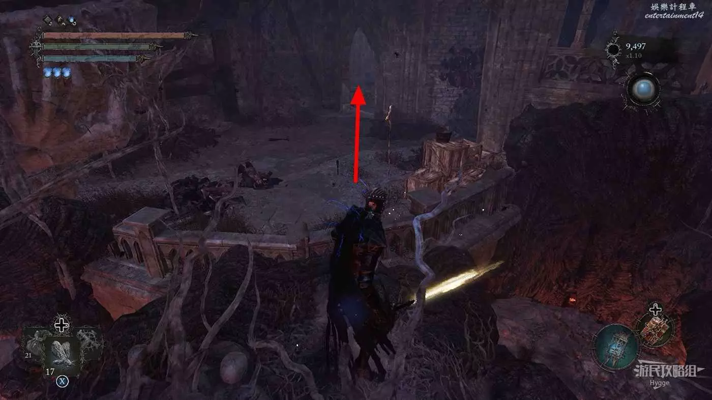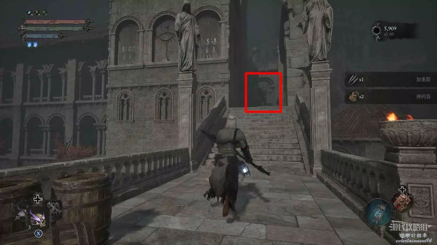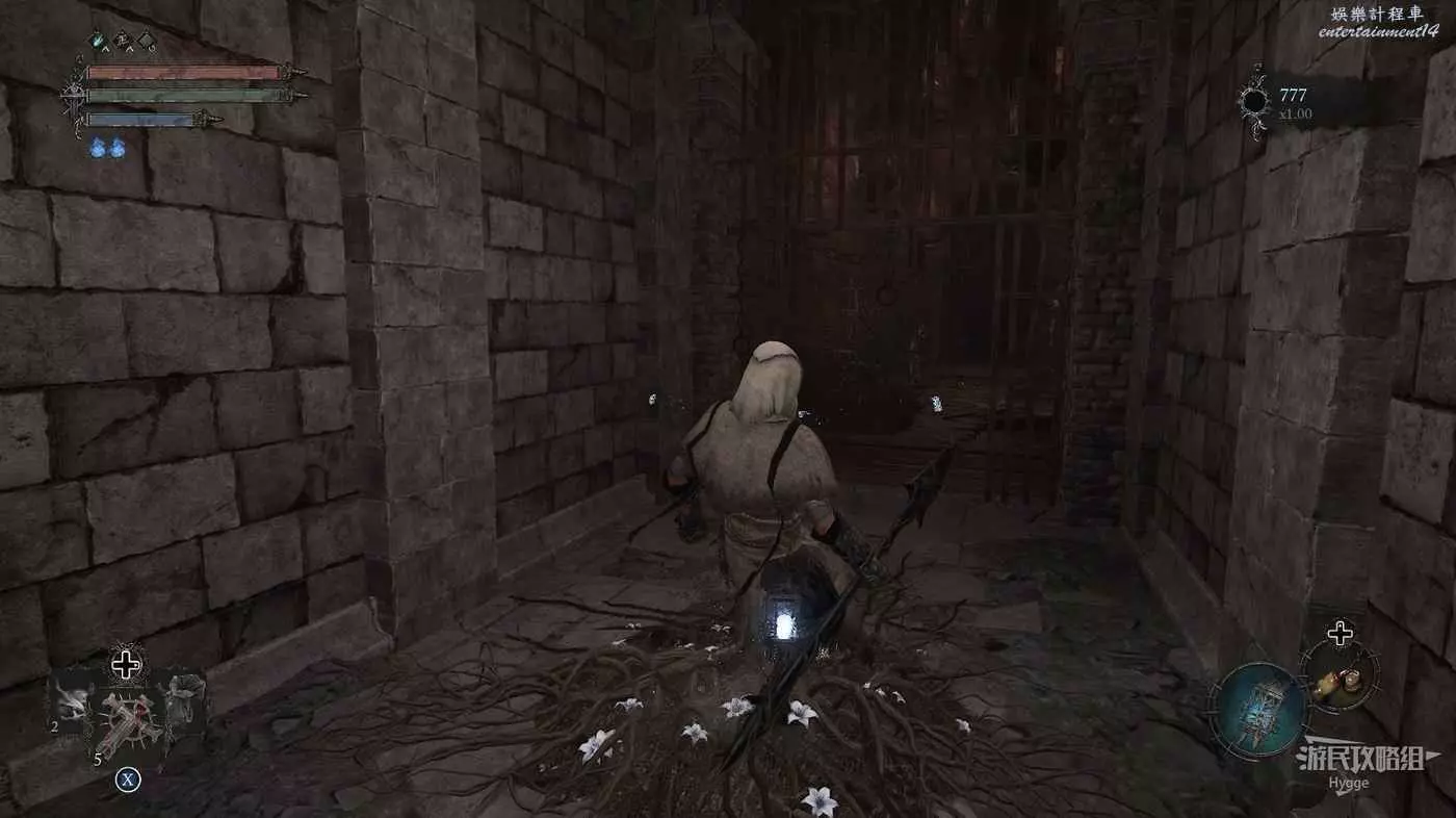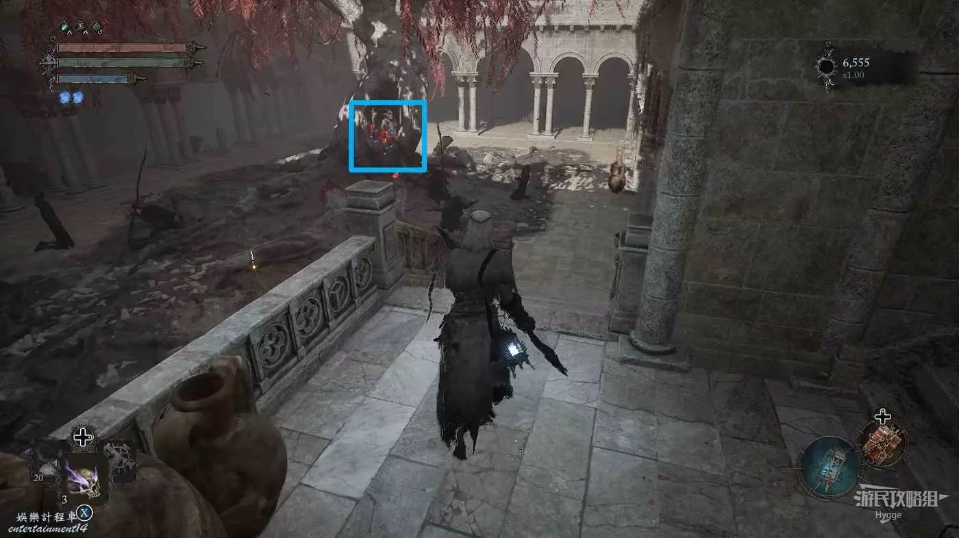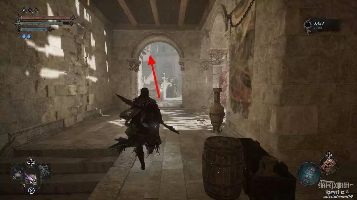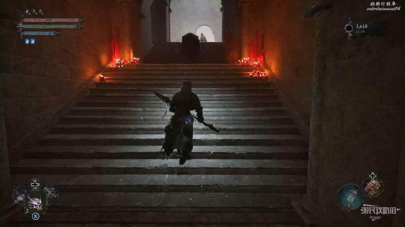 在平臺邊緣的屍體上拿到【布拉米斯城堡地圖】,隨後跳到下層的樓梯上進入城堡內堡。