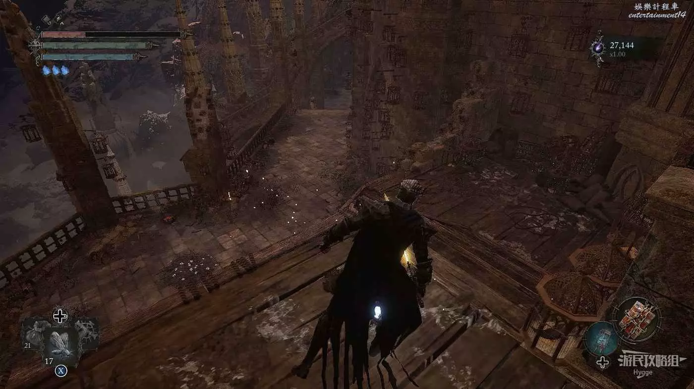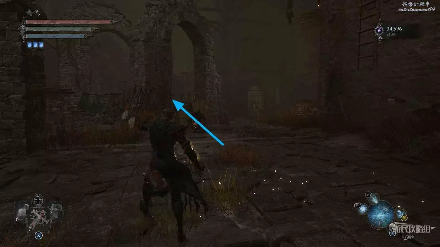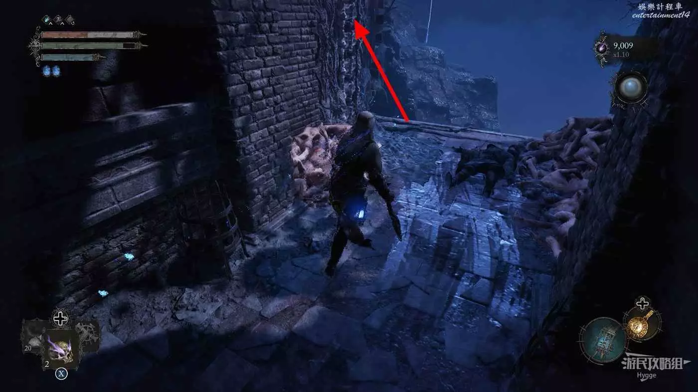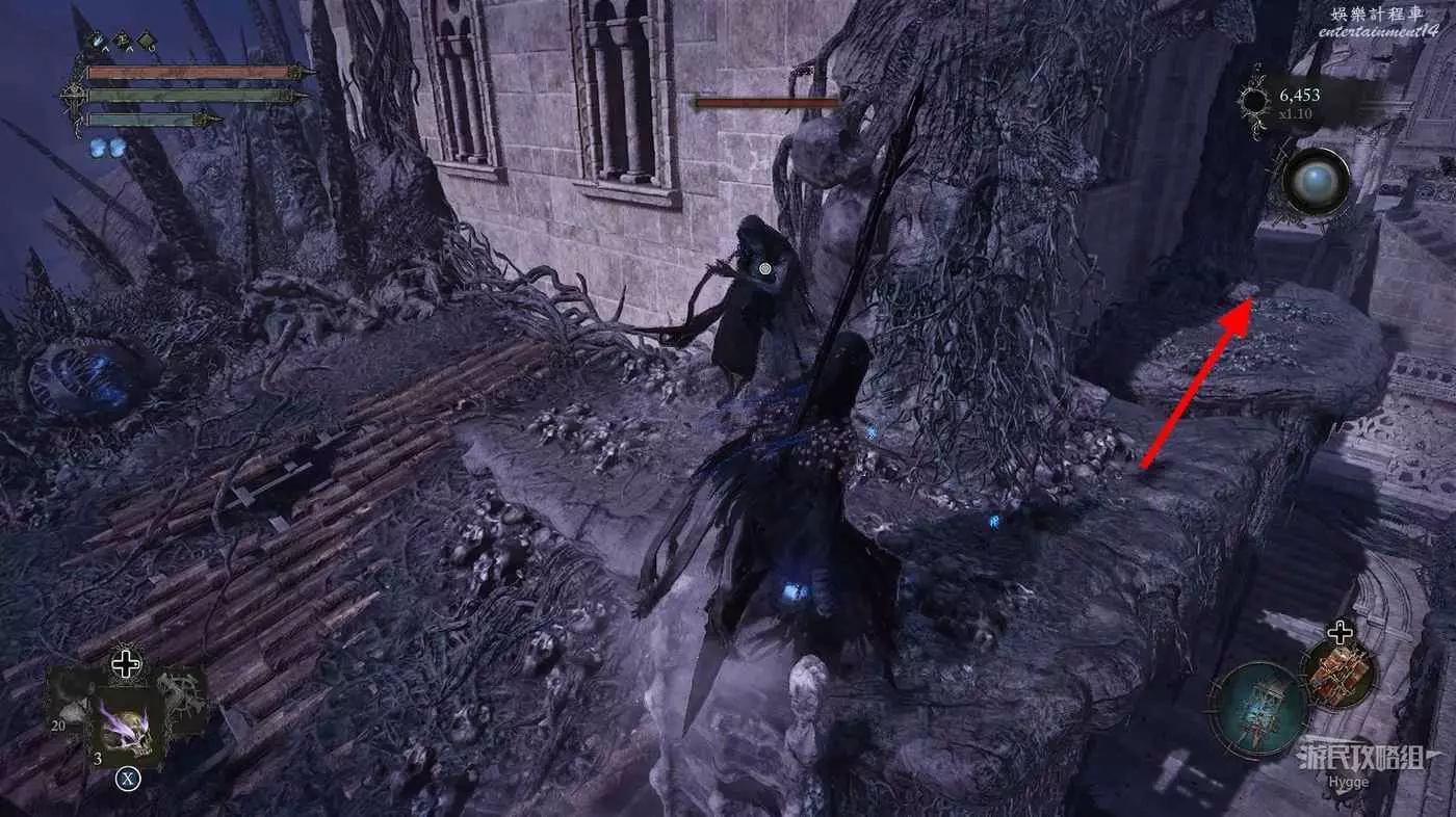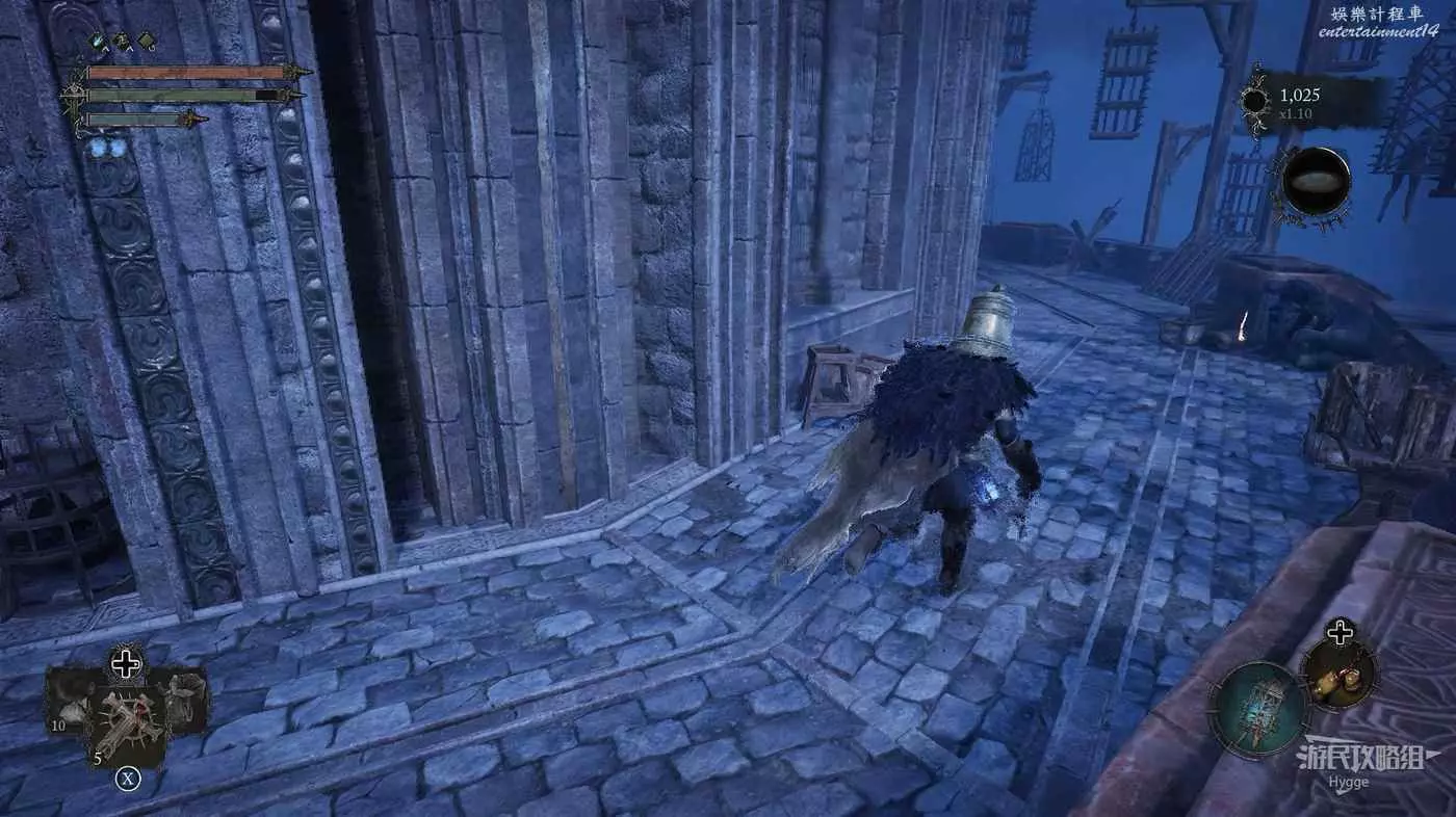 在平臺邊緣的屍體上拿到【布拉米斯城堡地圖】,隨後跳到下層的樓梯上進入城堡內堡。