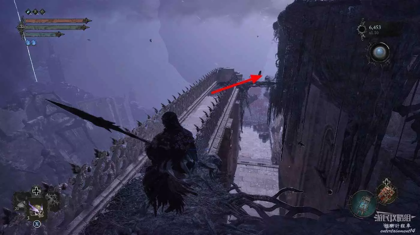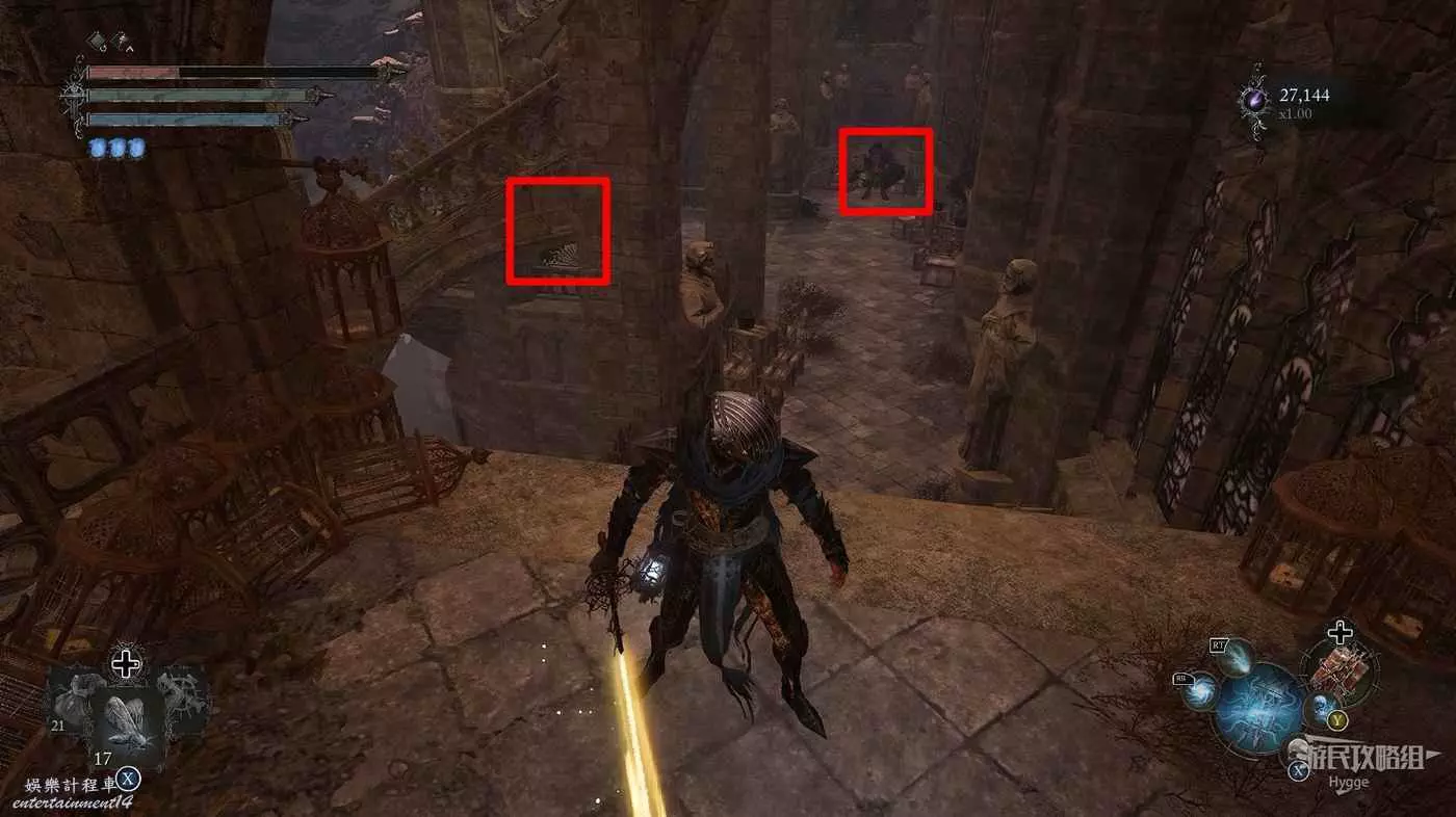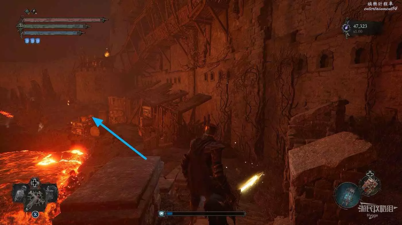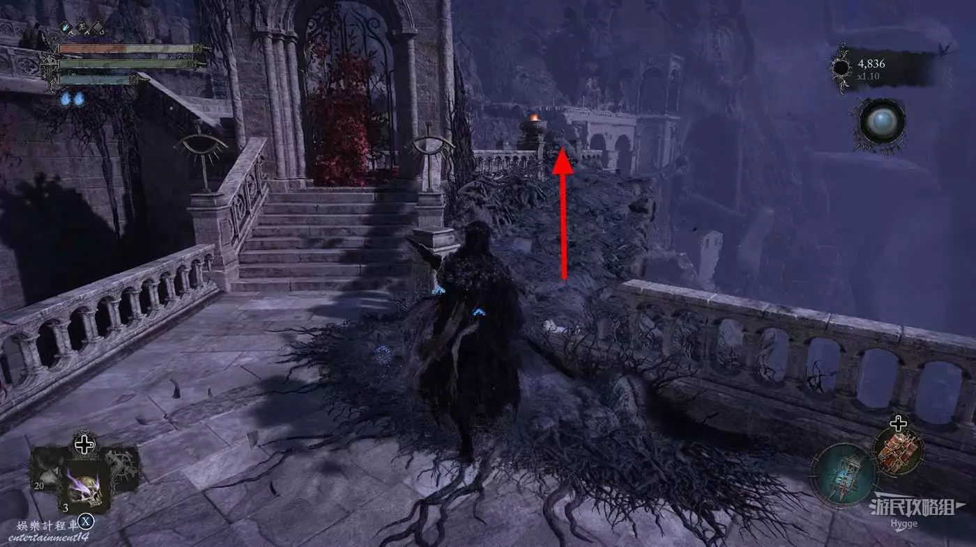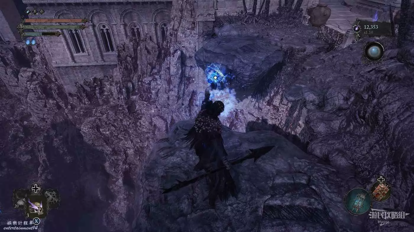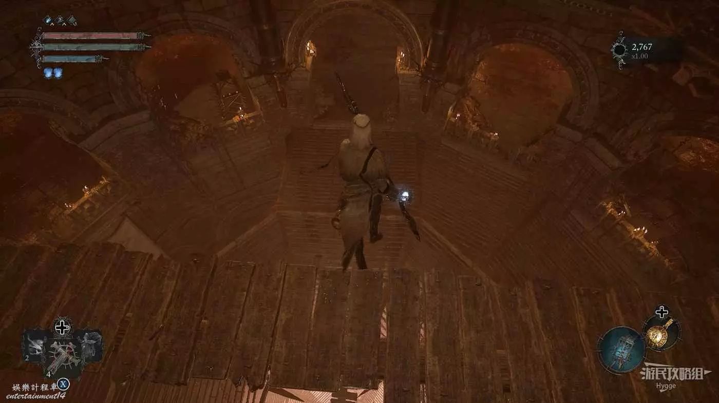 在平臺邊緣的屍體上拿到【布拉米斯城堡地圖】,隨後跳到下層的樓梯上進入城堡內堡。