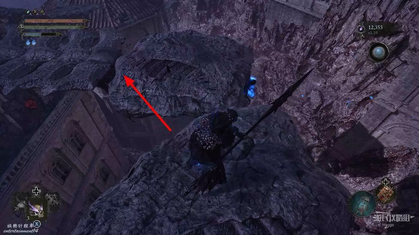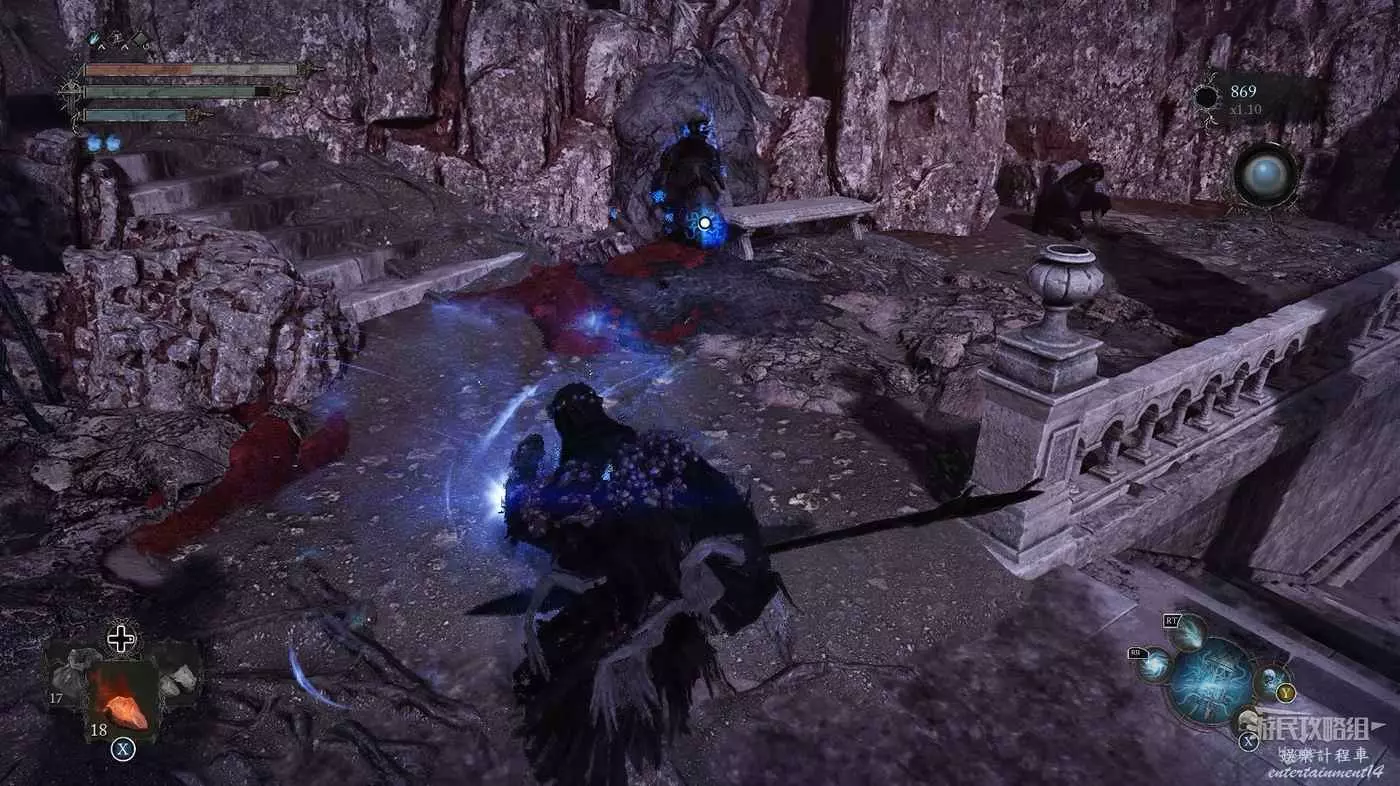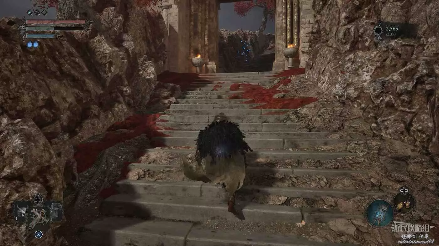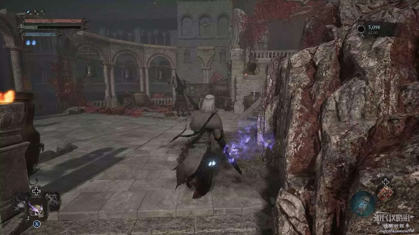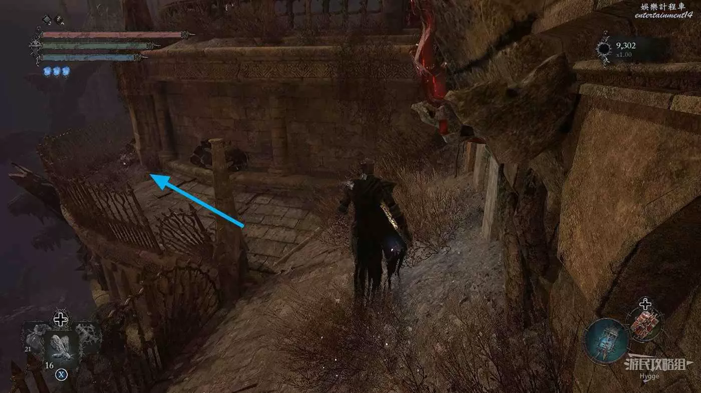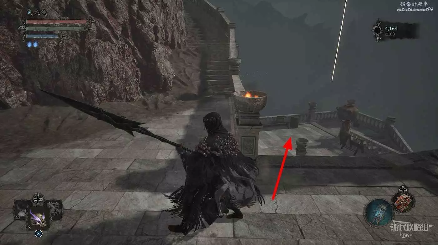 在平臺邊緣的屍體上拿到【布拉米斯城堡地圖】,隨後跳到下層的樓梯上進入城堡內堡。