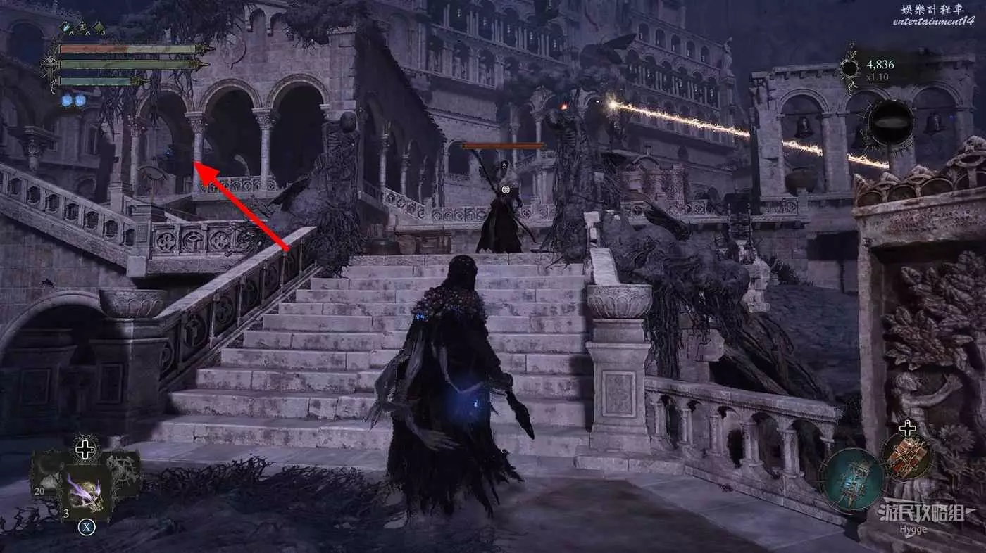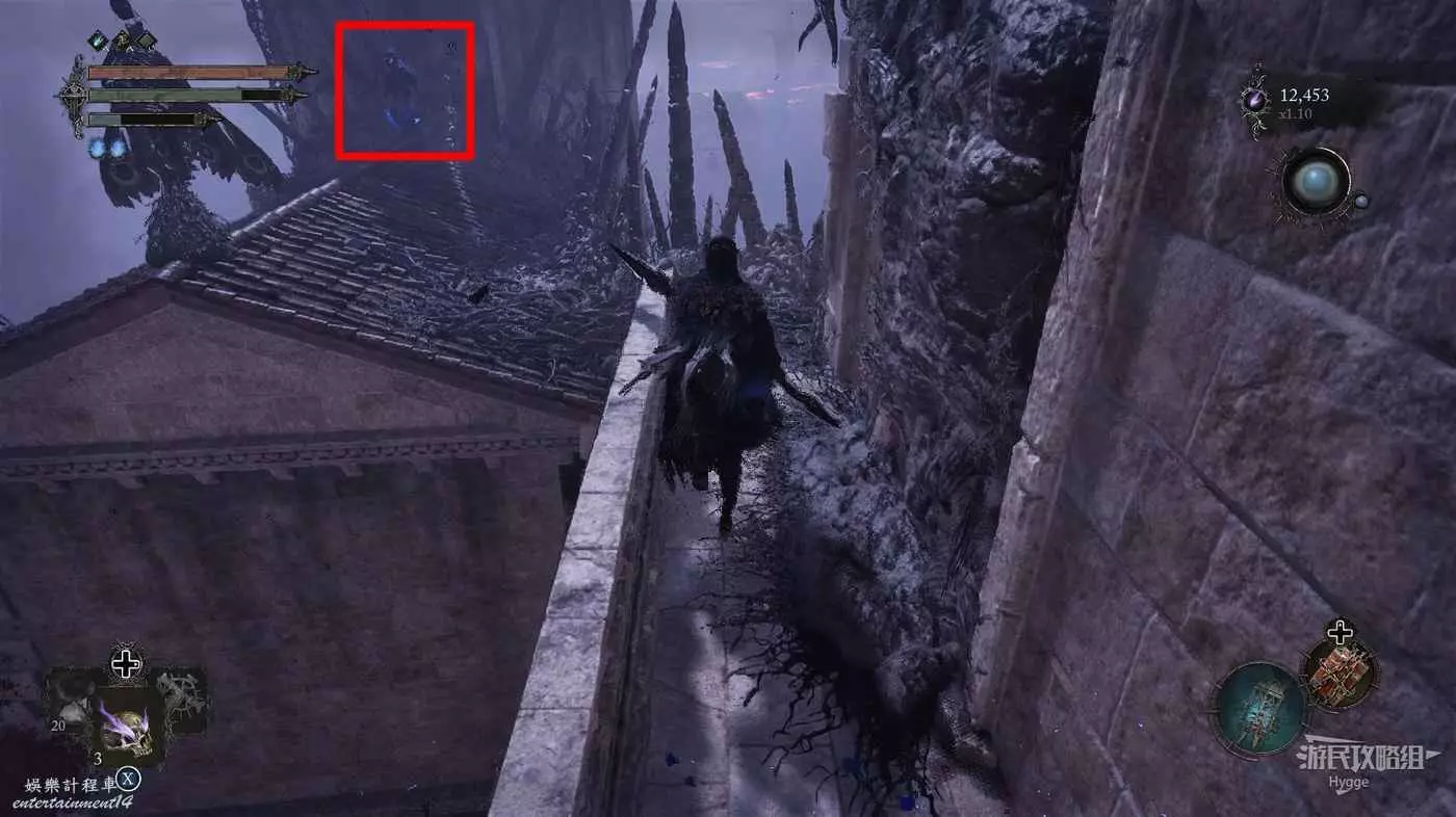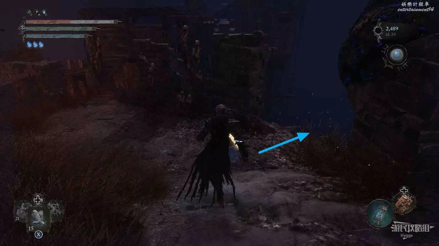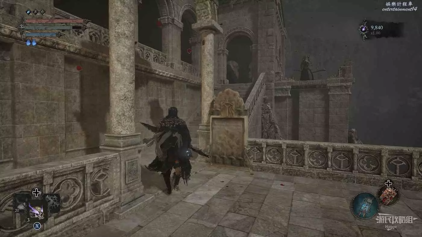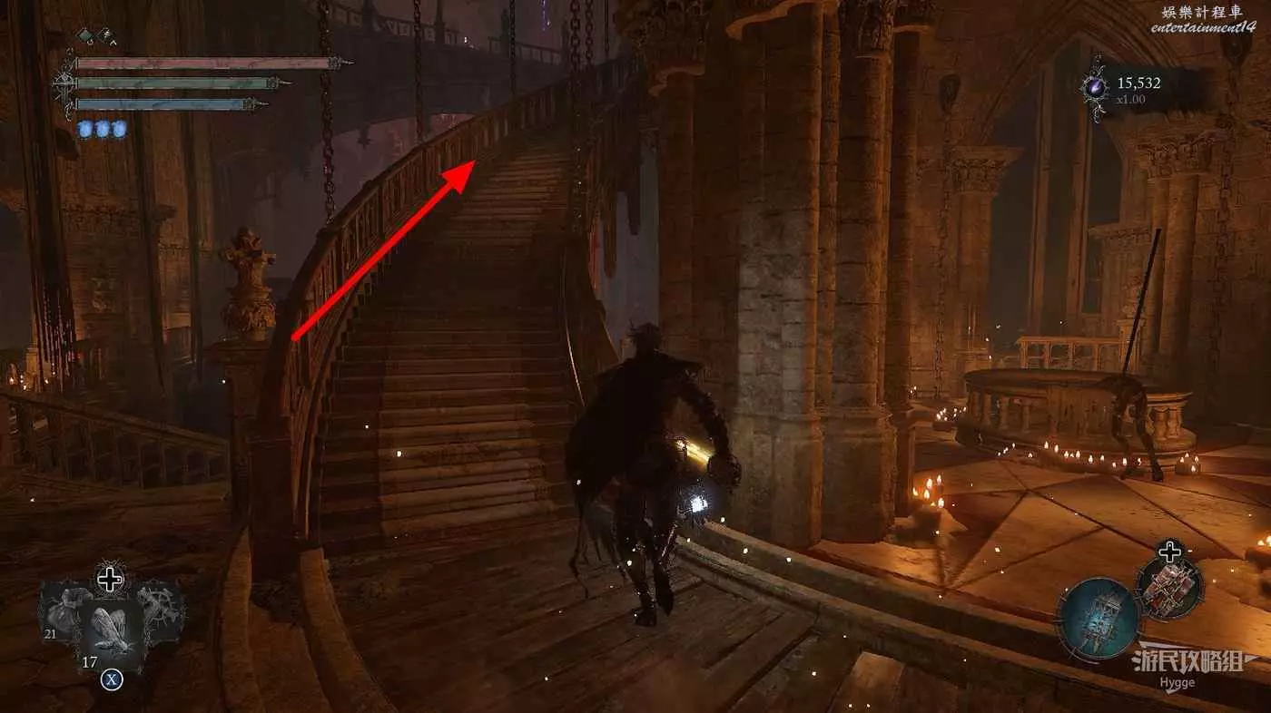 在平臺邊緣的屍體上拿到【布拉米斯城堡地圖】,隨後跳到下層的樓梯上進入城堡內堡。