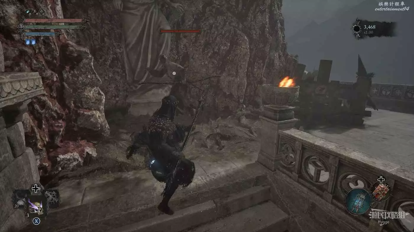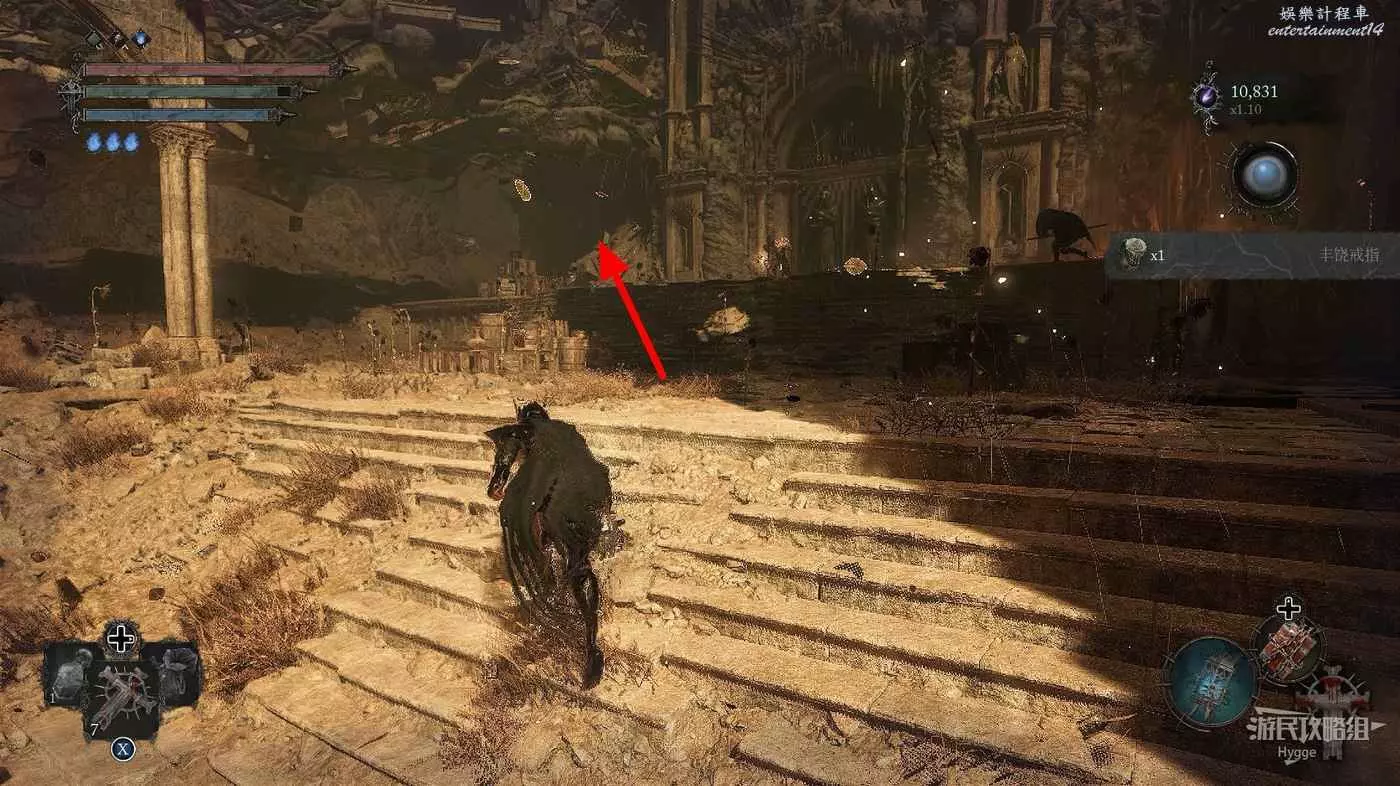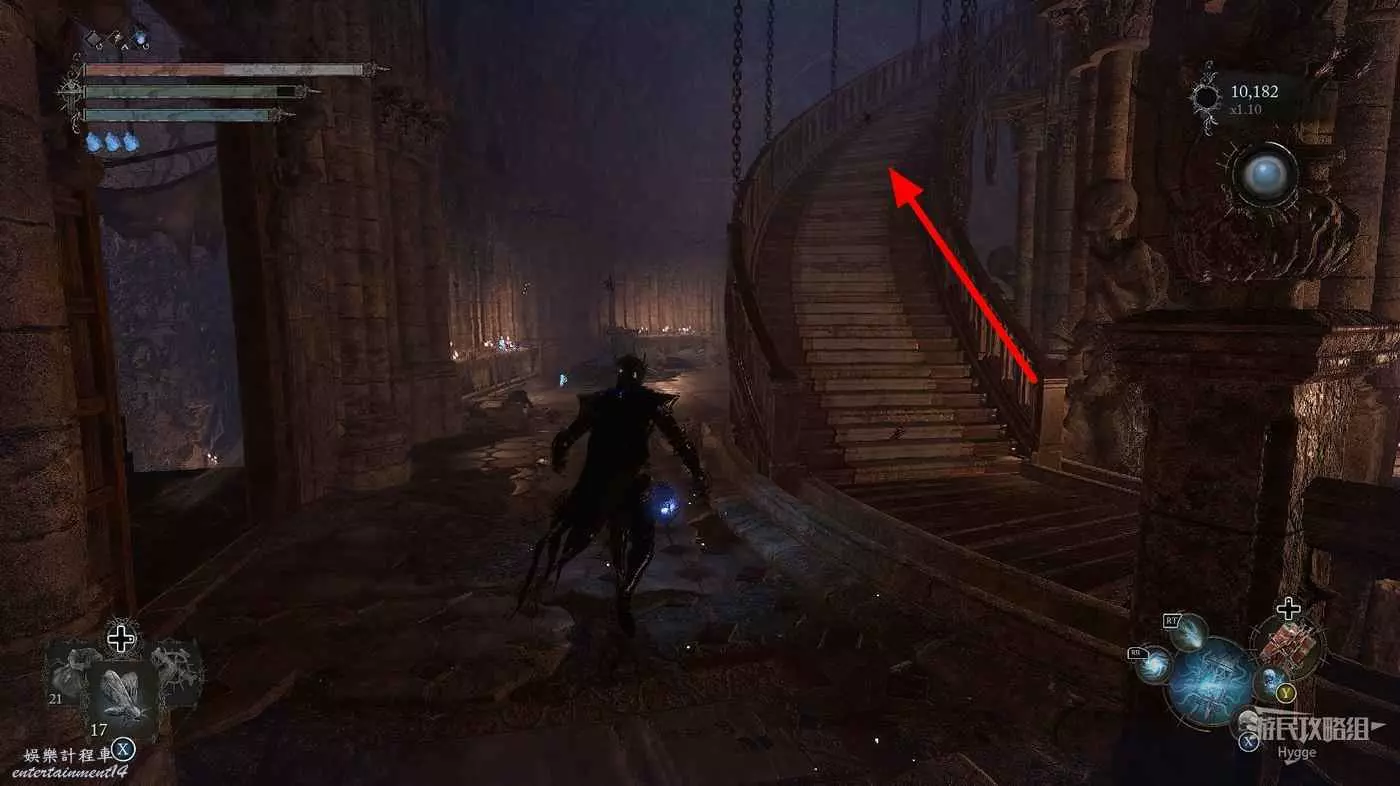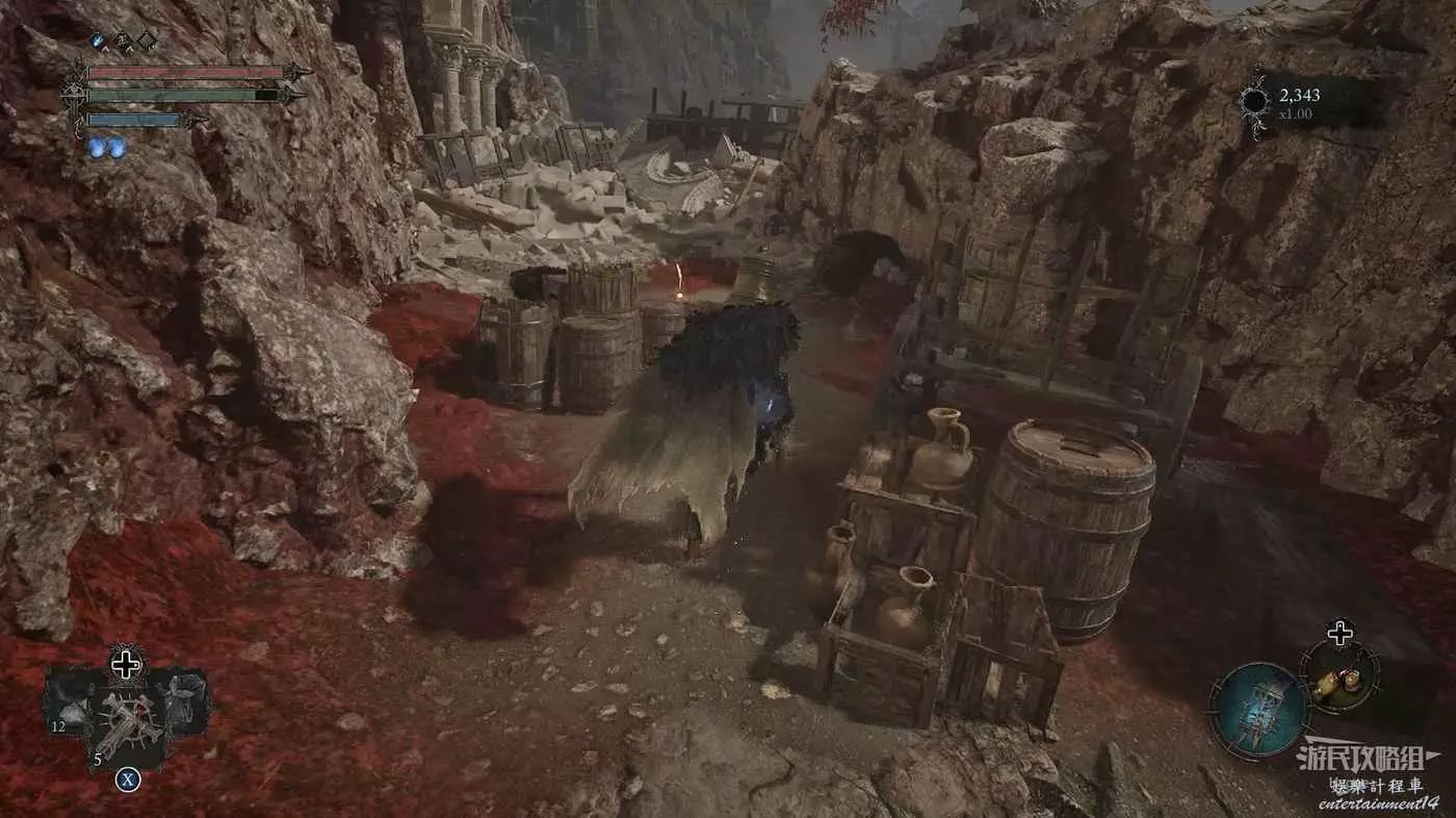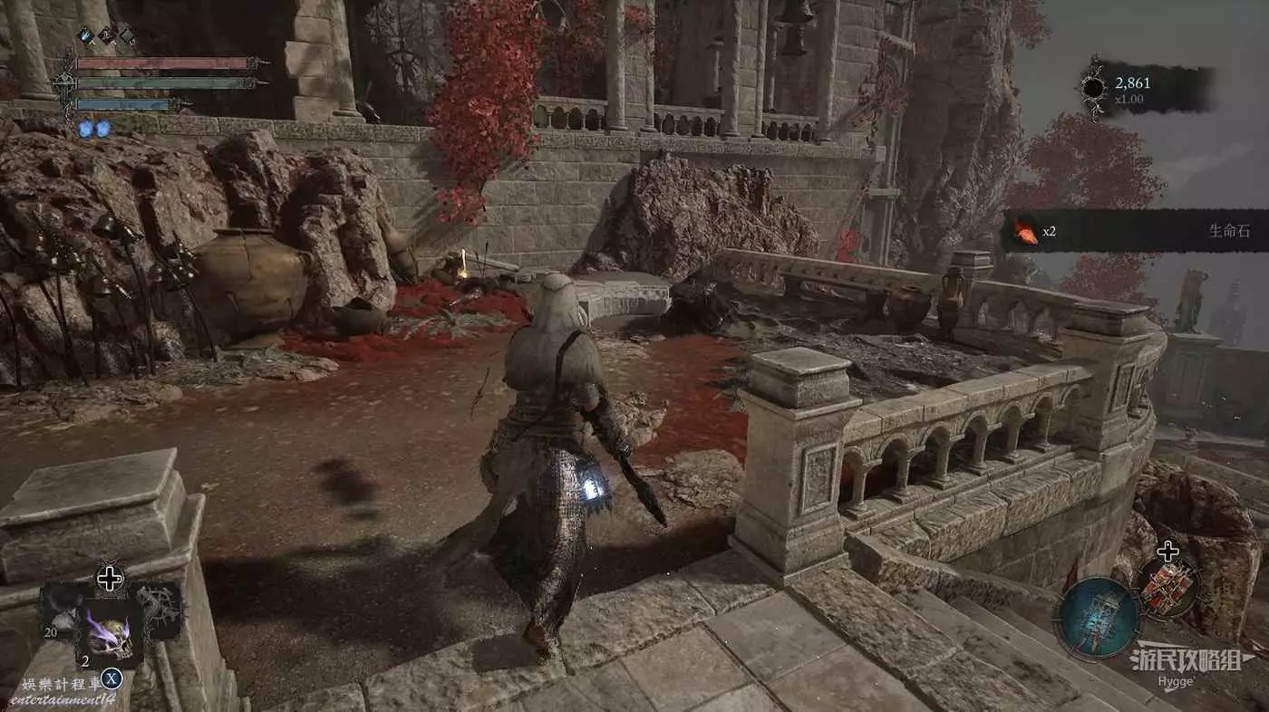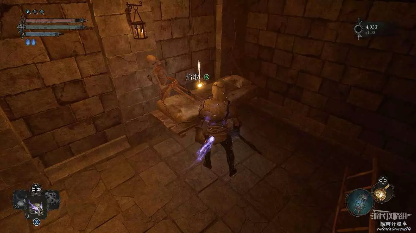 在平臺邊緣的屍體上拿到【布拉米斯城堡地圖】,隨後跳到下層的樓梯上進入城堡內堡。