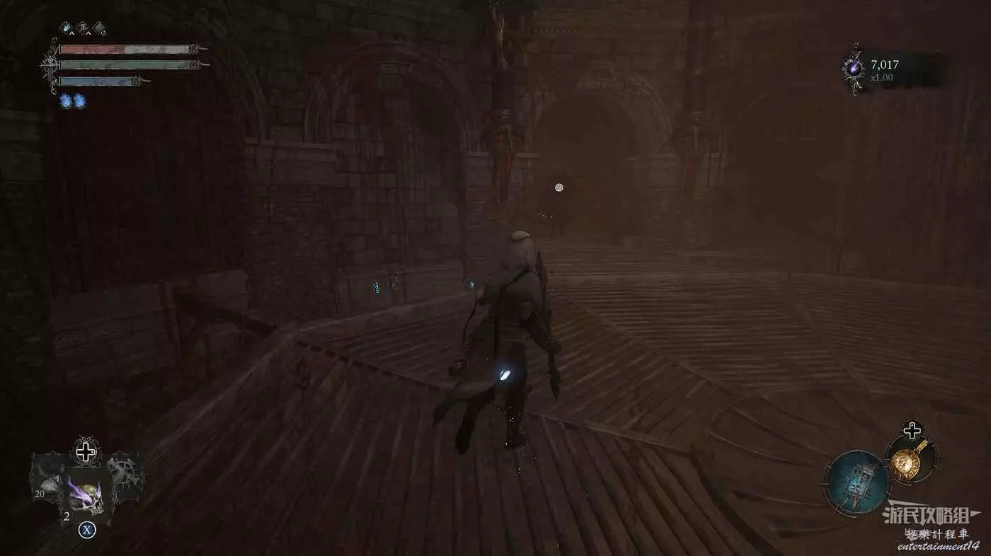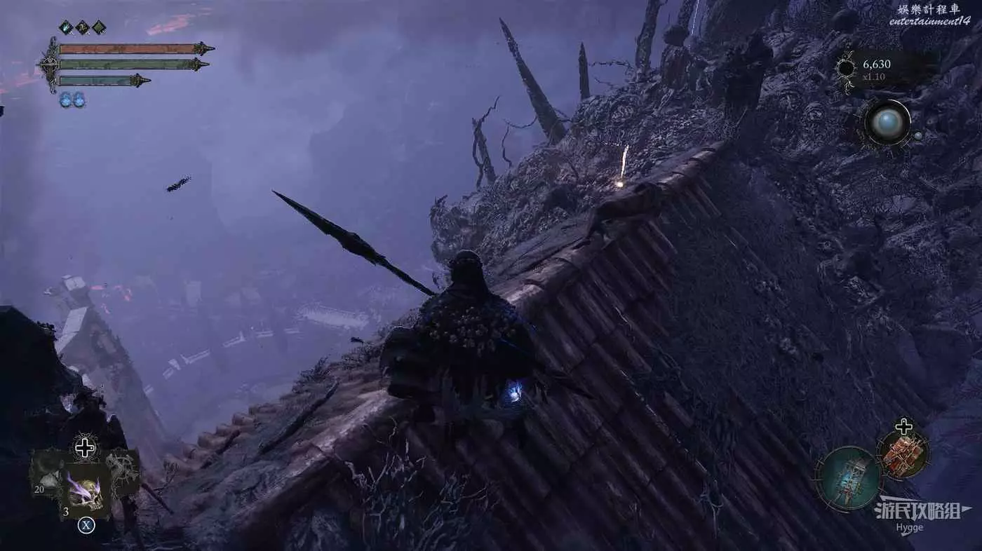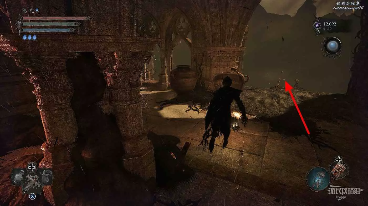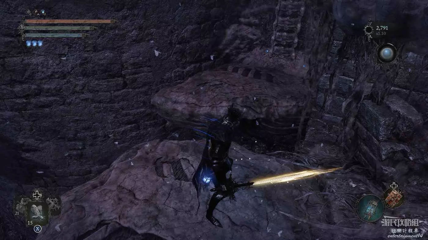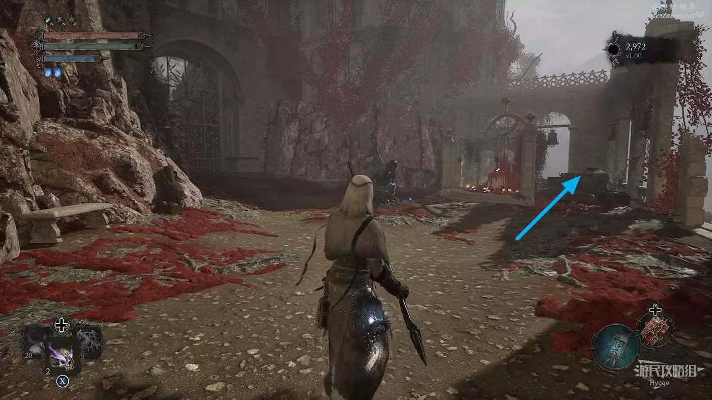 在平臺邊緣的屍體上拿到【布拉米斯城堡地圖】,隨後跳到下層的樓梯上進入城堡內堡。
