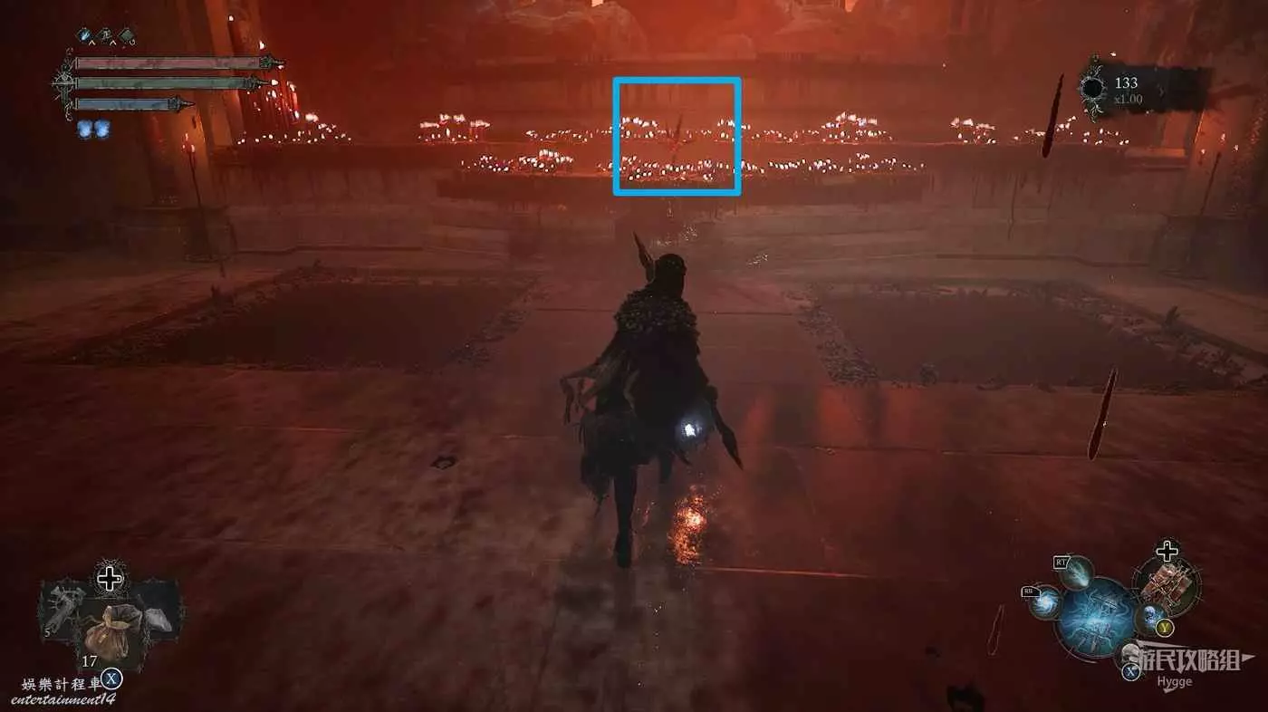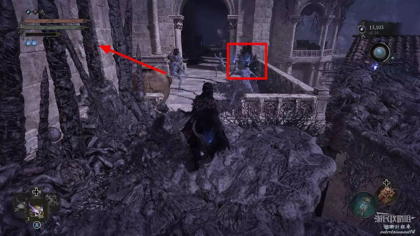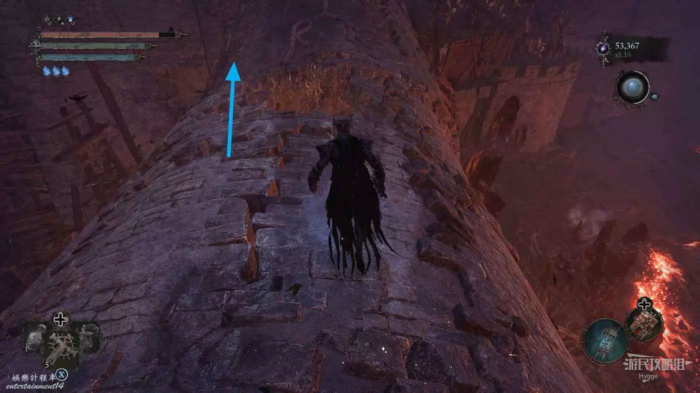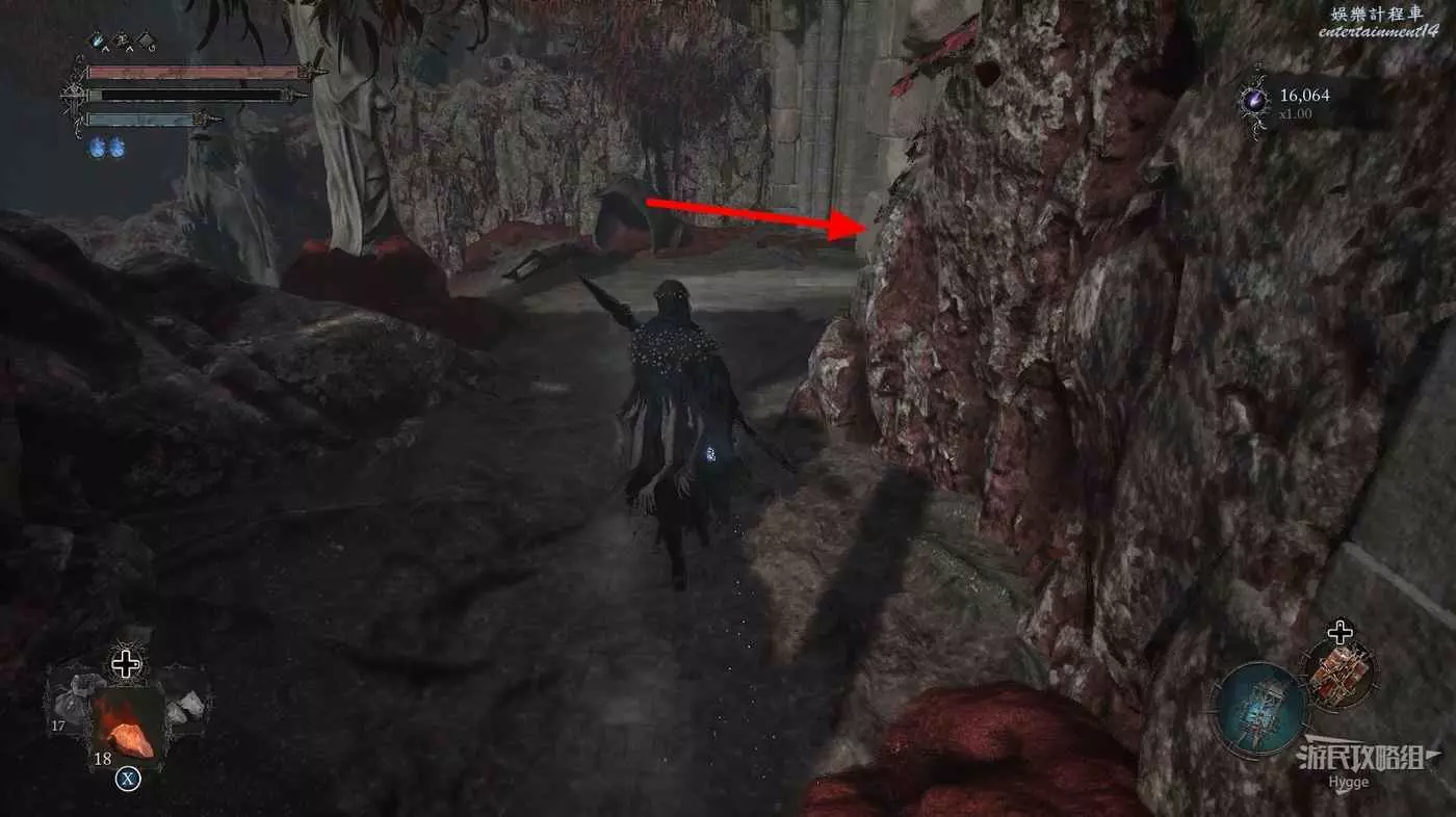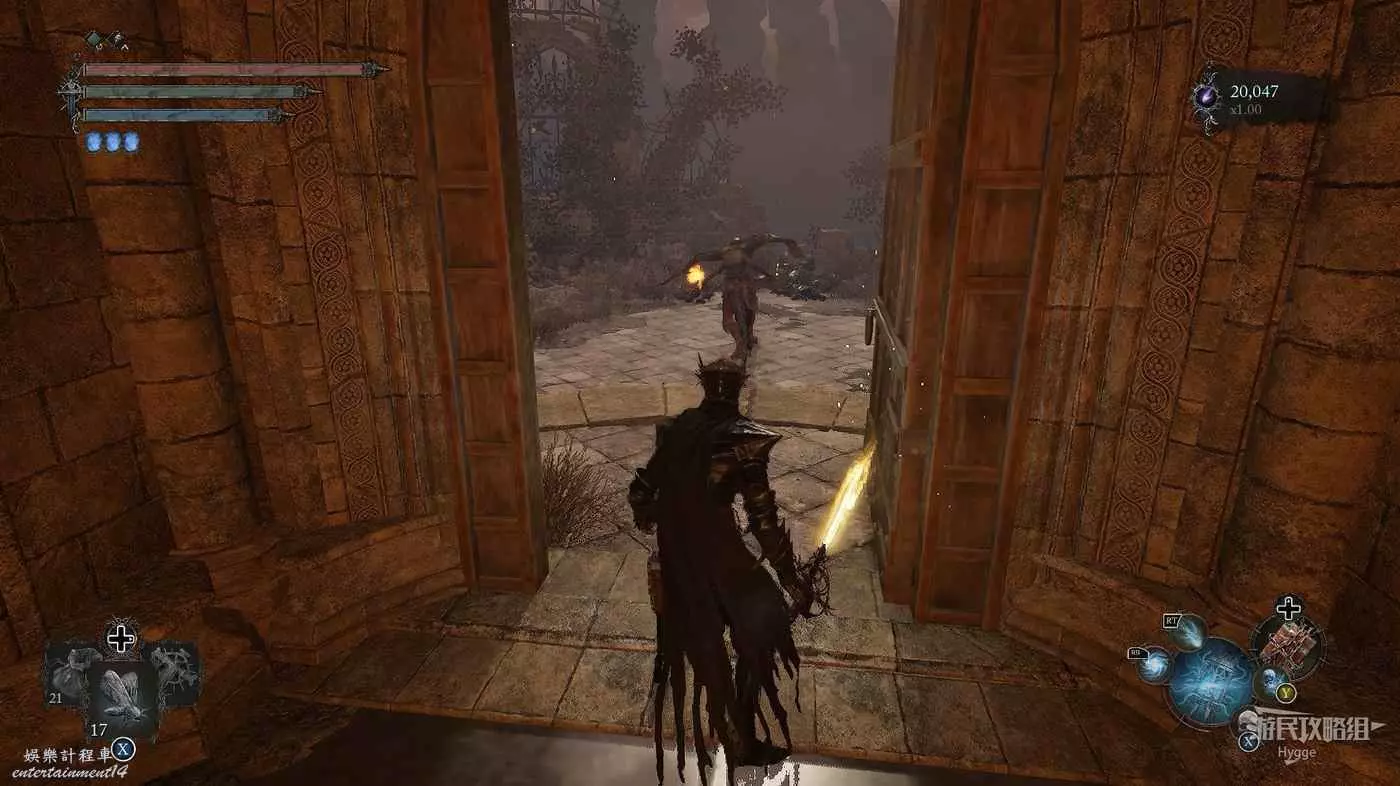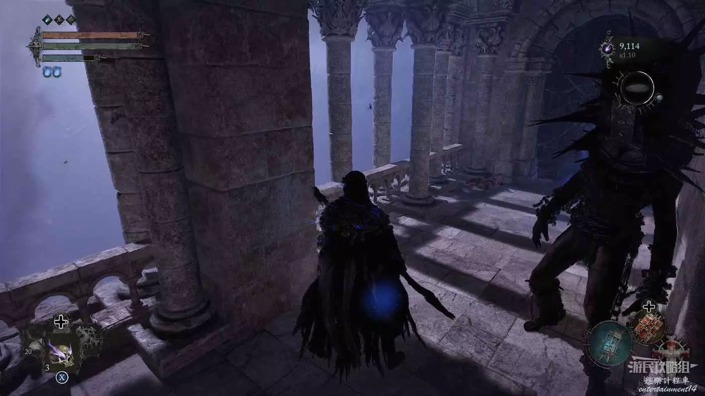在平臺邊緣的屍體上拿到【布拉米斯城堡地圖】,隨後跳到下層的樓梯上進入城堡內堡。