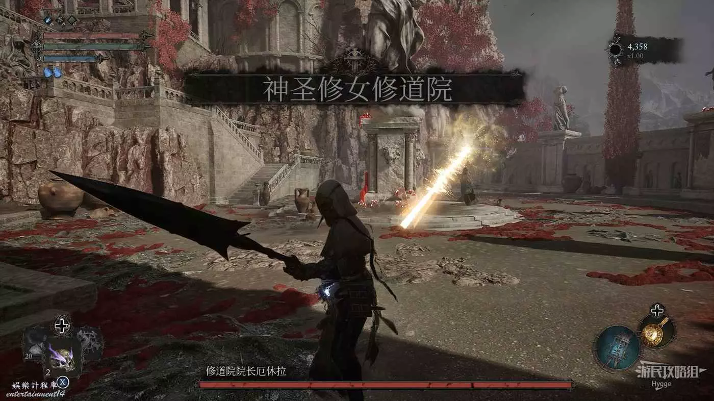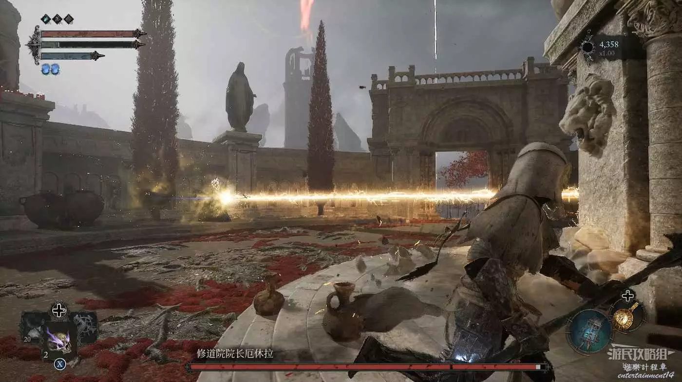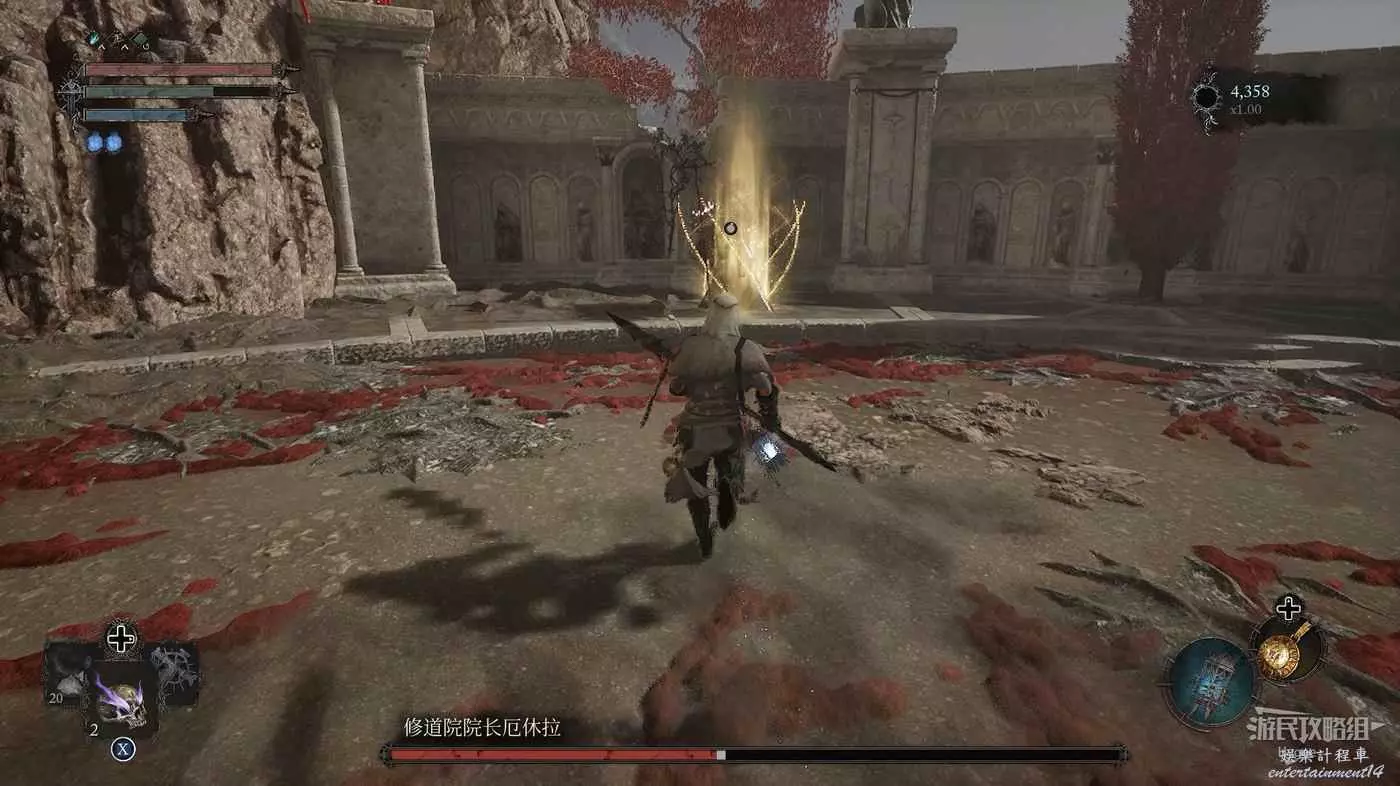 進入前方廣場開啟BOSS戰,此處的BOSS為【修道院院長耳舒拉】。院長最喜歡使用的攻擊招式是向我們所在的位置發射神聖屬性的光線,保持移動即可躲避。