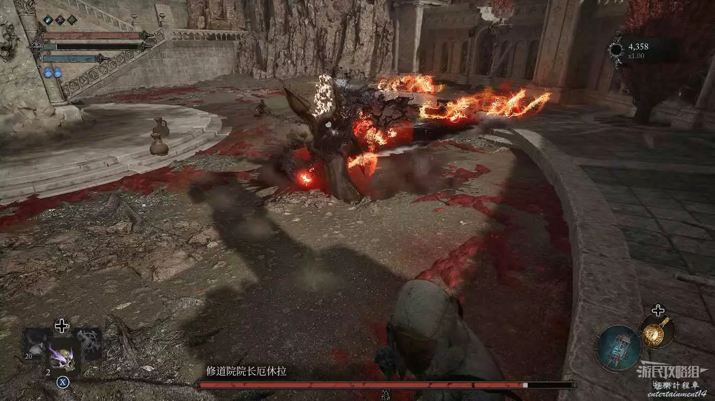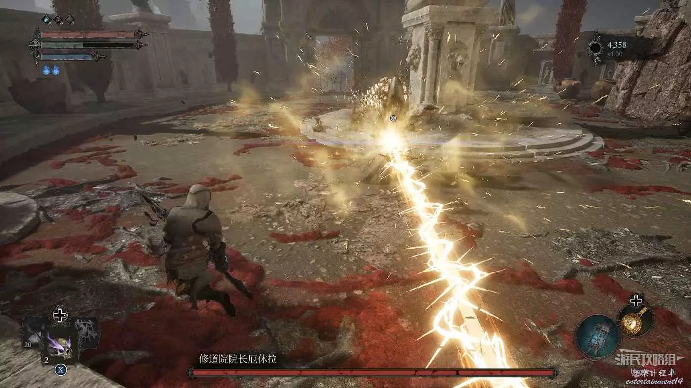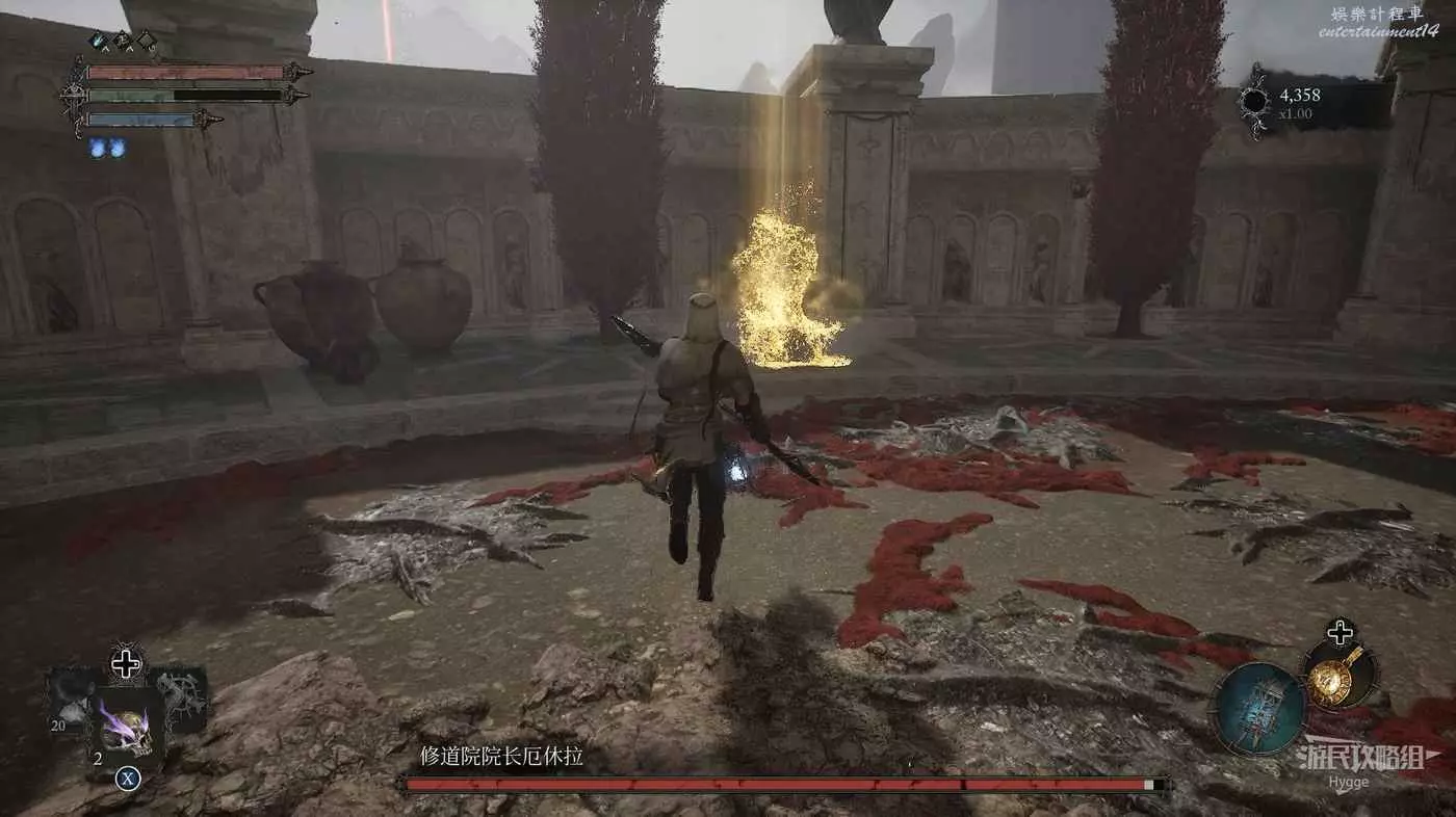 進入前方廣場開啟BOSS戰,此處的BOSS為【修道院院長耳舒拉】。院長最喜歡使用的攻擊招式是向我們所在的位置發射神聖屬性的光線,保持移動即可躲避。