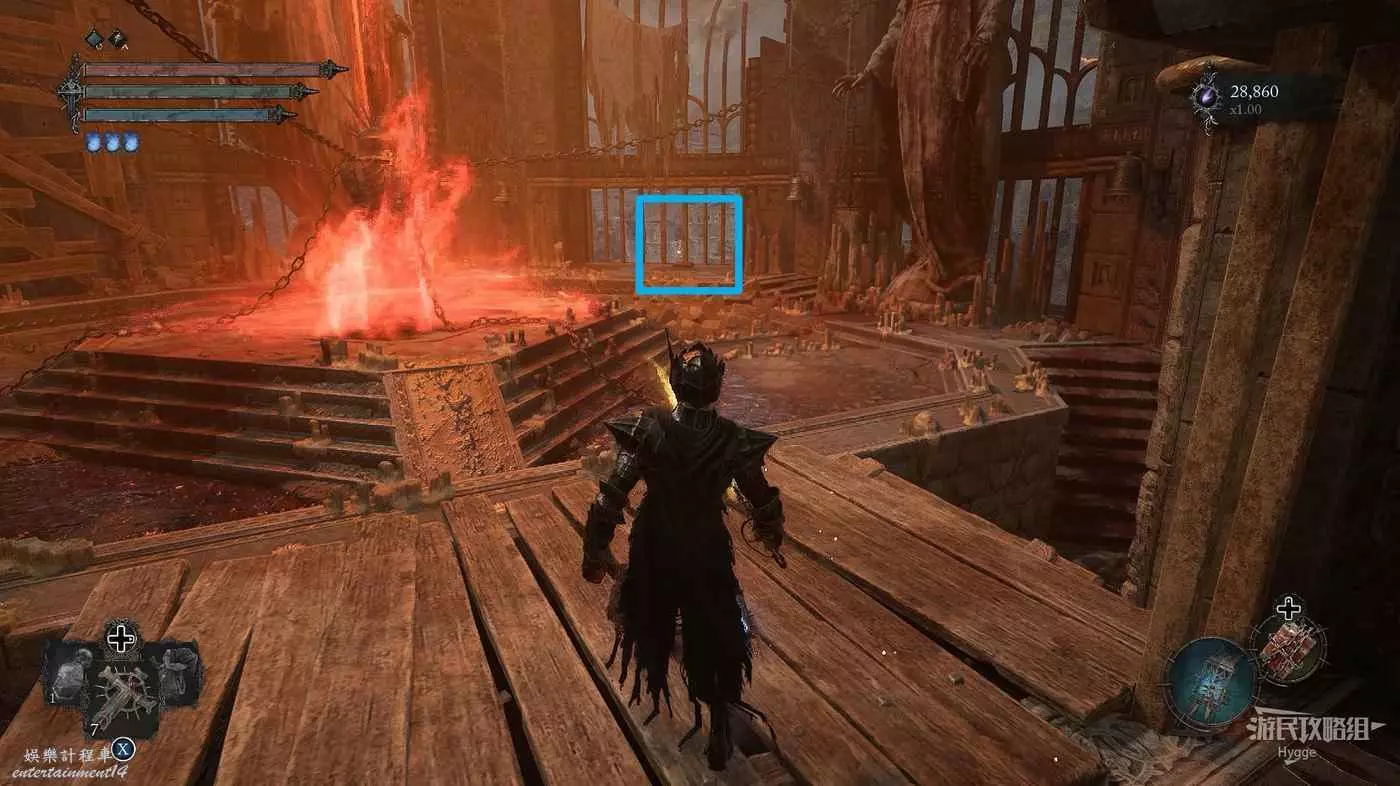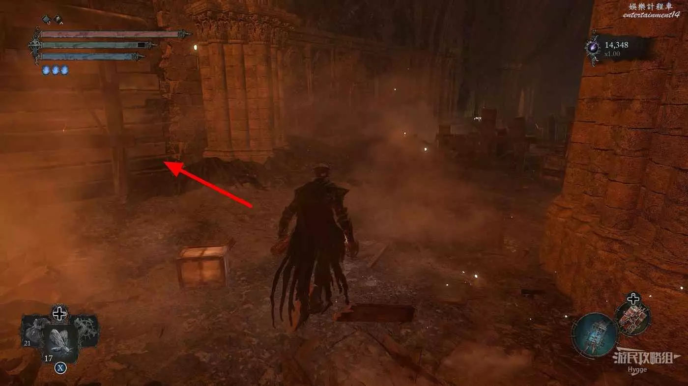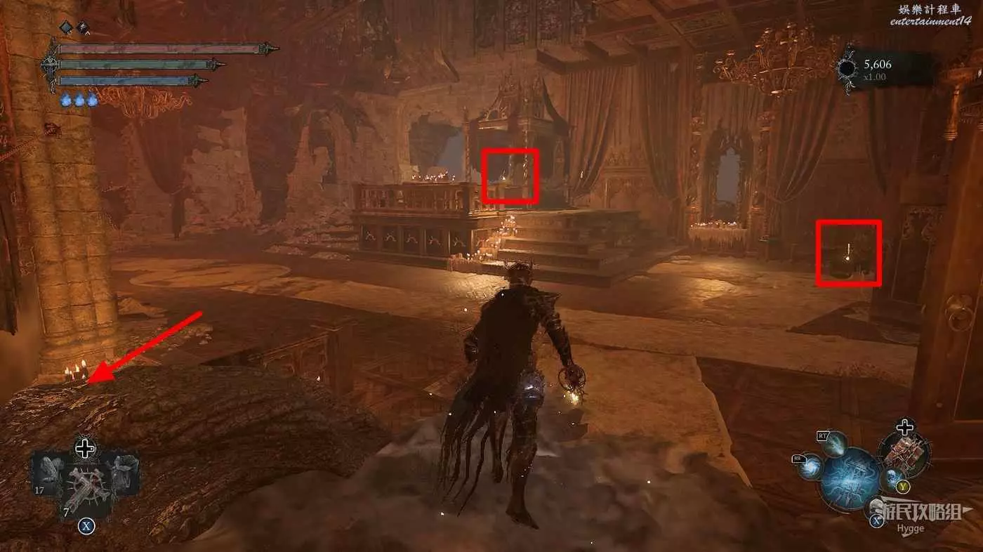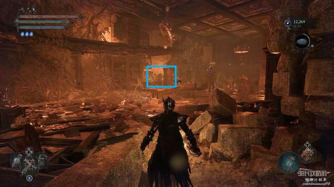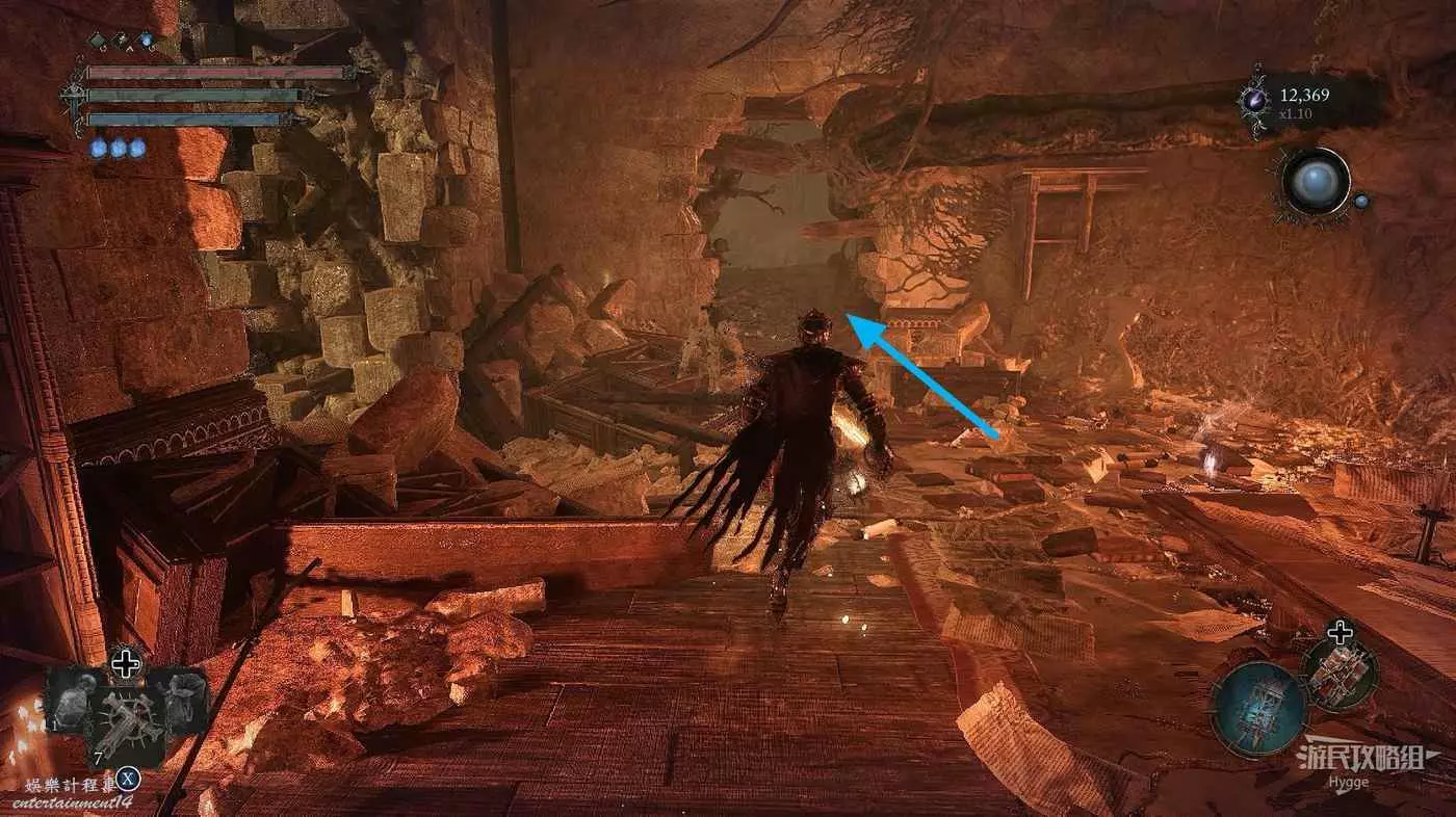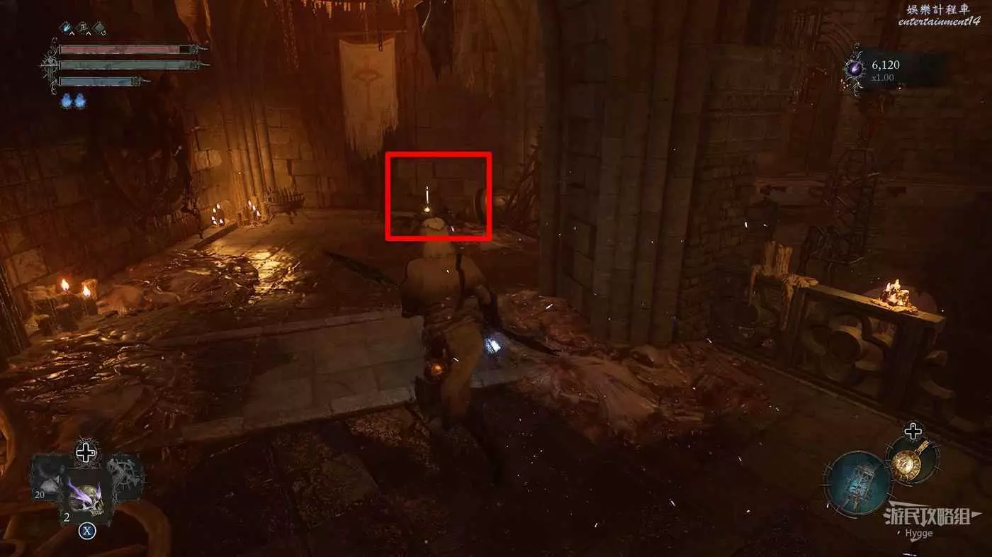 回到剛剛擊殺燃燒先知的平臺,前往城堡另一側的走廊,破壞木板進入後方的房間裡。