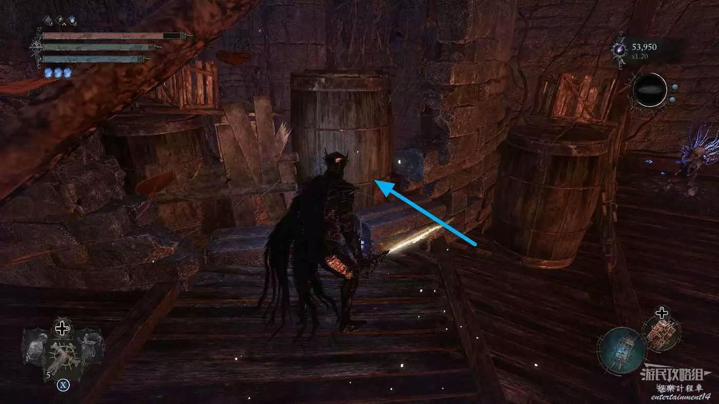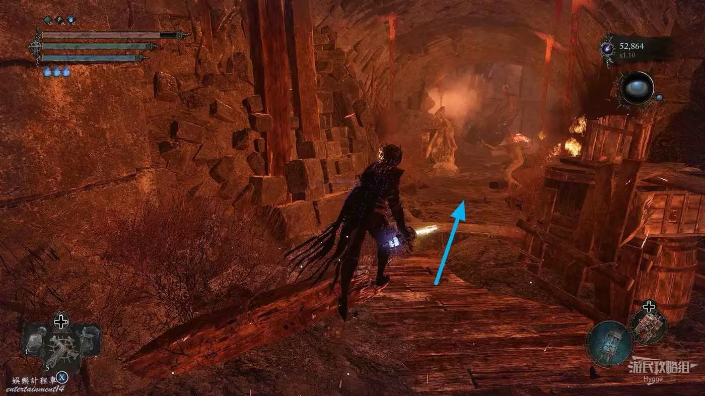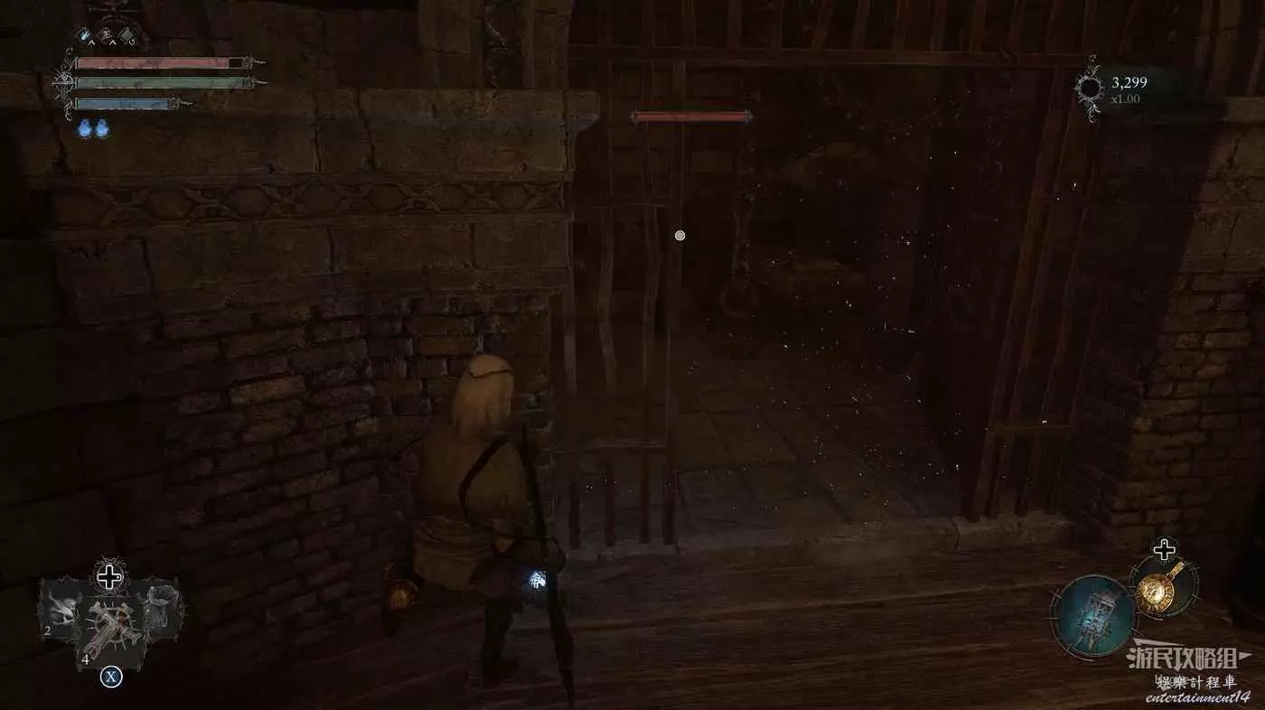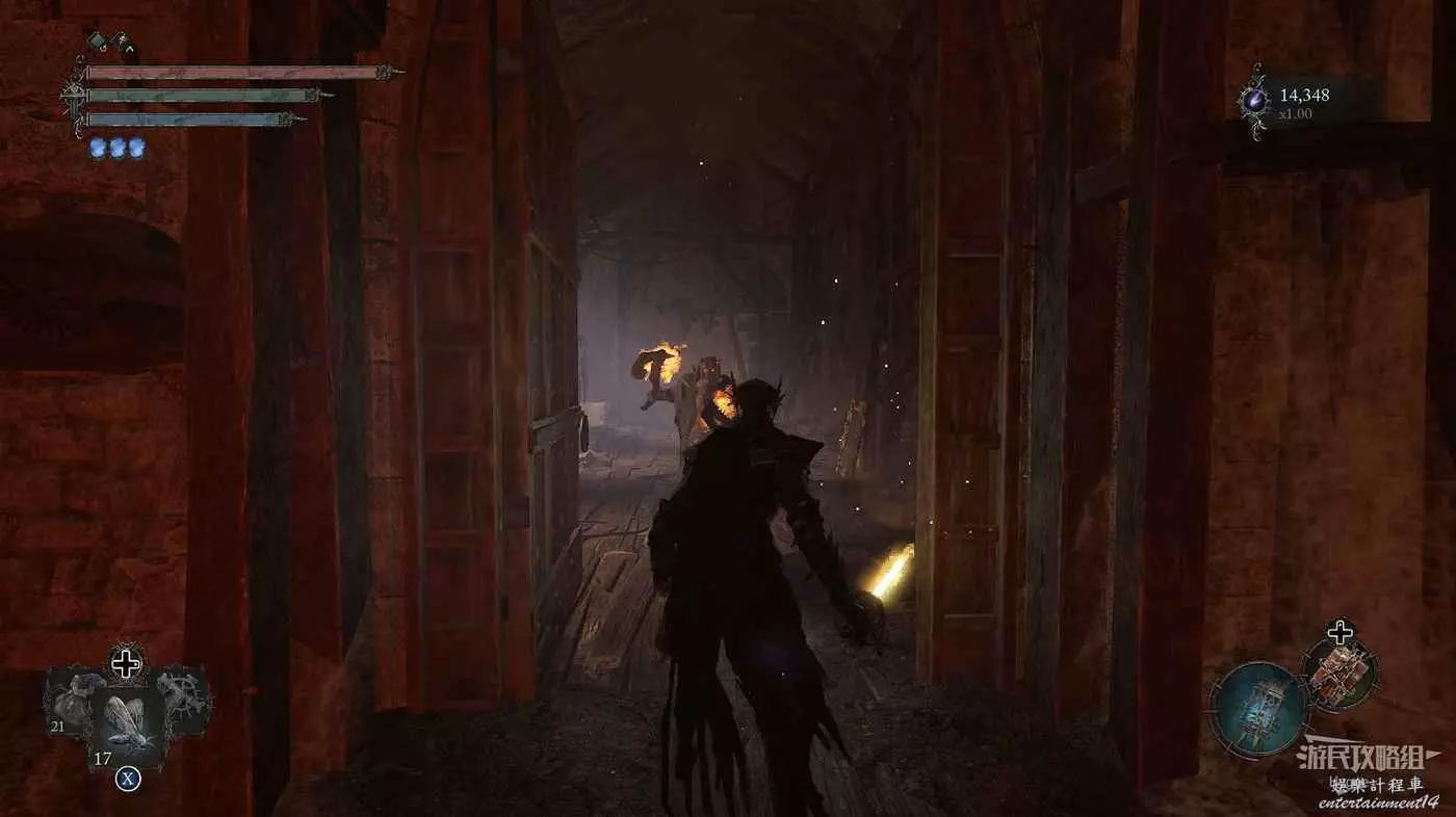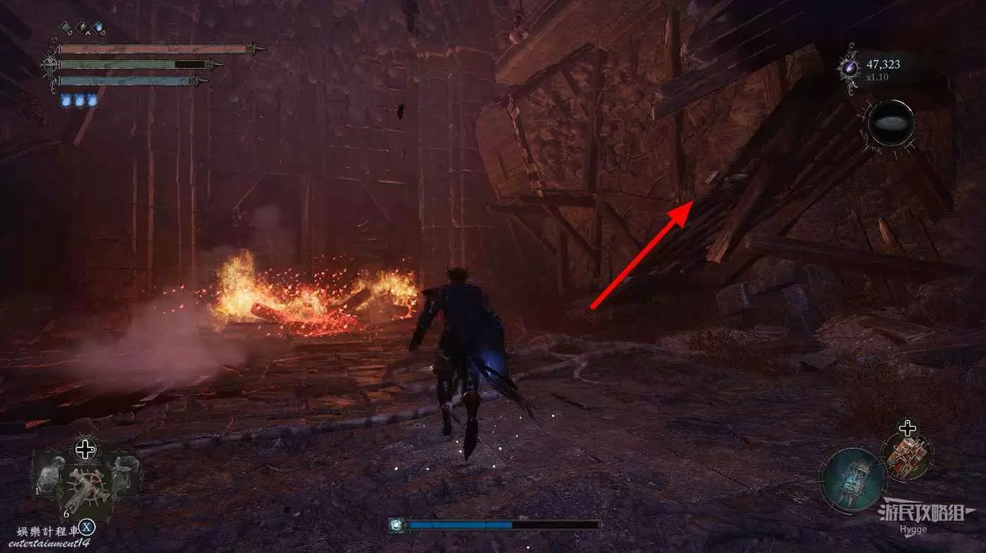 回到剛剛擊殺燃燒先知的平臺,前往城堡另一側的走廊,破壞木板進入後方的房間裡。
