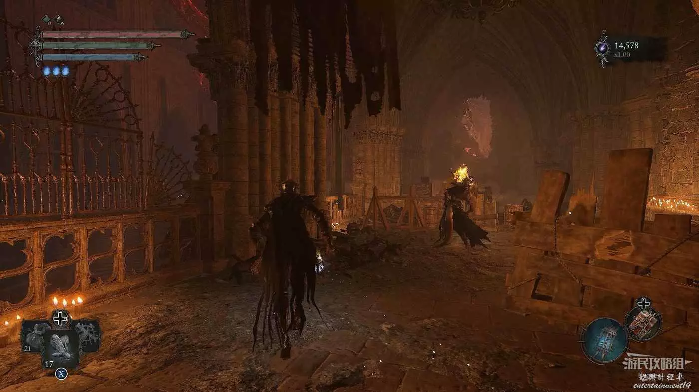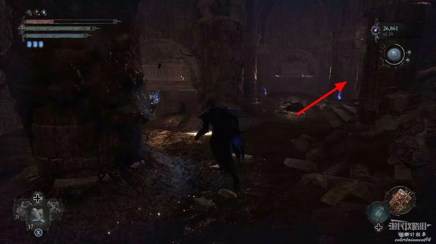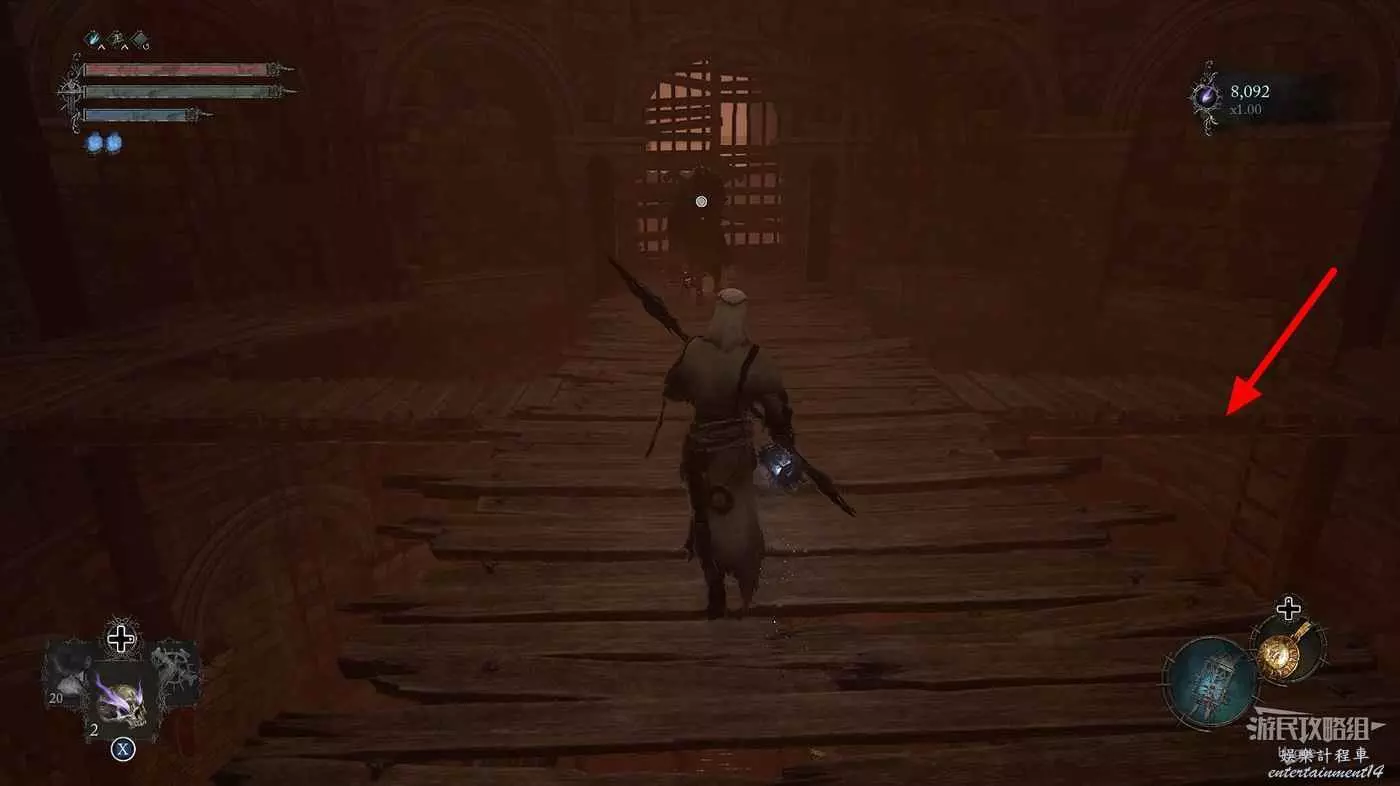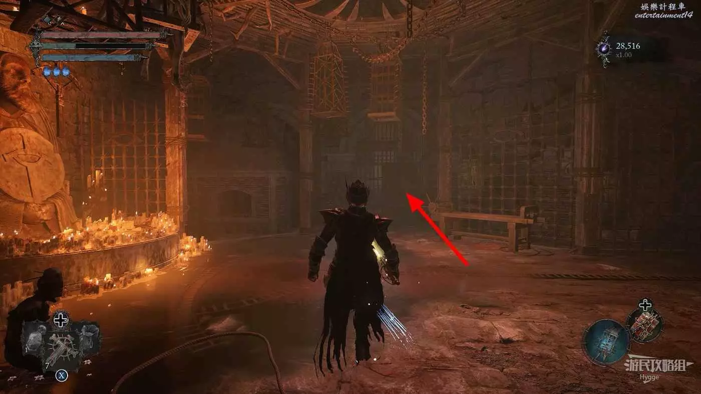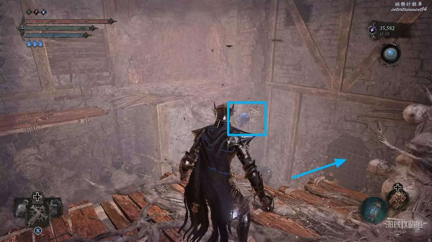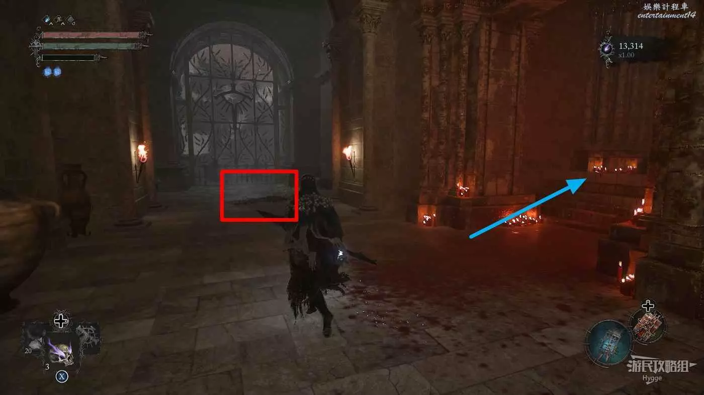 回到剛剛擊殺燃燒先知的平臺,前往城堡另一側的走廊,破壞木板進入後方的房間裡。