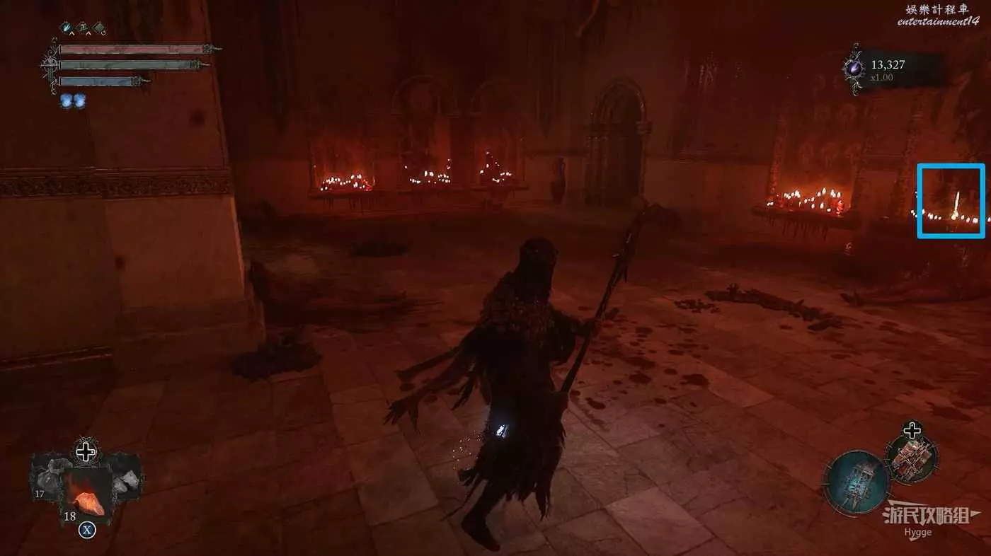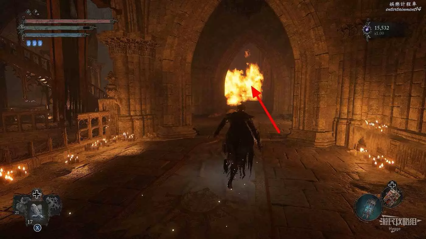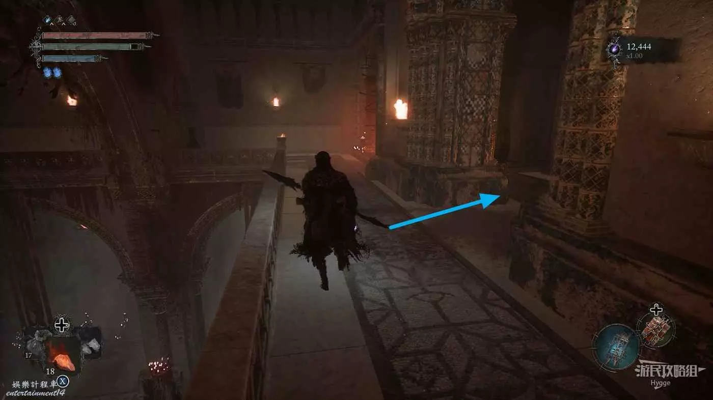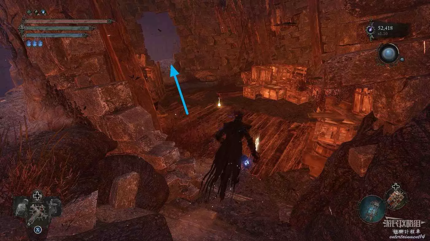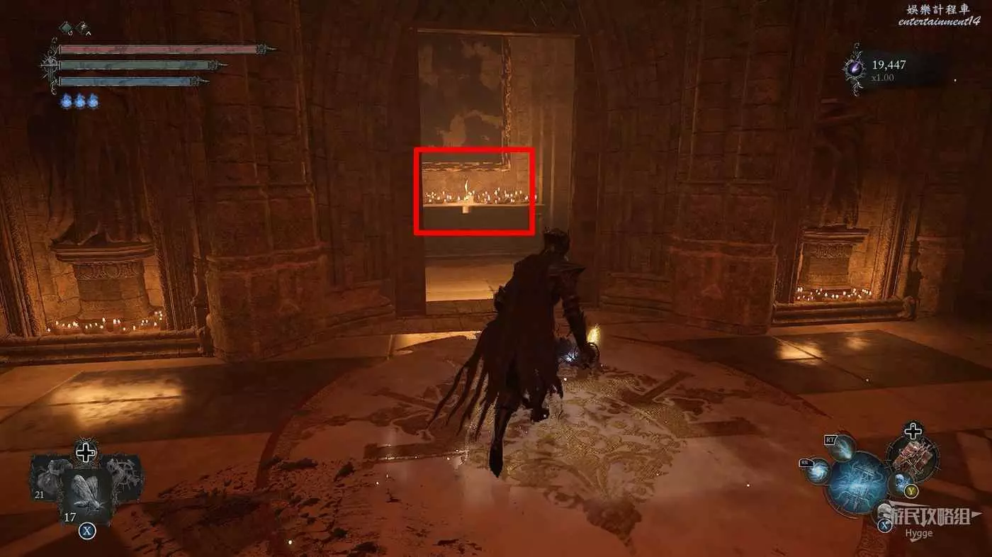回到剛剛擊殺燃燒先知的平臺,前往城堡另一側的走廊,破壞木板進入後方的房間裡。