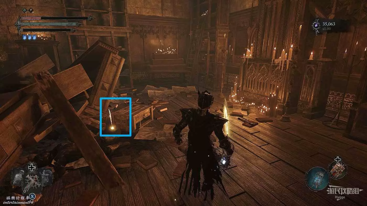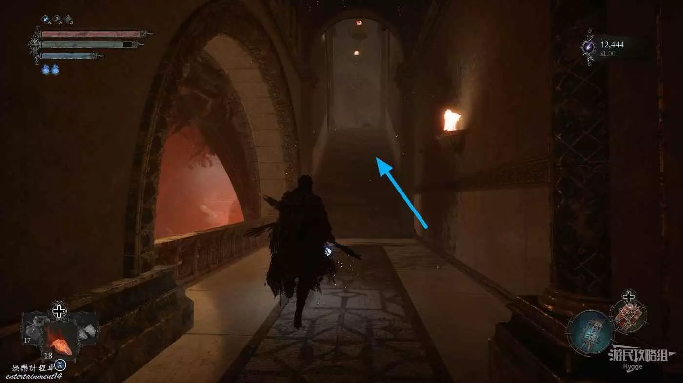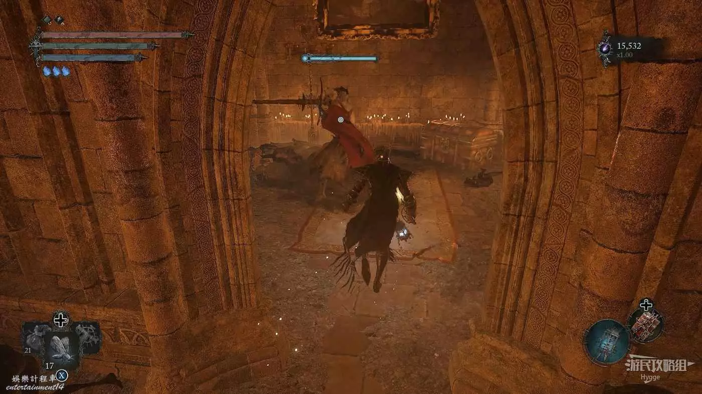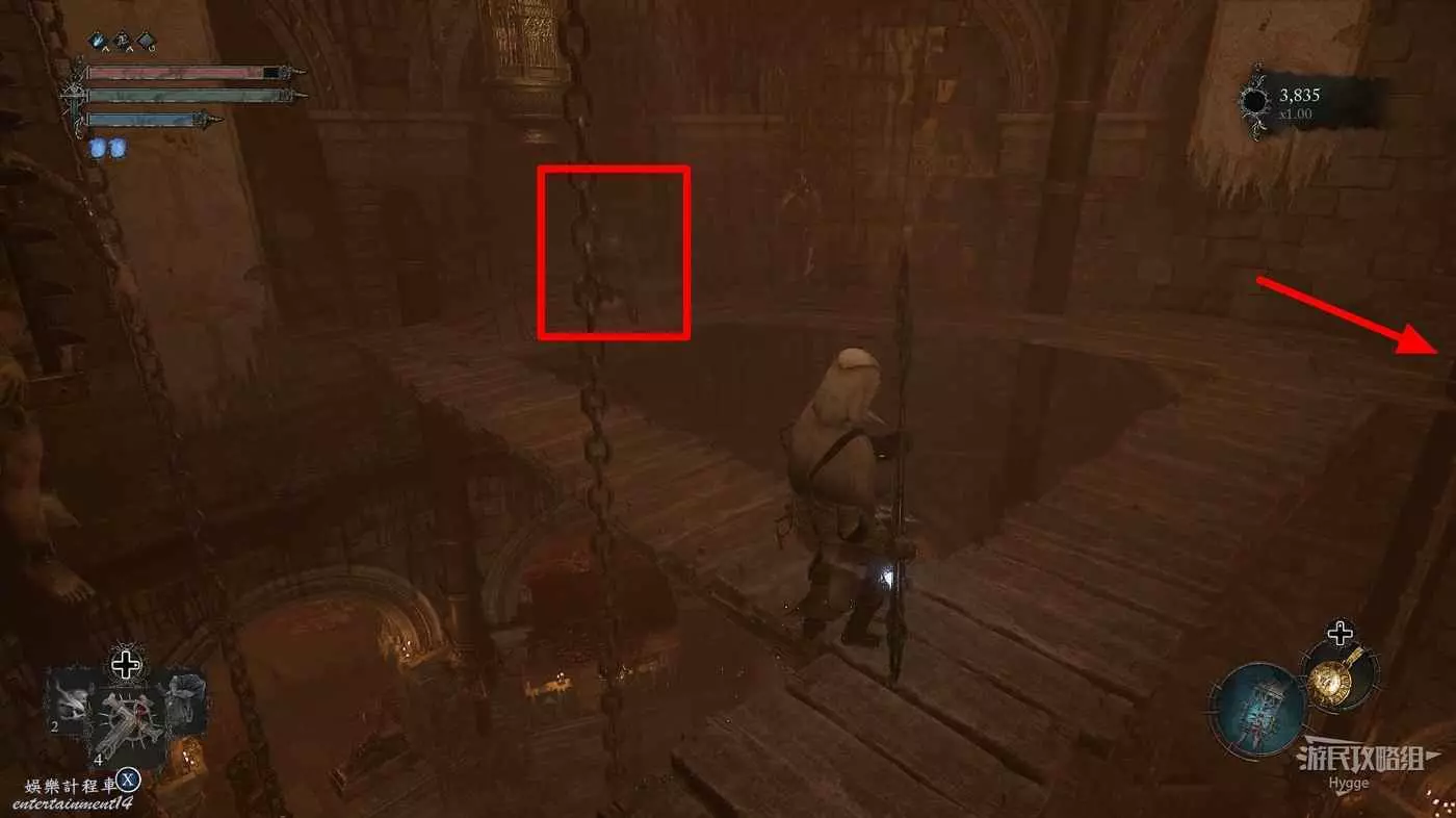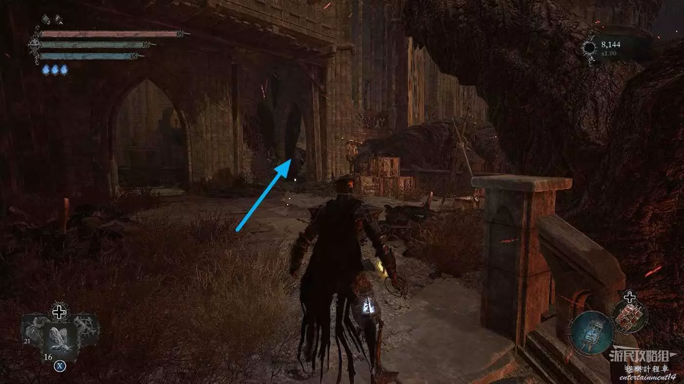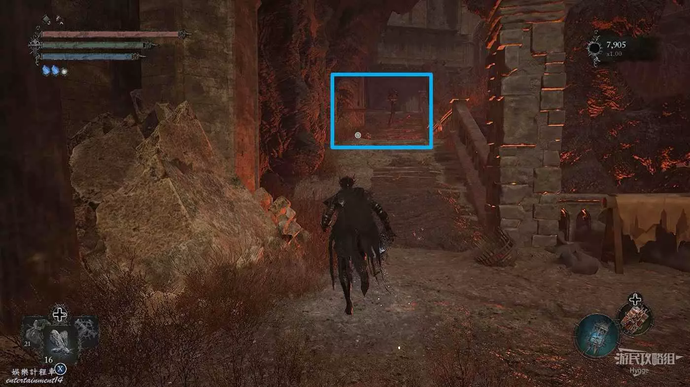 回到剛剛擊殺燃燒先知的平臺,前往城堡另一側的走廊,破壞木板進入後方的房間裡。