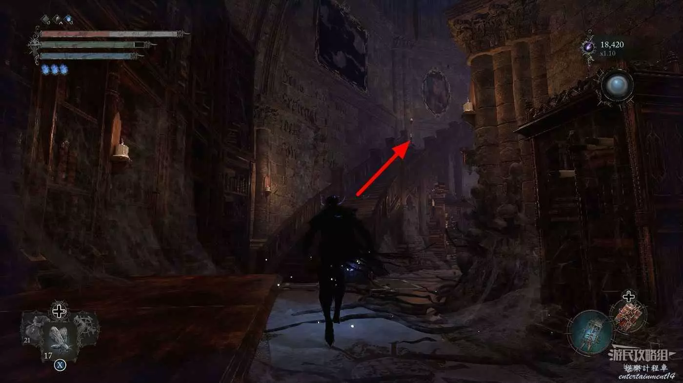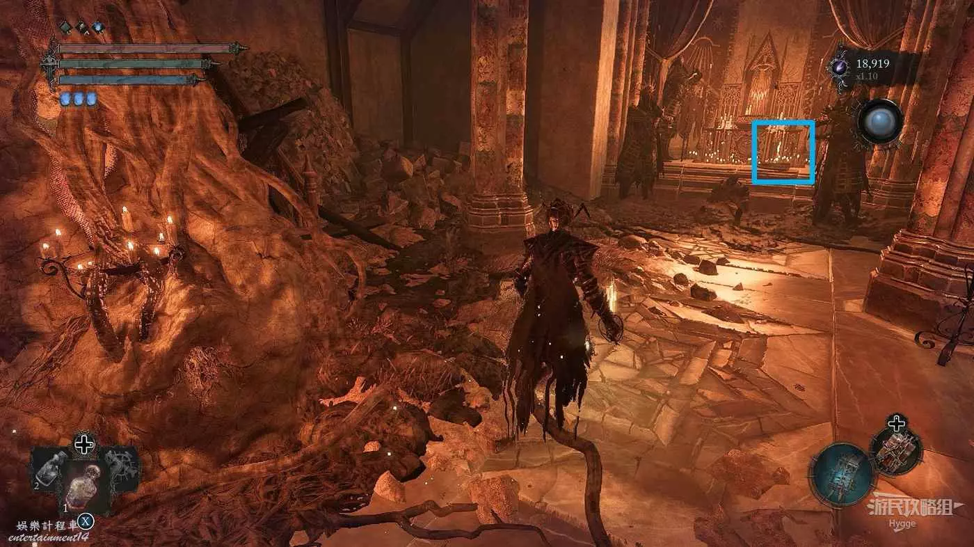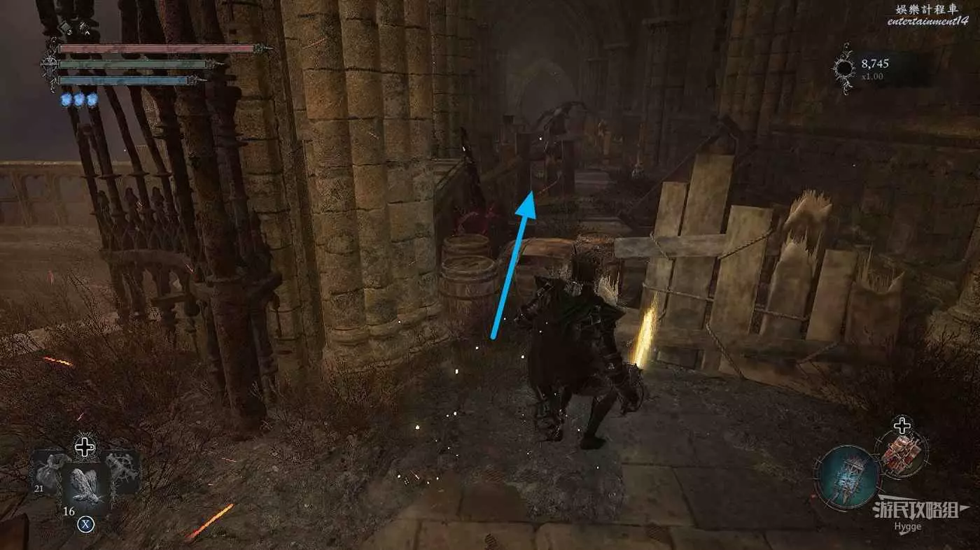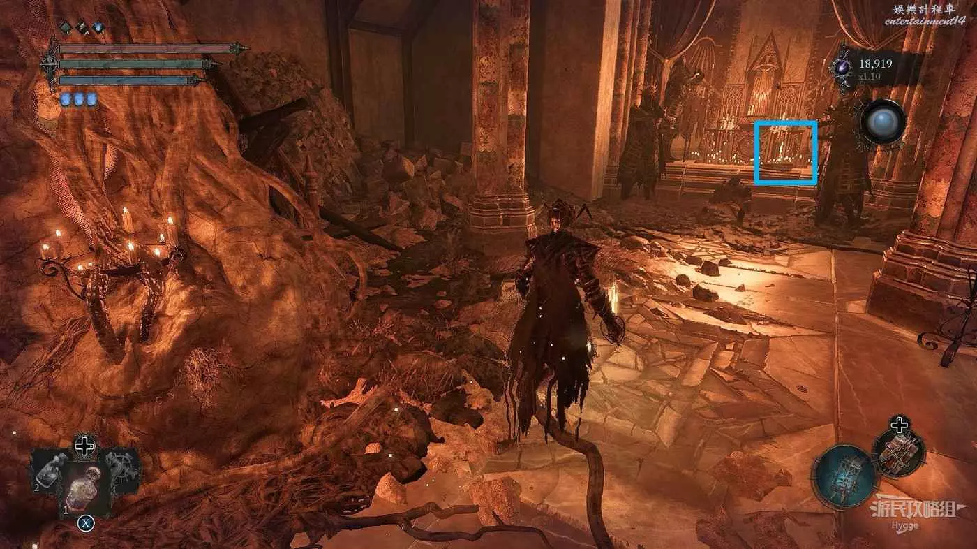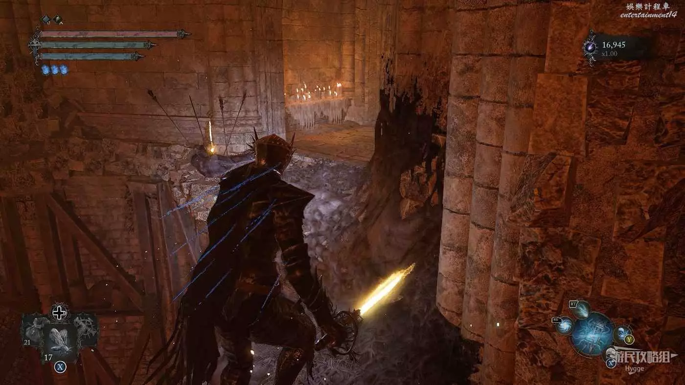 回到剛剛擊殺燃燒先知的平臺,前往城堡另一側的走廊,破壞木板進入後方的房間裡。