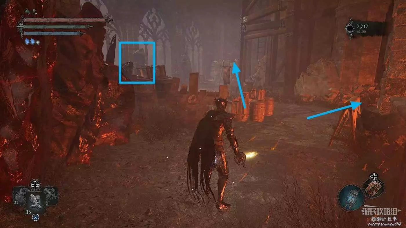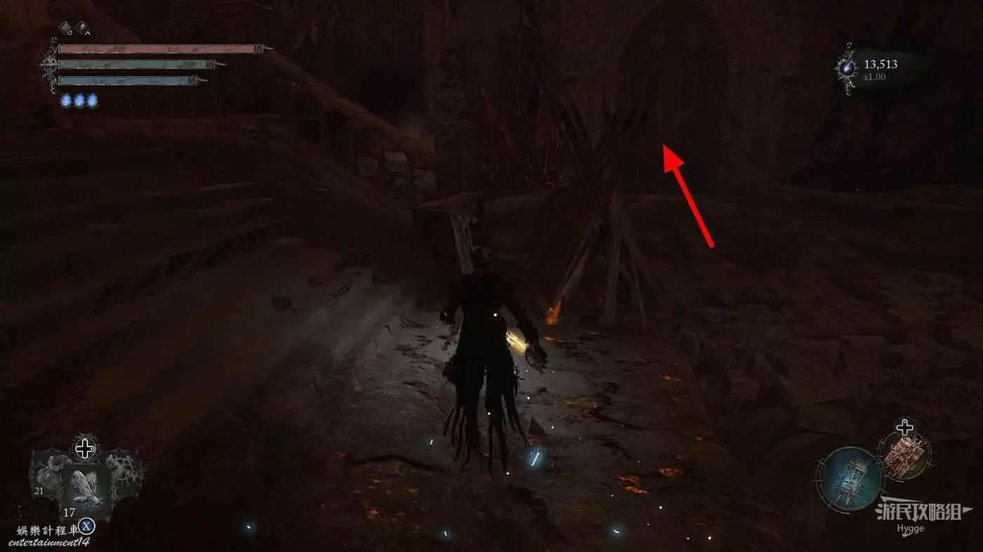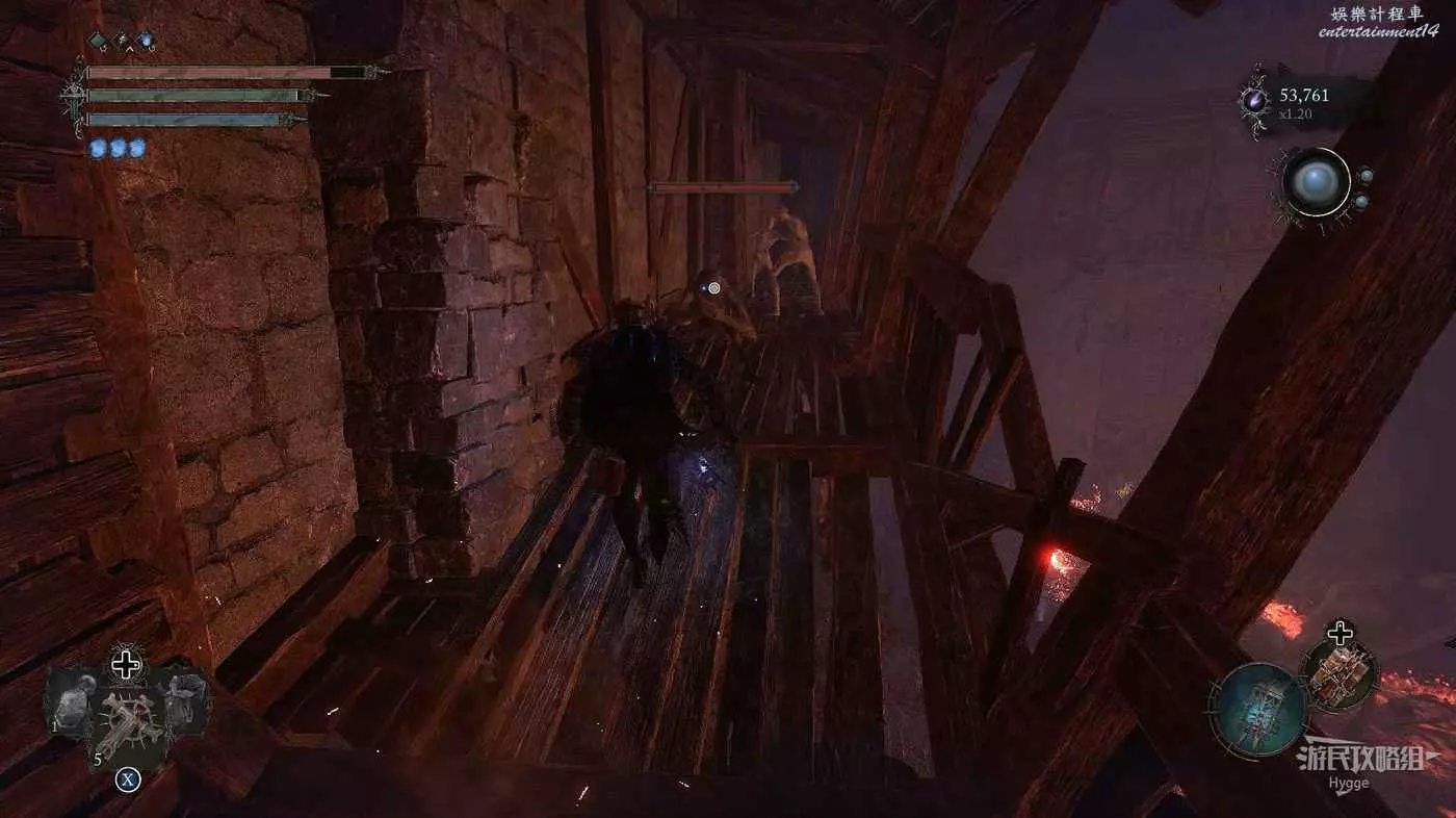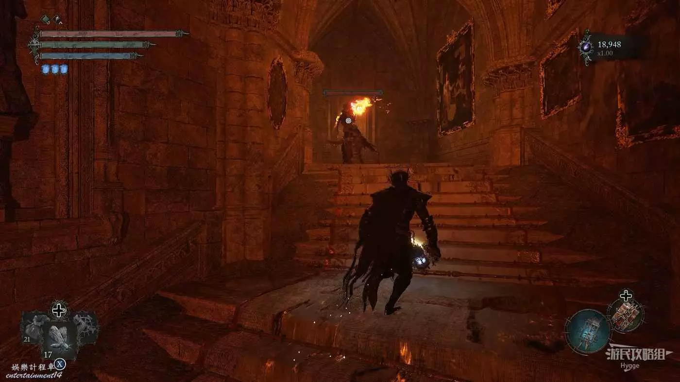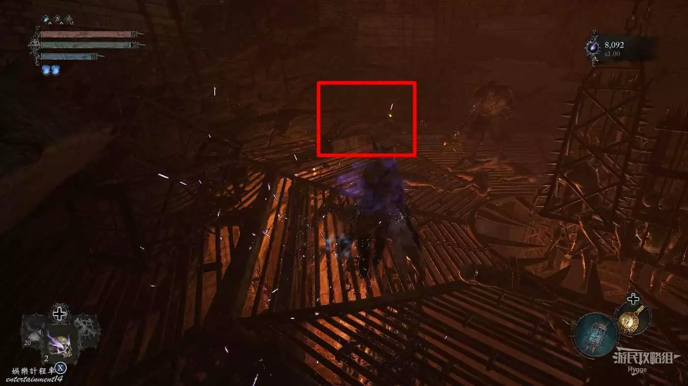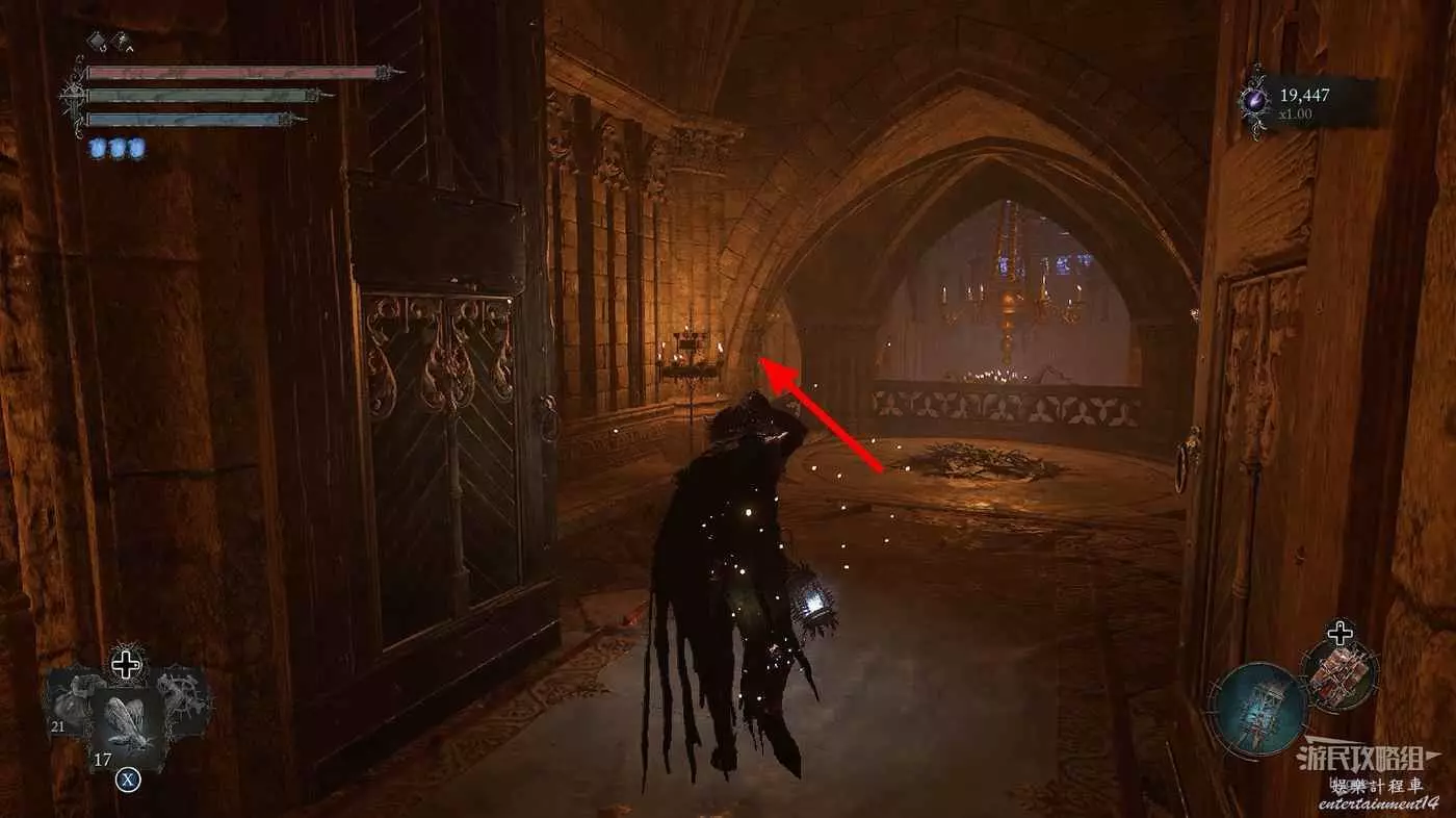 回到剛剛擊殺燃燒先知的平臺,前往城堡另一側的走廊,破壞木板進入後方的房間裡。