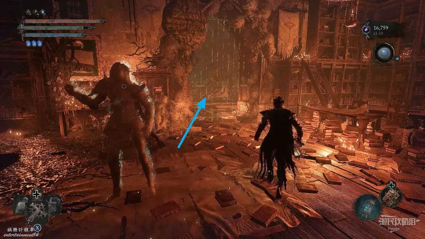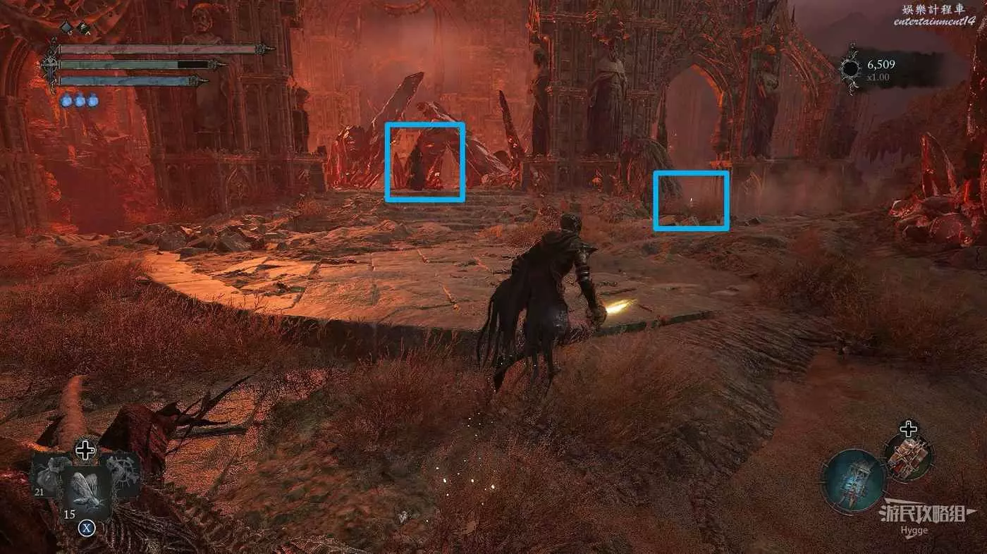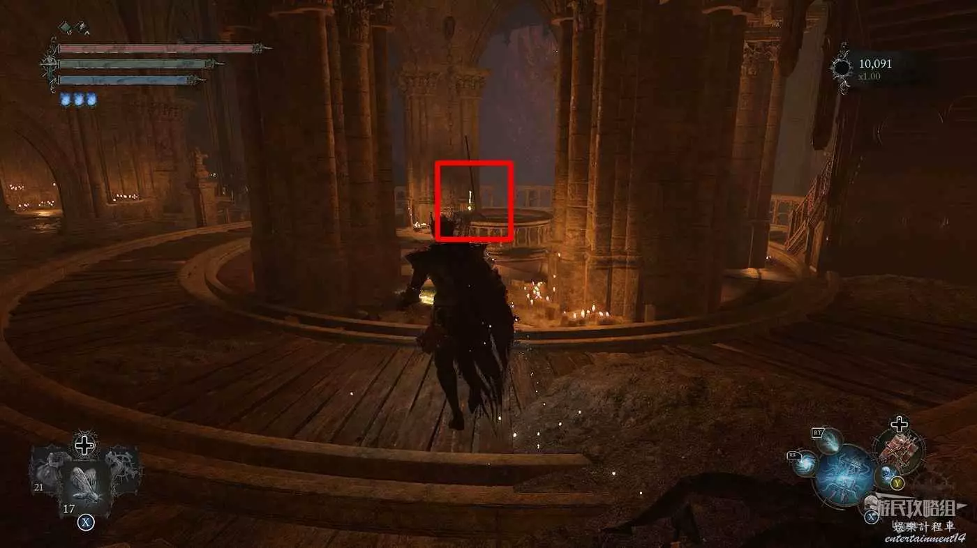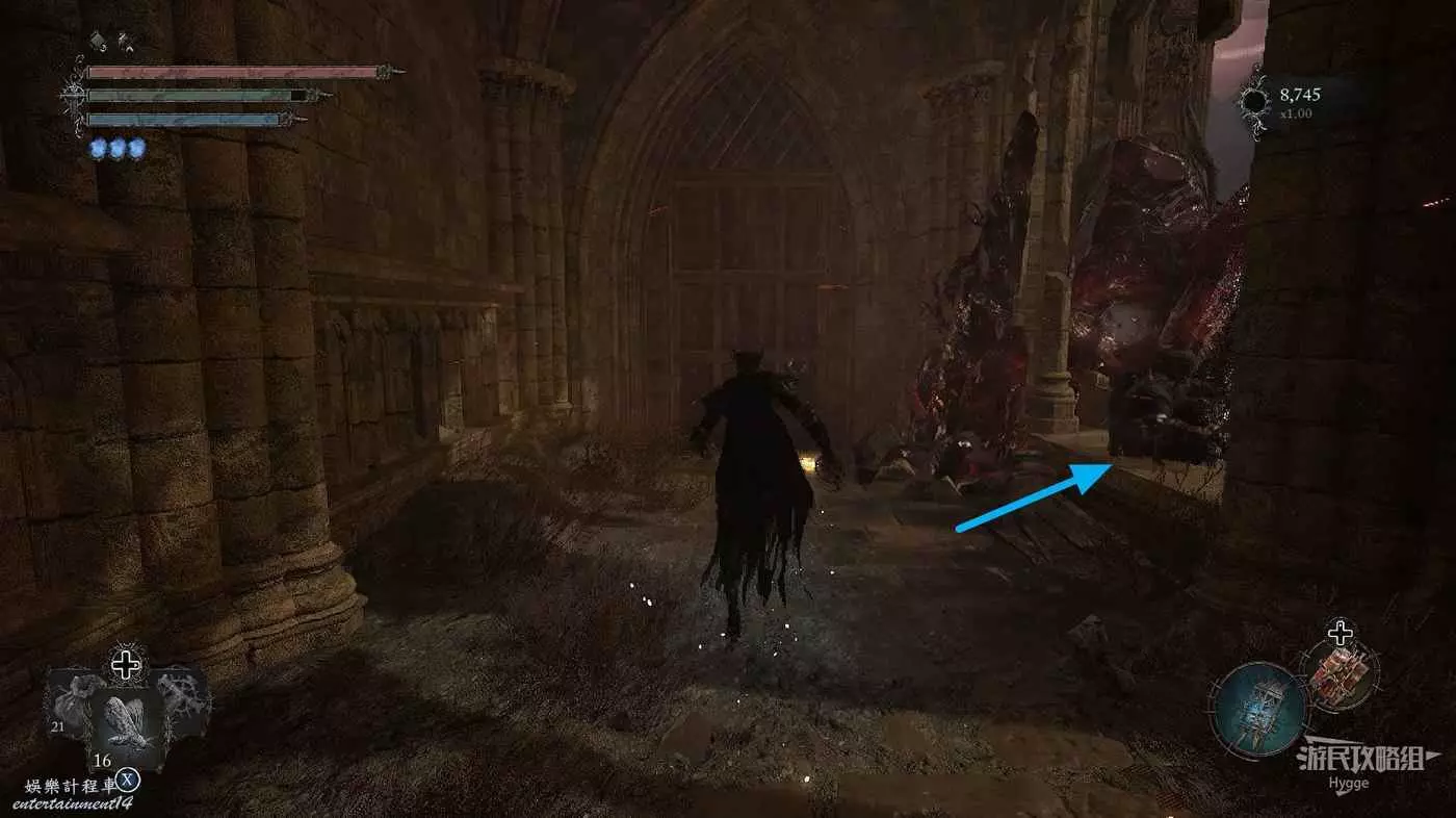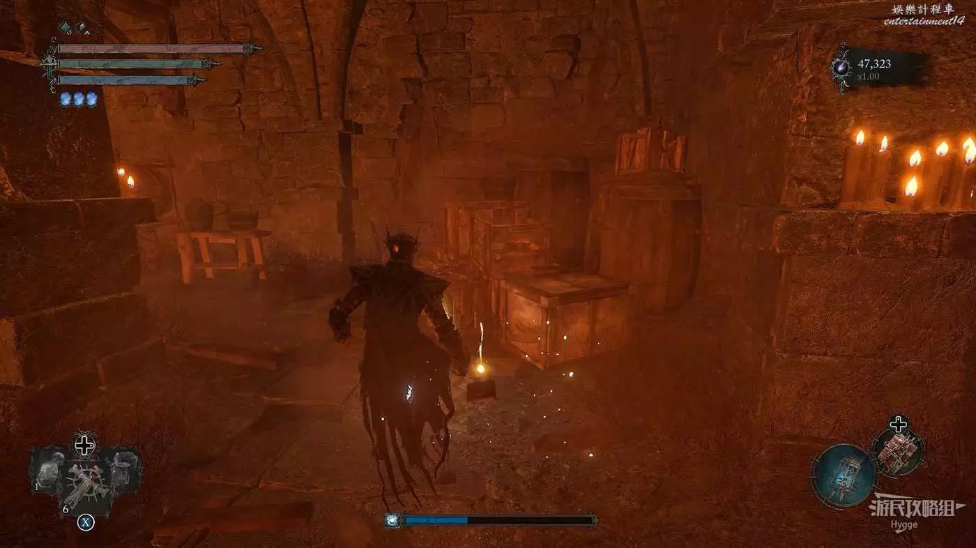 回到剛剛擊殺燃燒先知的平臺,前往城堡另一側的走廊,破壞木板進入後方的房間裡。