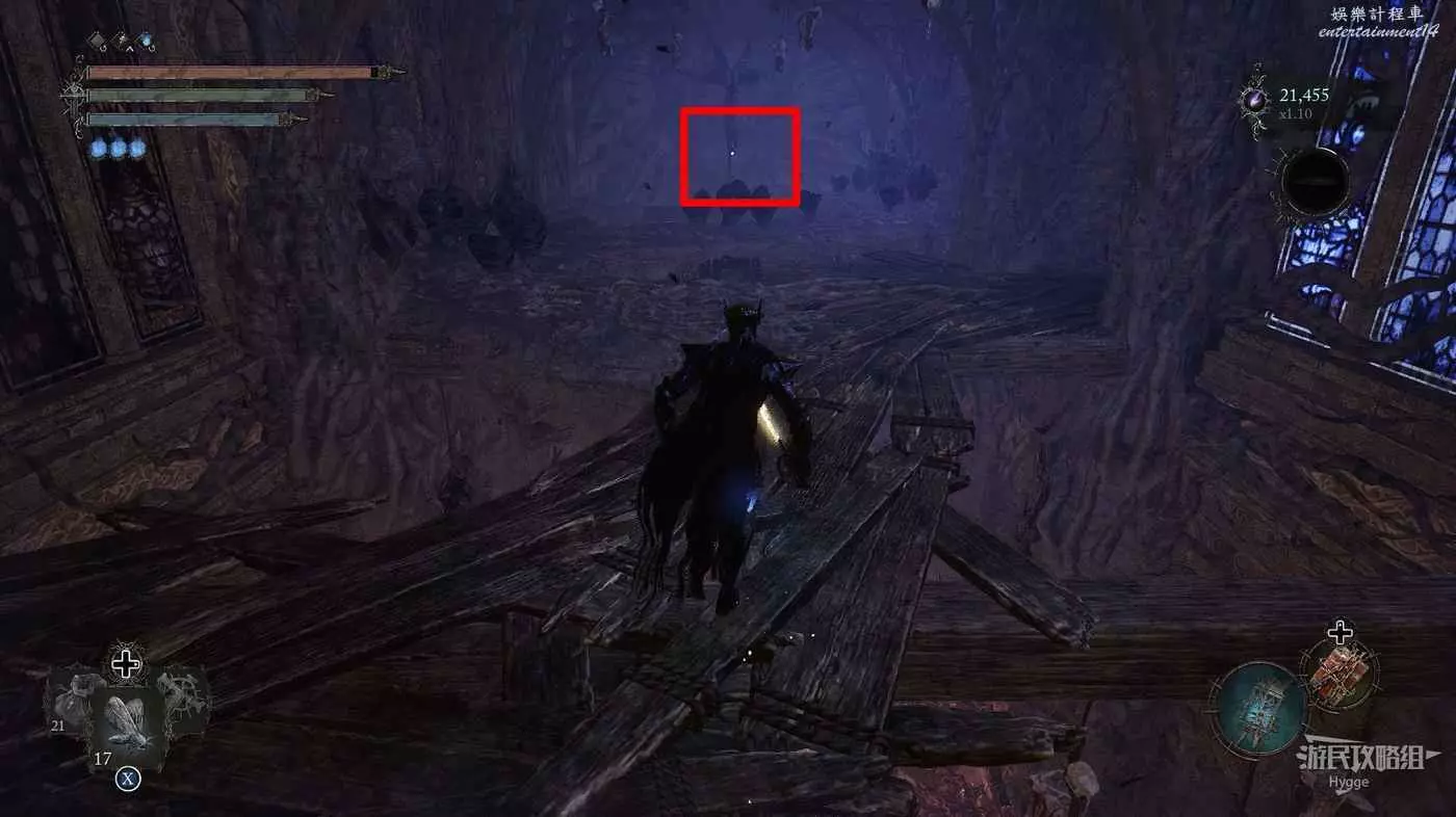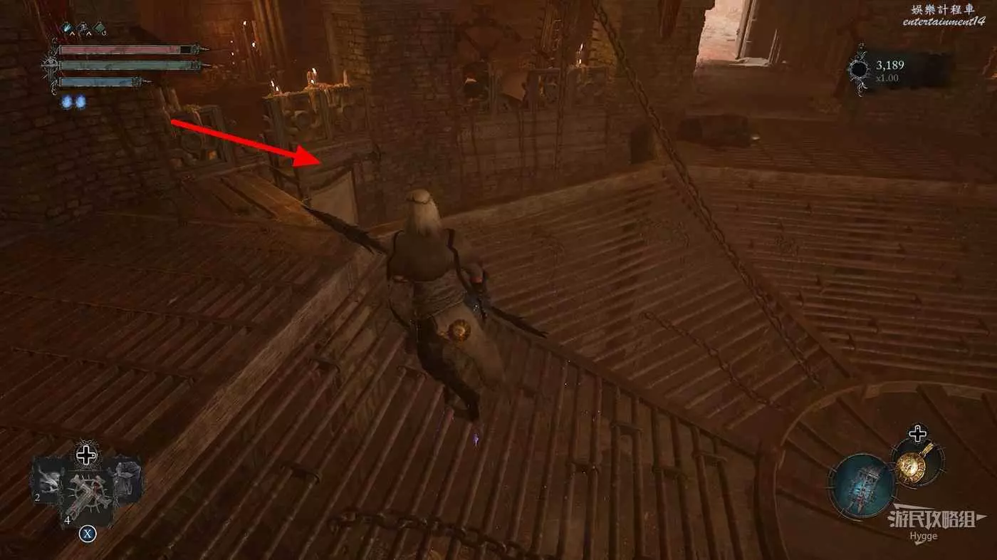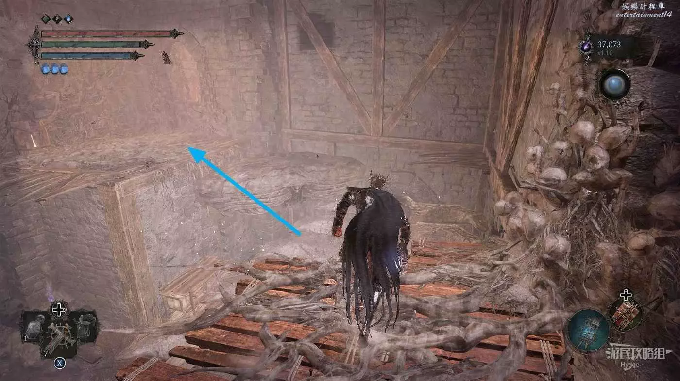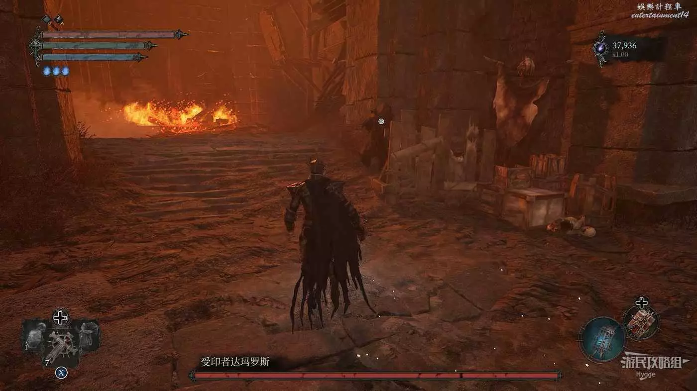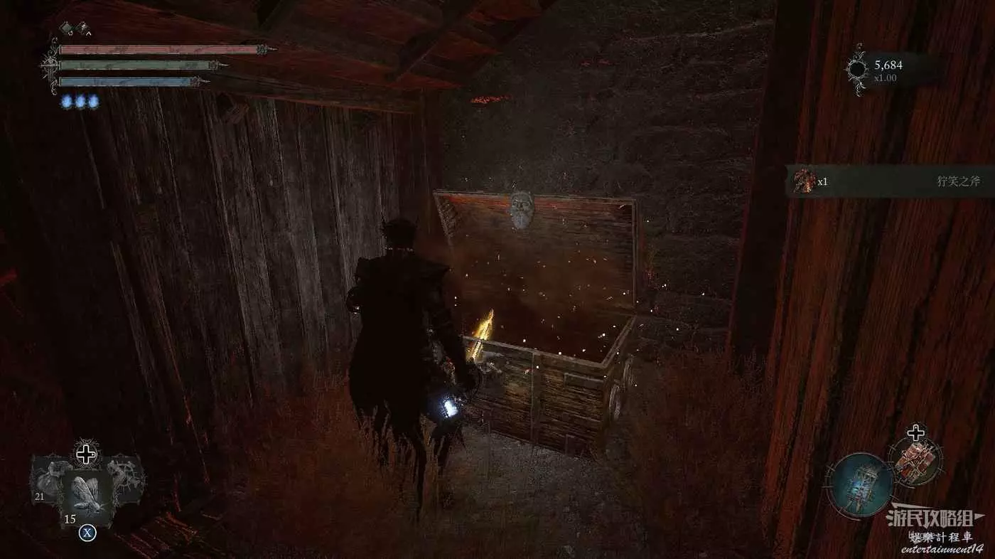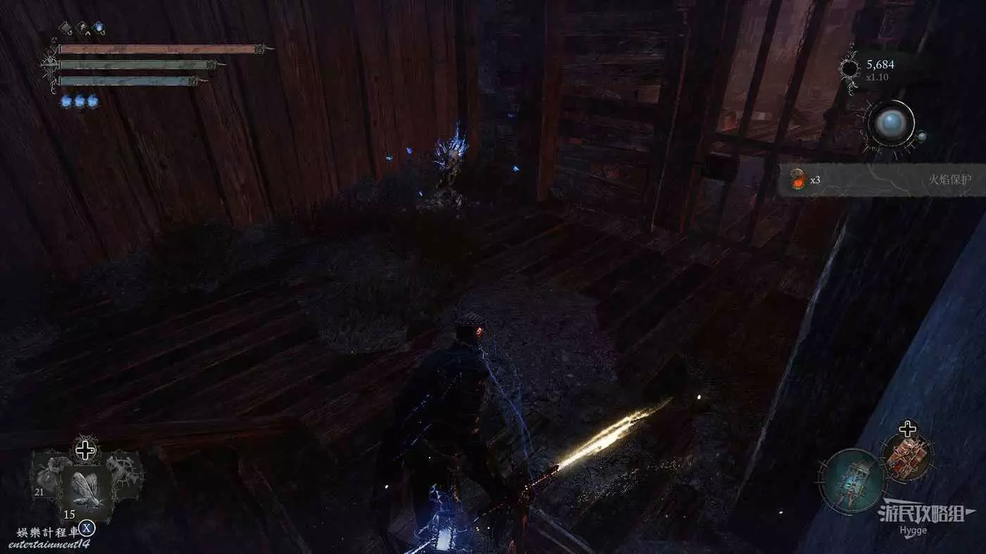 回到剛剛擊殺燃燒先知的平臺,前往城堡另一側的走廊,破壞木板進入後方的房間裡。