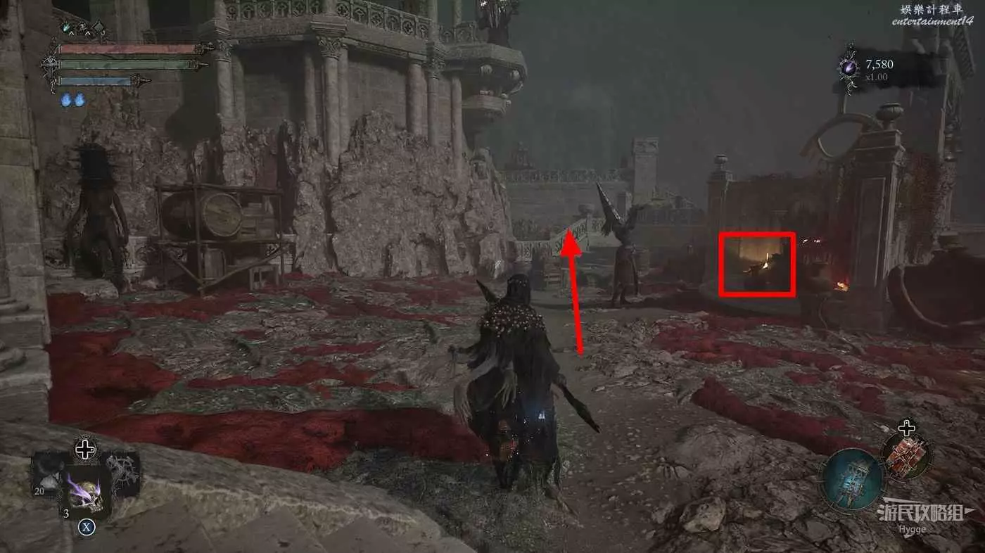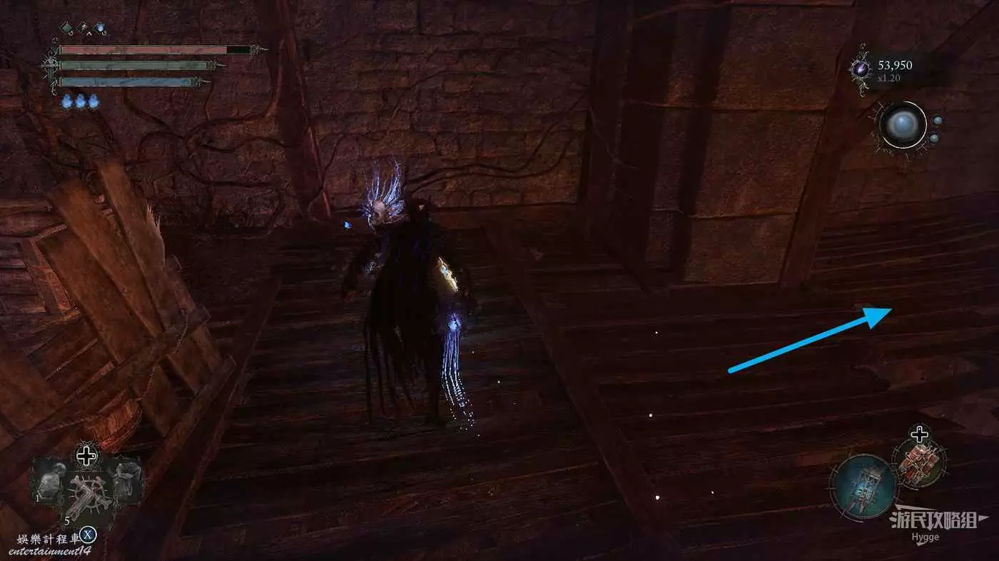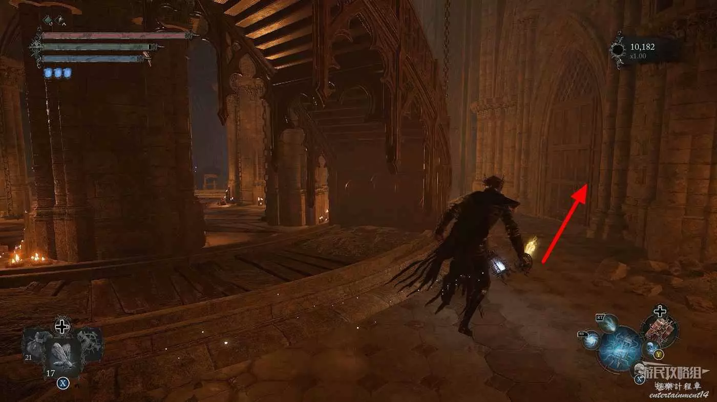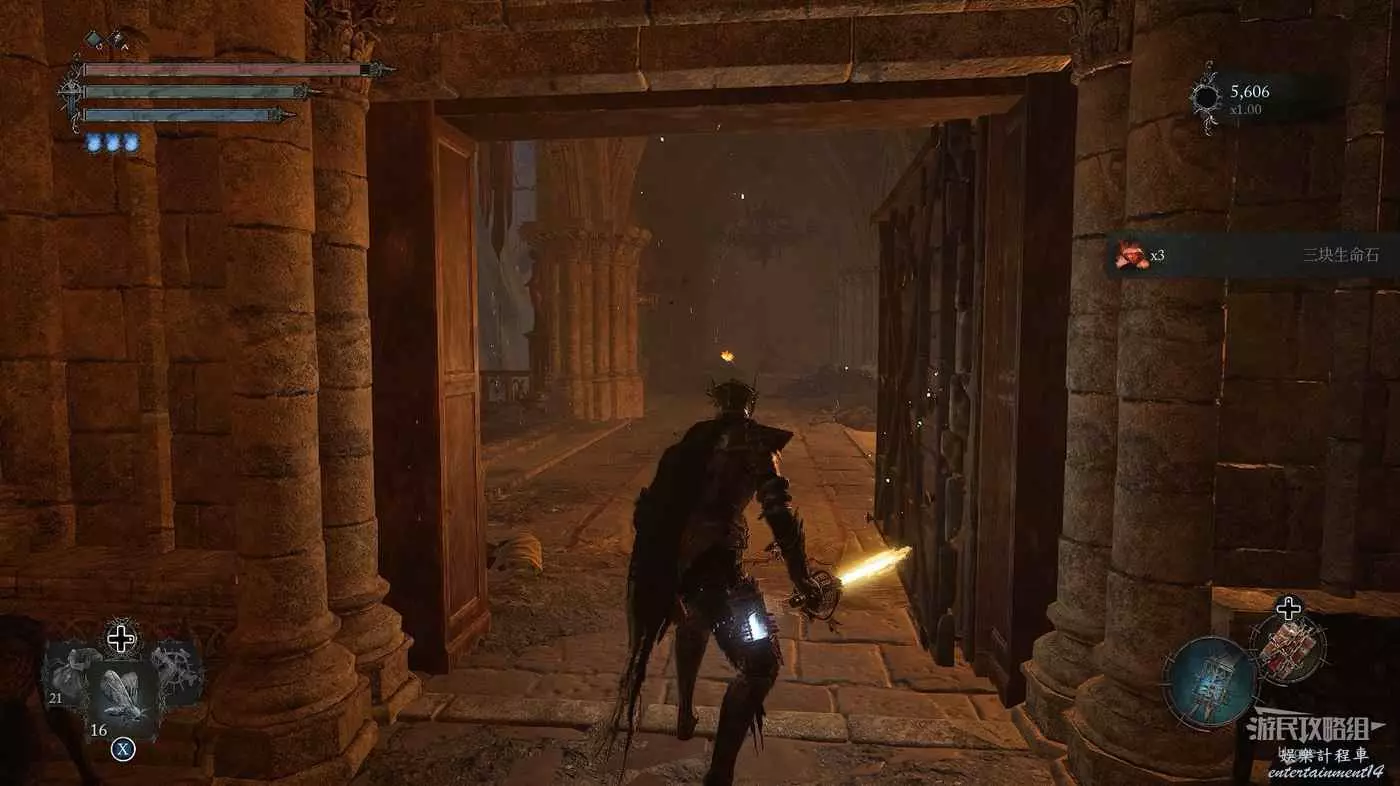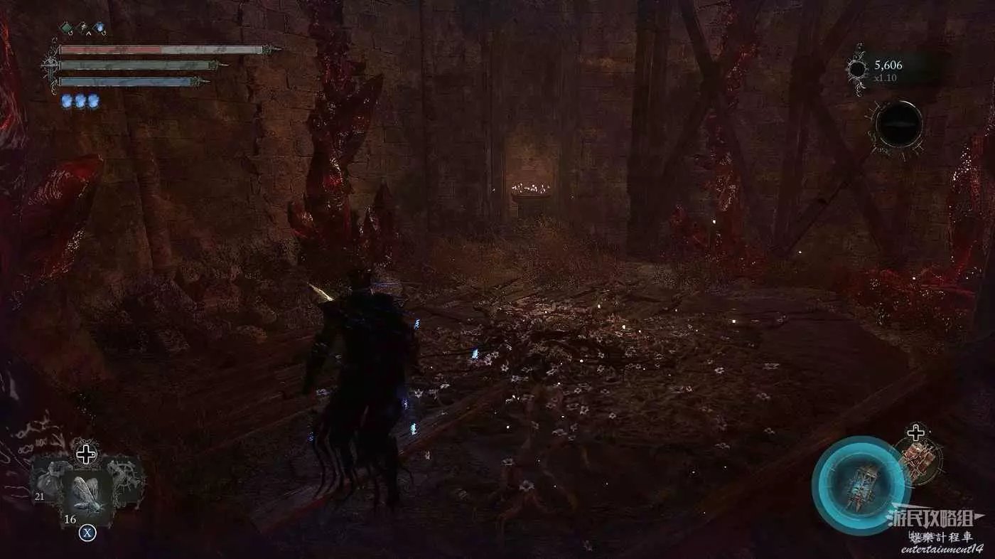 回到剛剛擊殺燃燒先知的平臺,前往城堡另一側的走廊,破壞木板進入後方的房間裡。