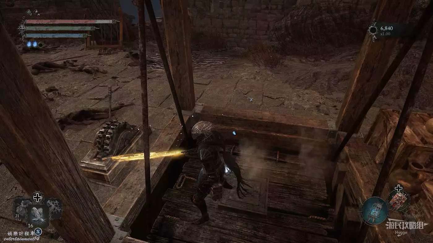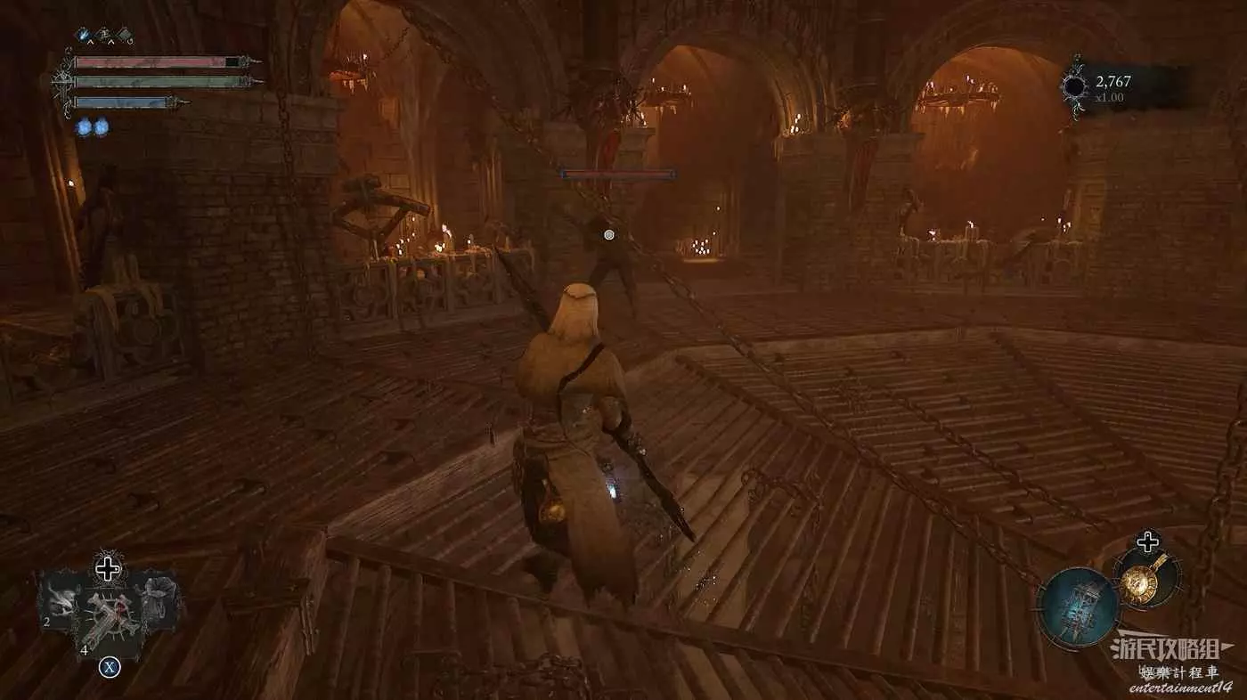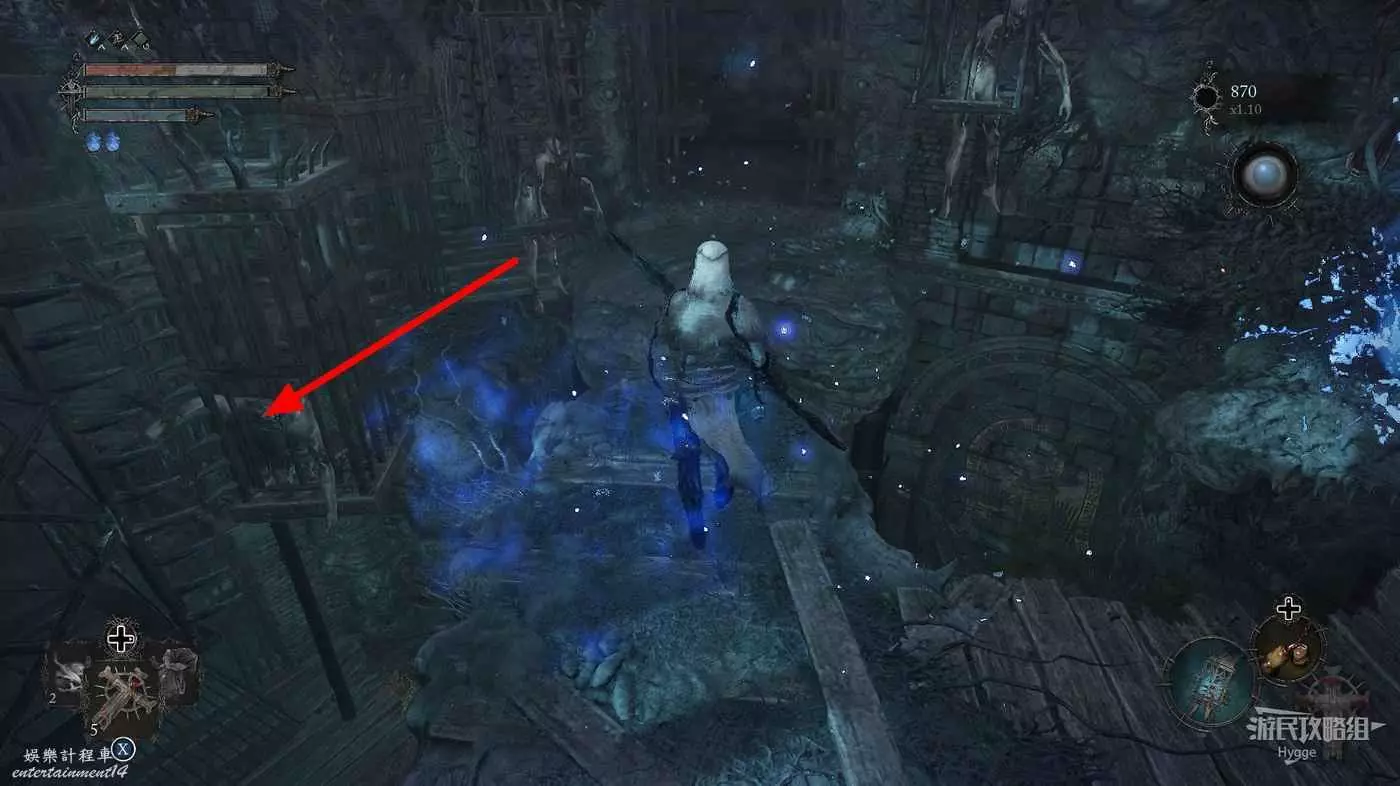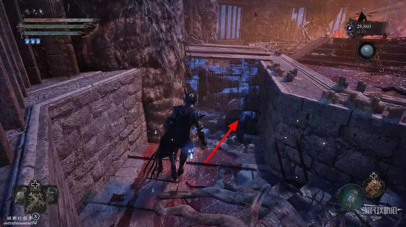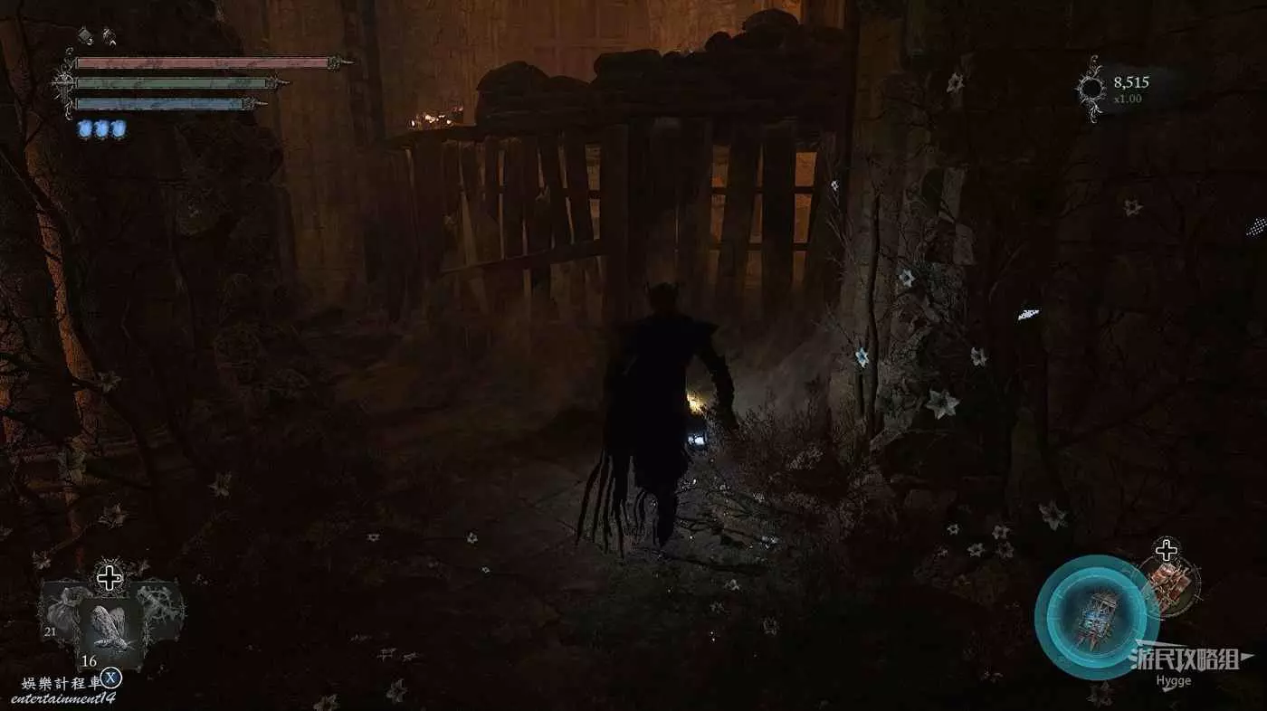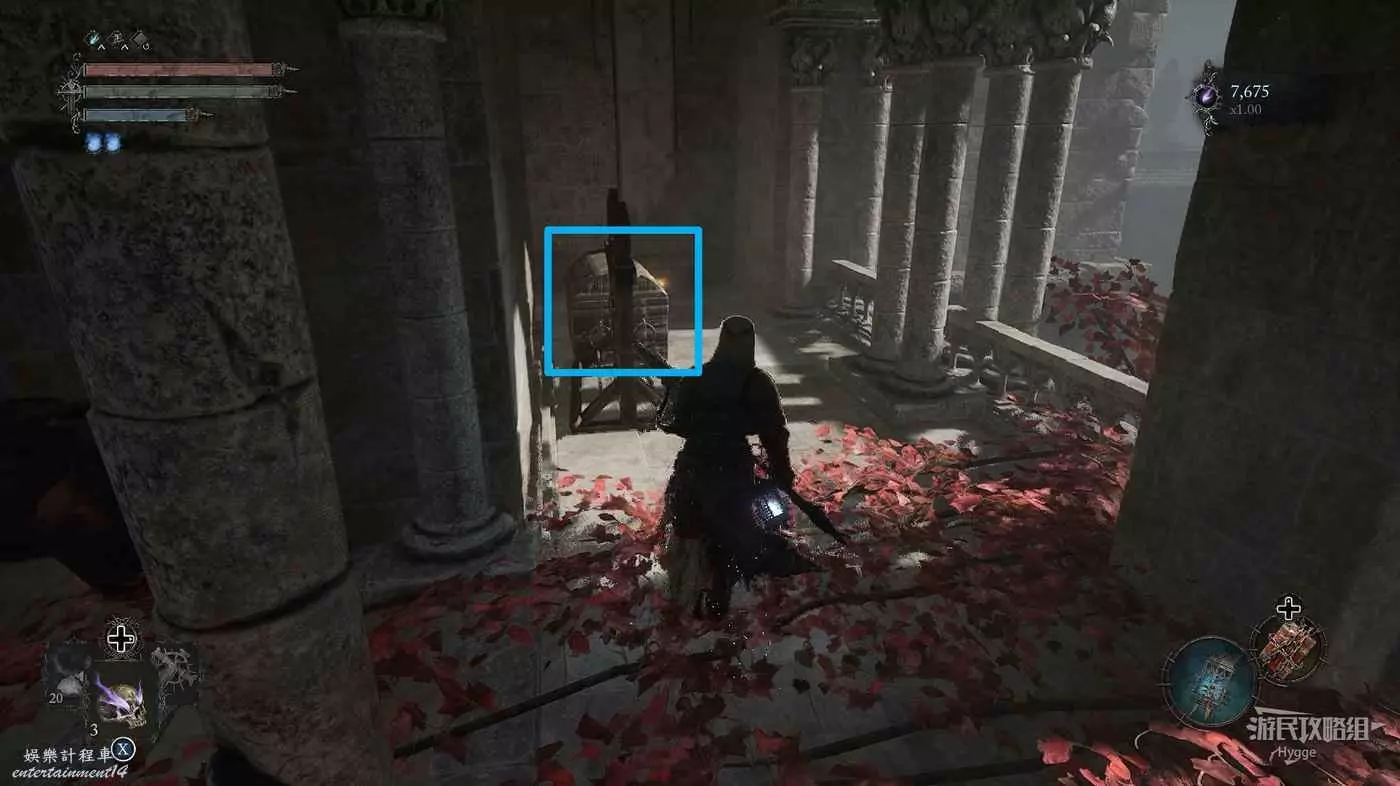 回到剛剛擊殺燃燒先知的平臺,前往城堡另一側的走廊,破壞木板進入後方的房間裡。