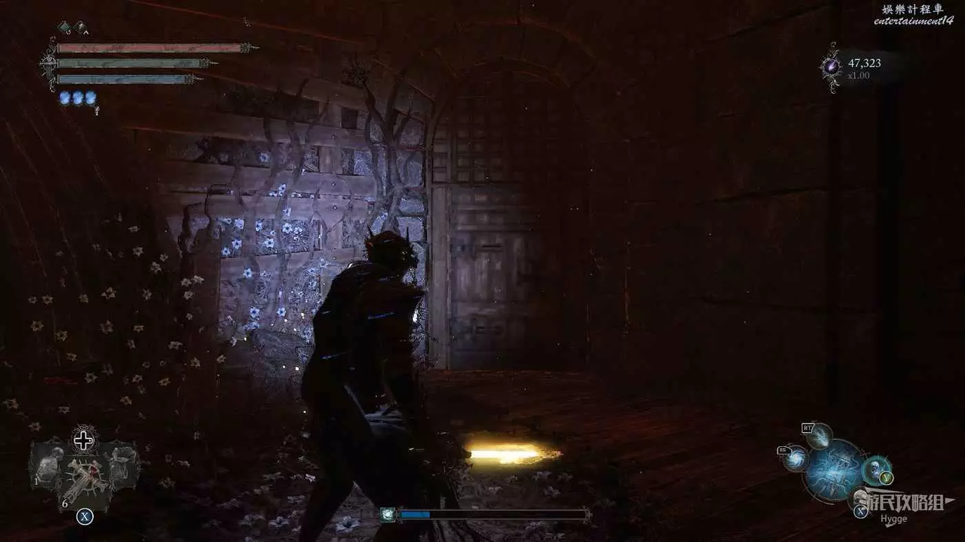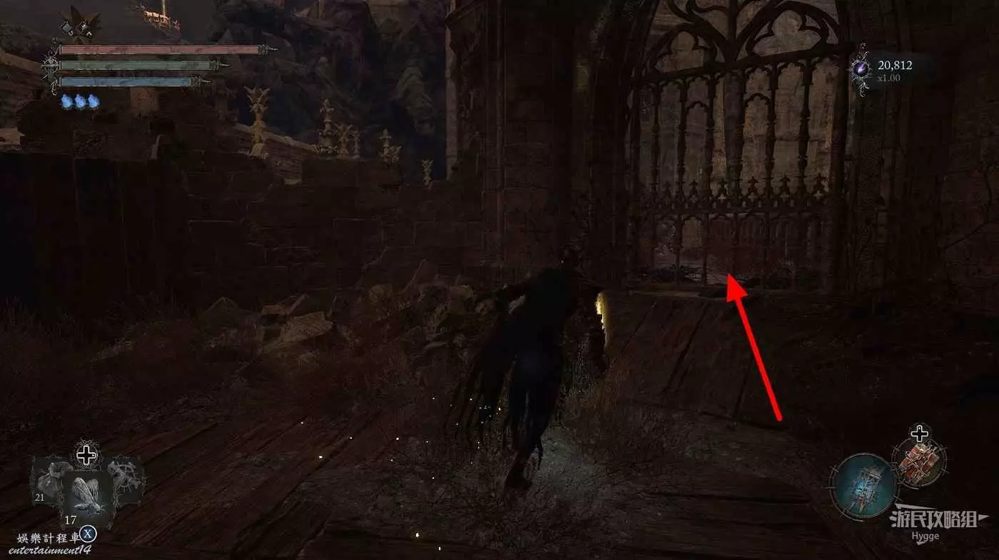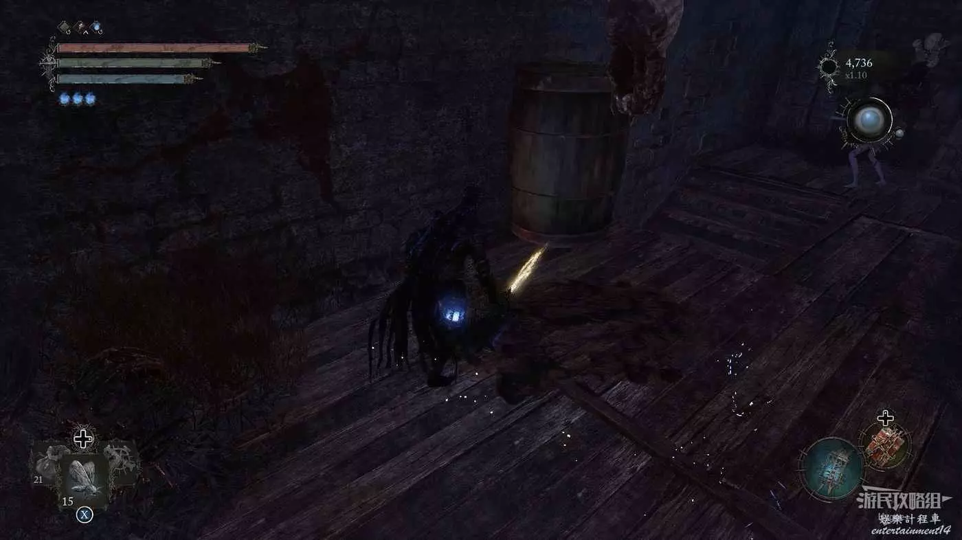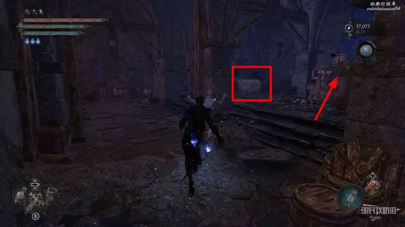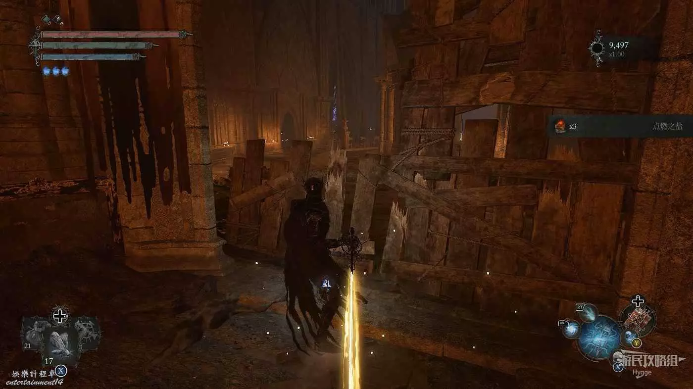 回到剛剛擊殺燃燒先知的平臺,前往城堡另一側的走廊,破壞木板進入後方的房間裡。
