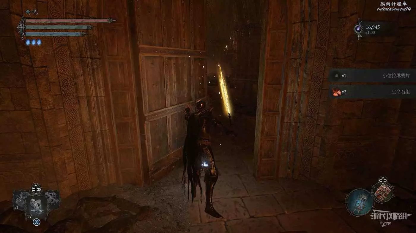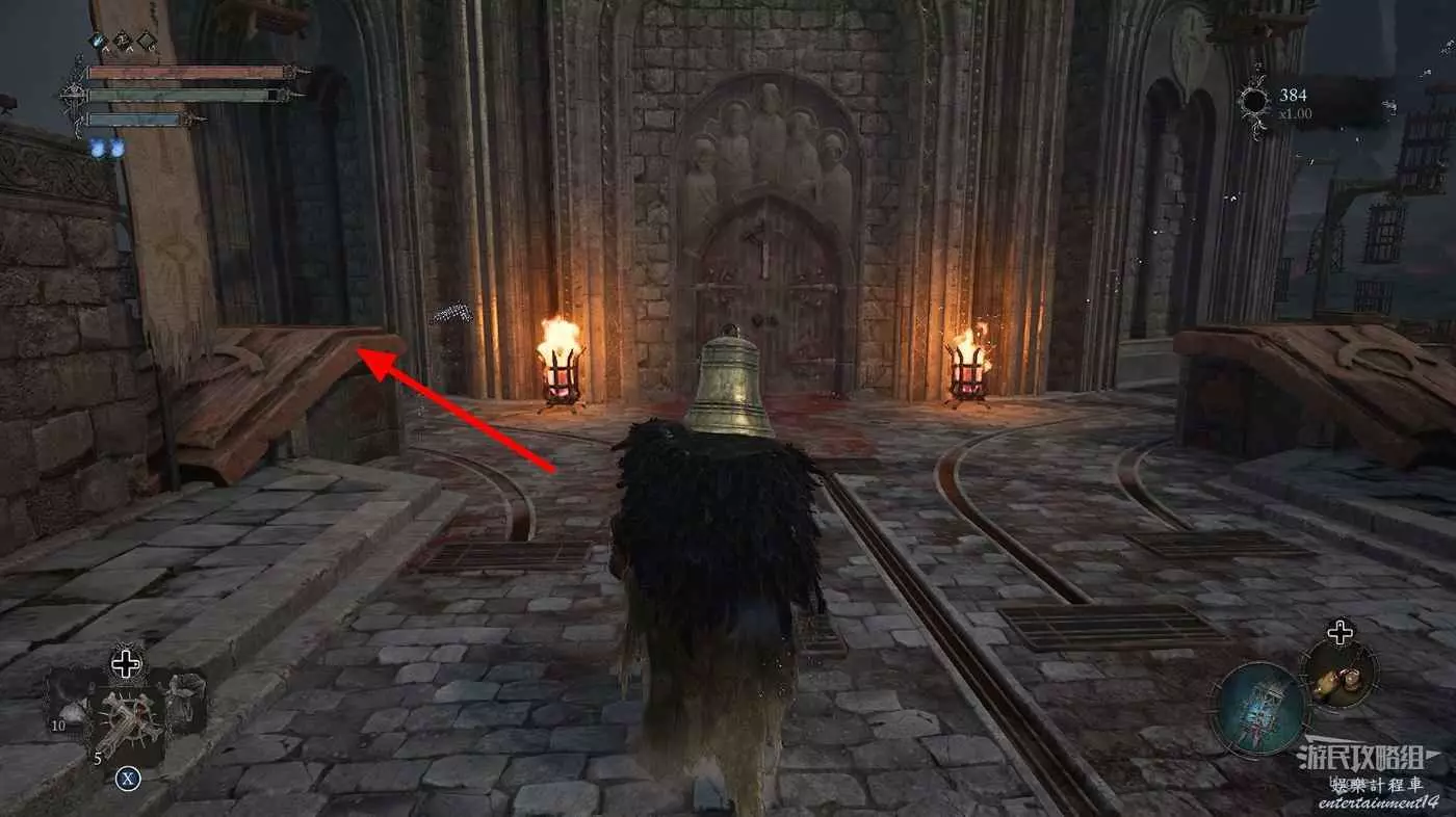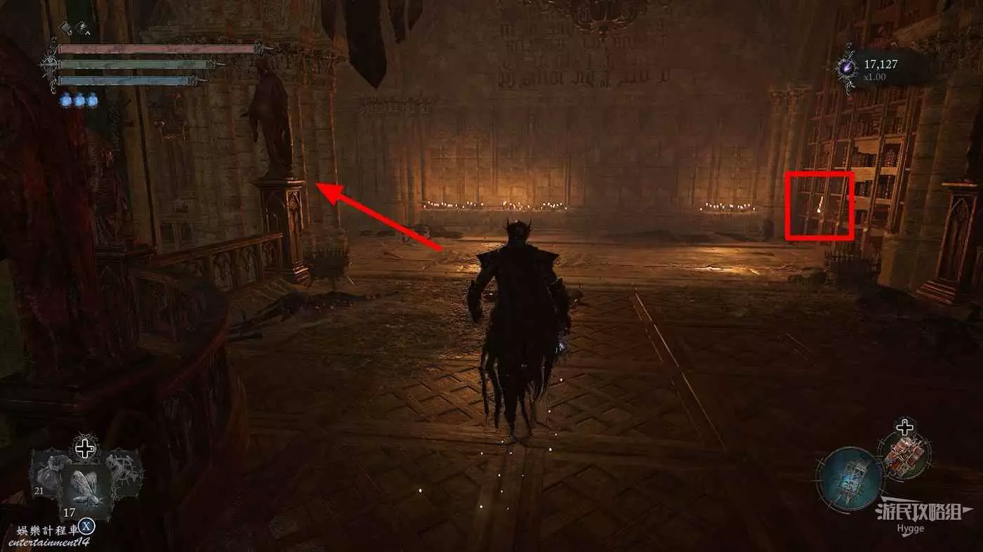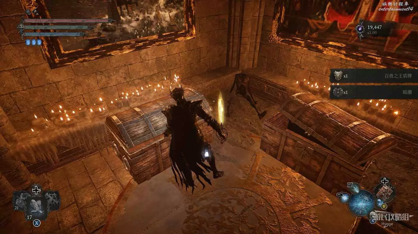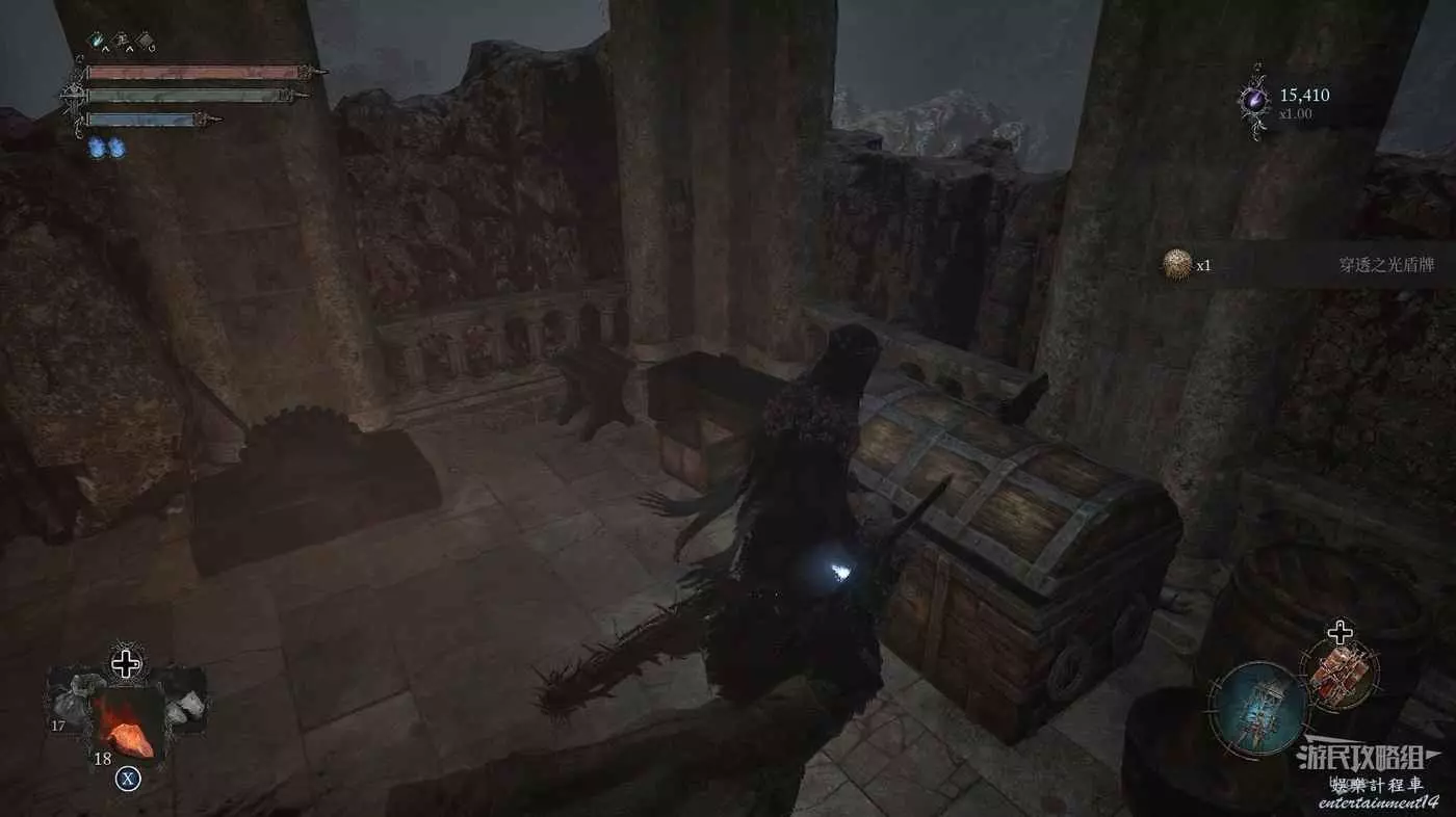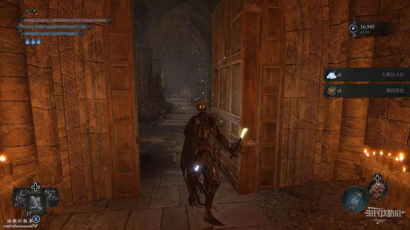 回到剛剛擊殺燃燒先知的平臺,前往城堡另一側的走廊,破壞木板進入後方的房間裡。