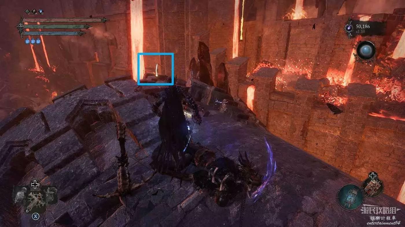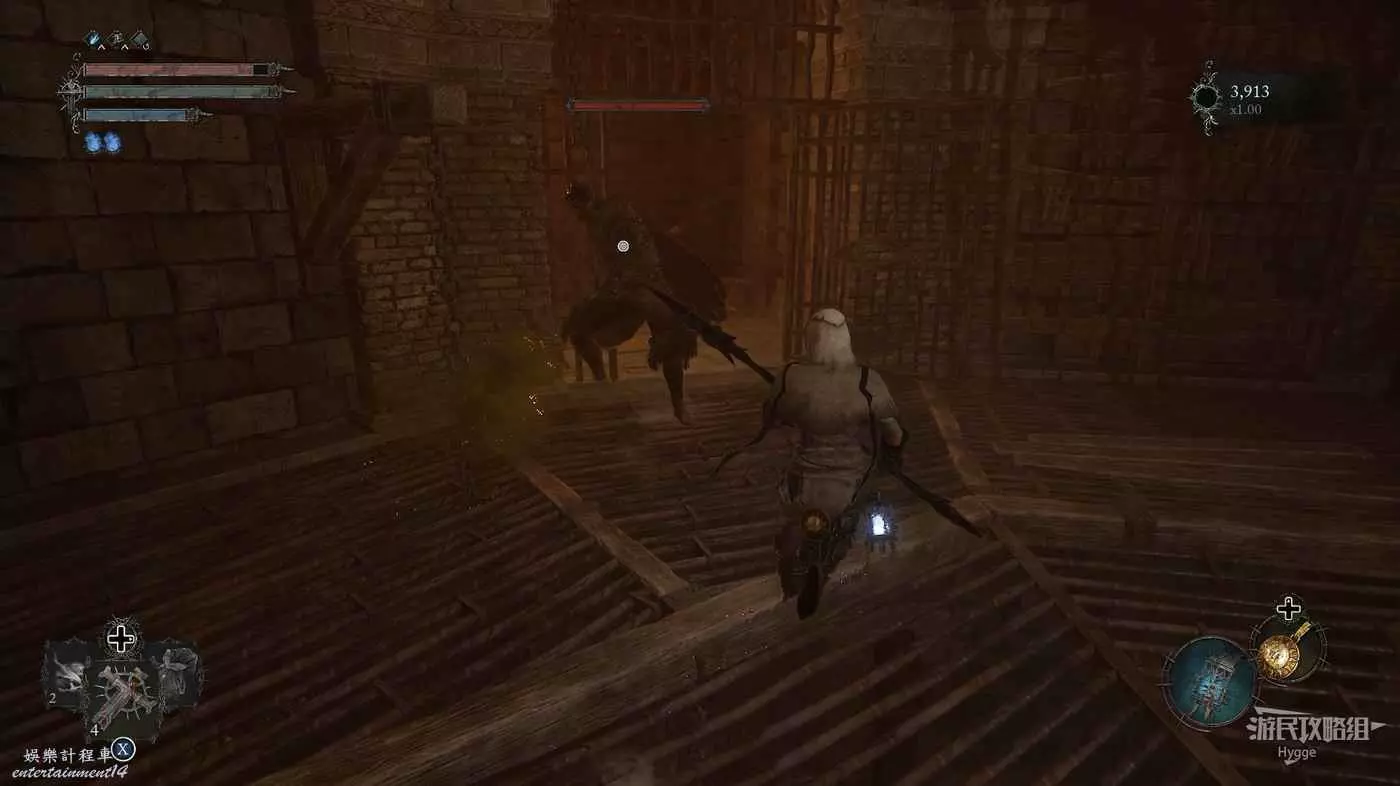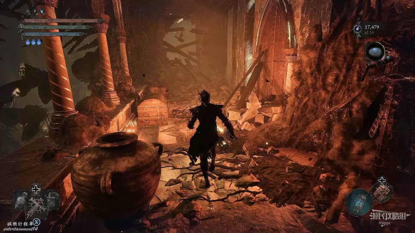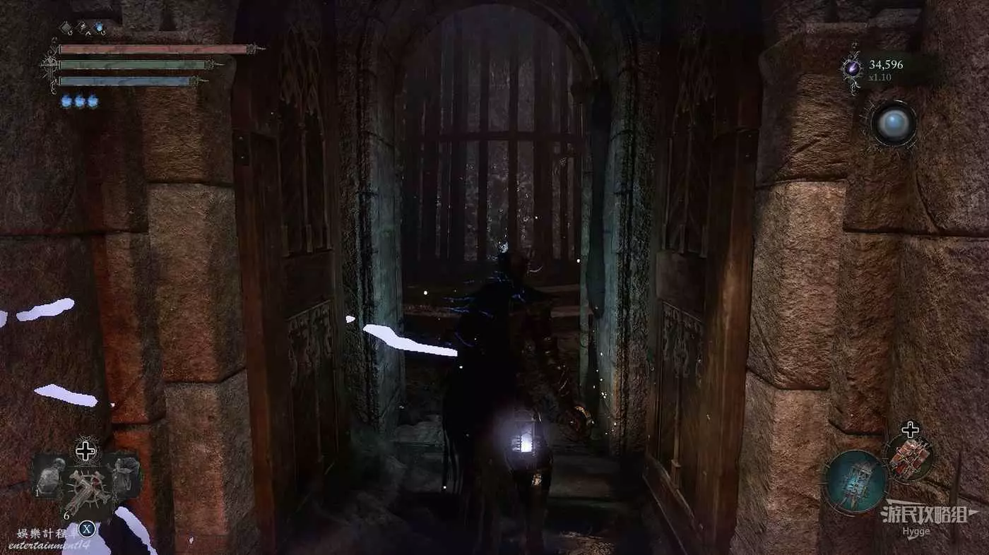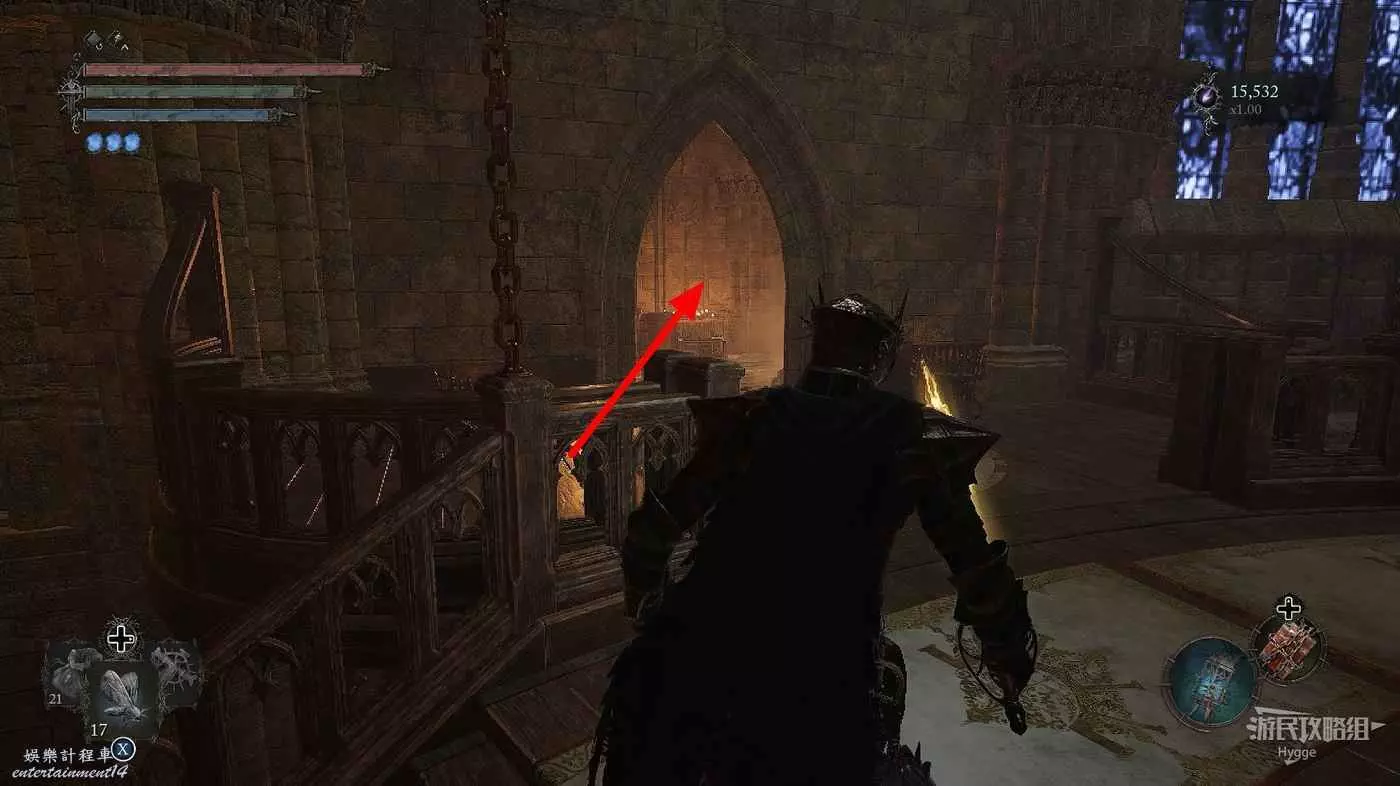 回到剛剛擊殺燃燒先知的平臺,前往城堡另一側的走廊,破壞木板進入後方的房間裡。