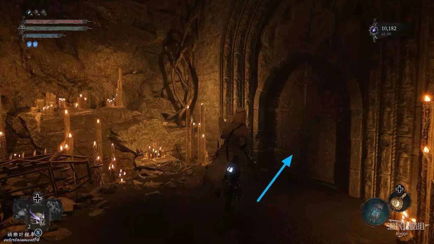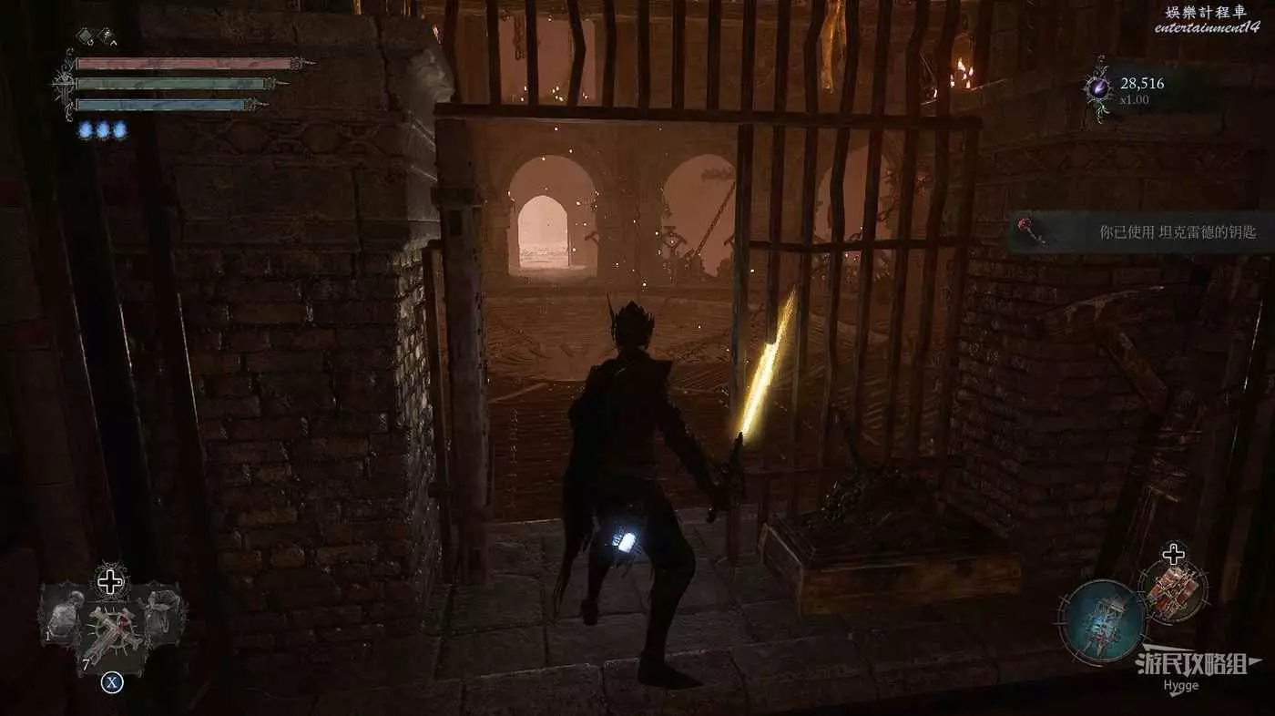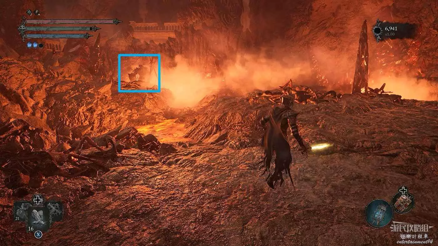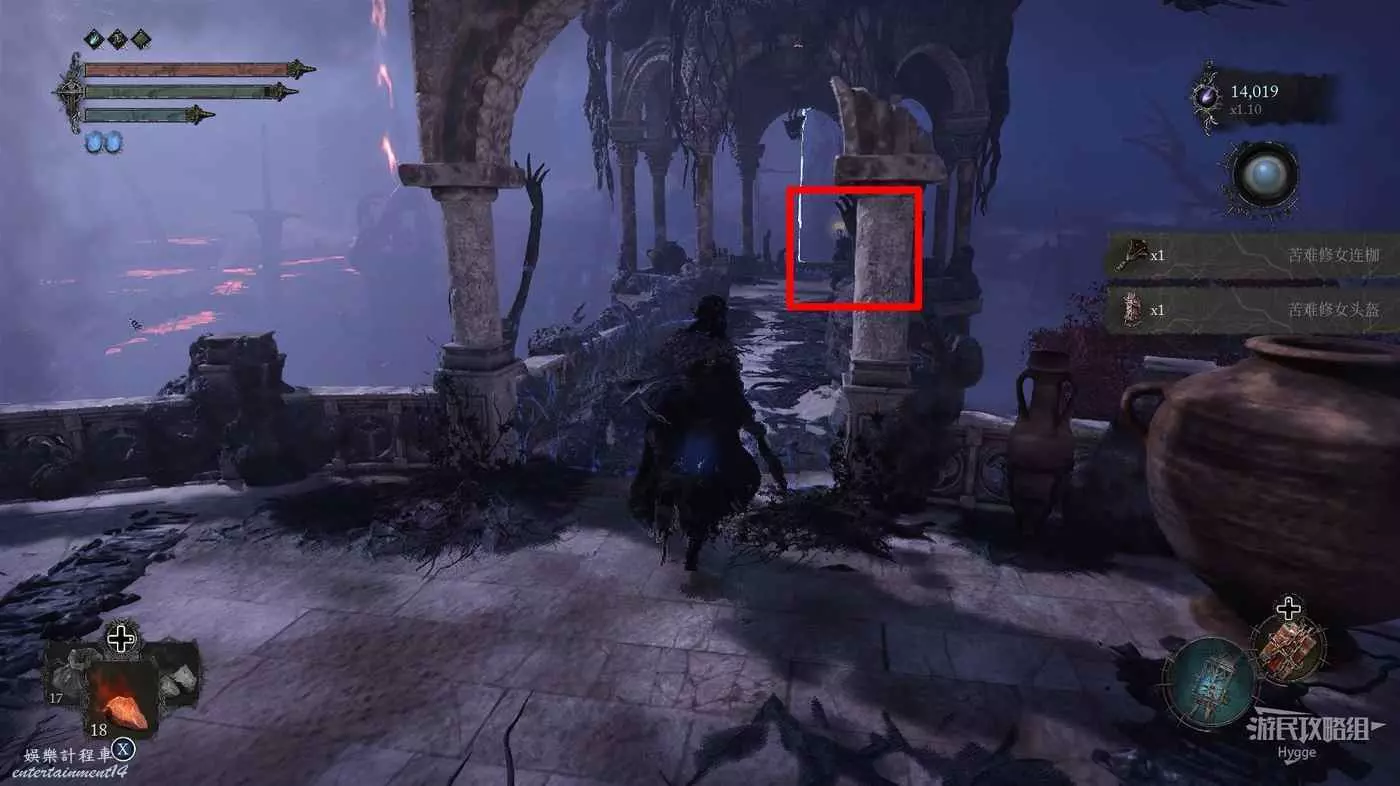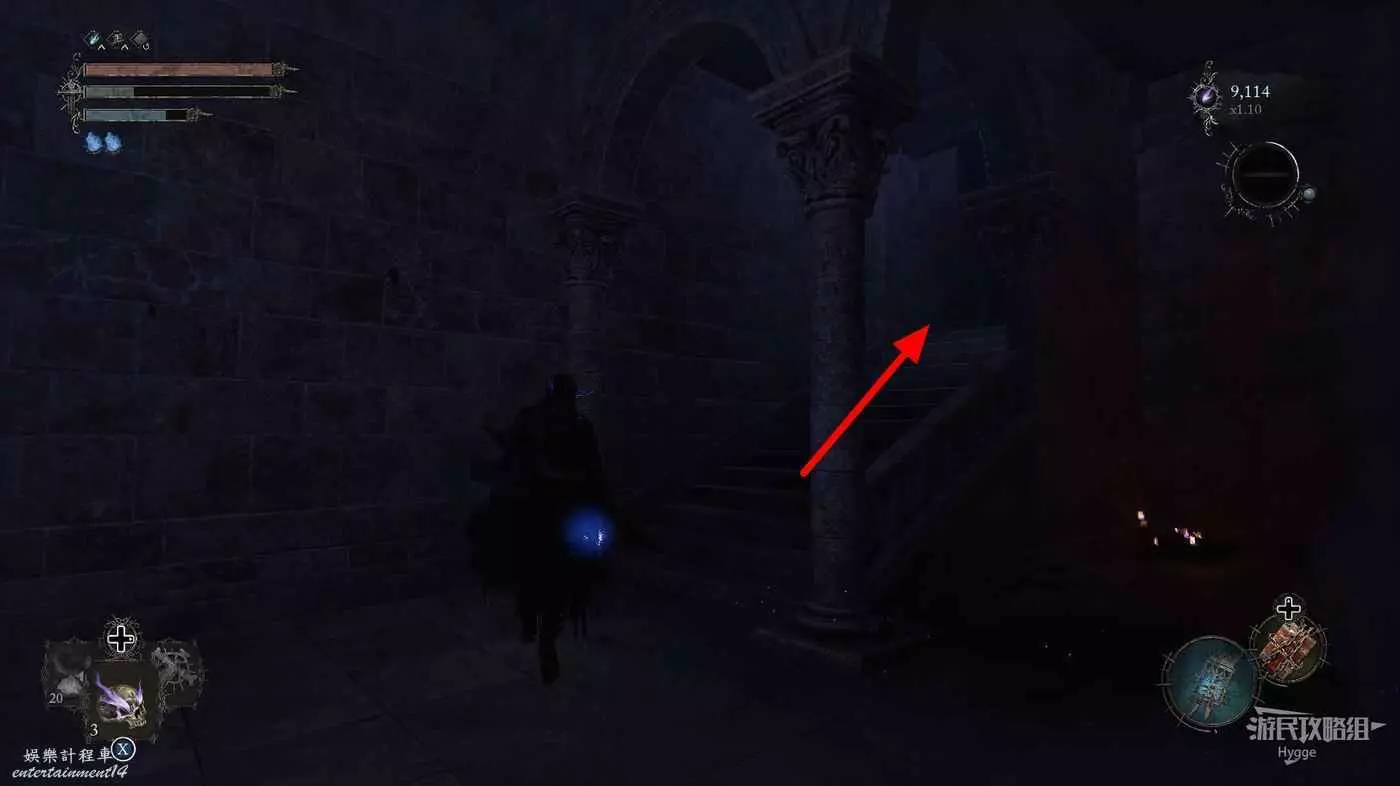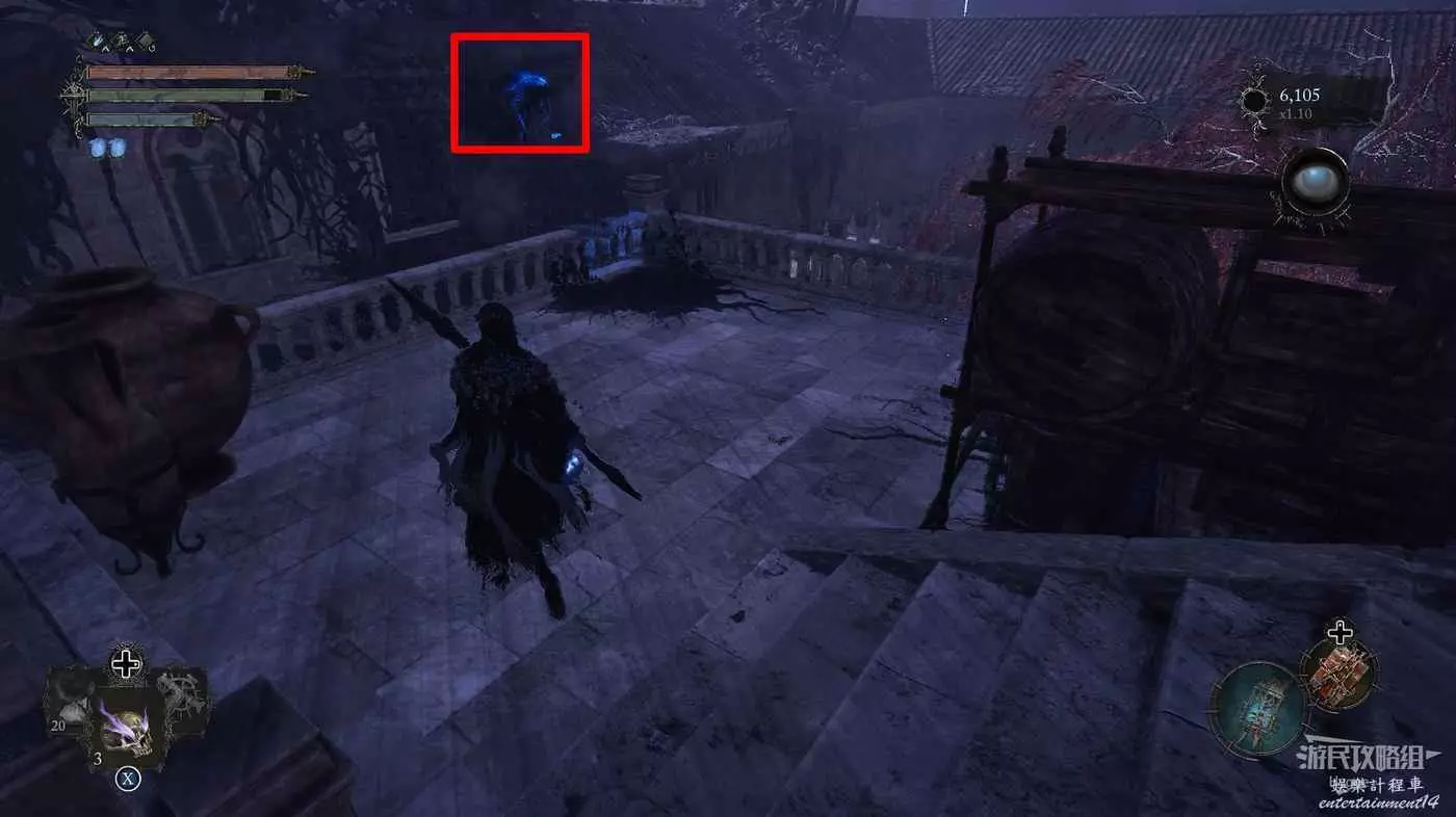 回到剛剛擊殺燃燒先知的平臺,前往城堡另一側的走廊,破壞木板進入後方的房間裡。