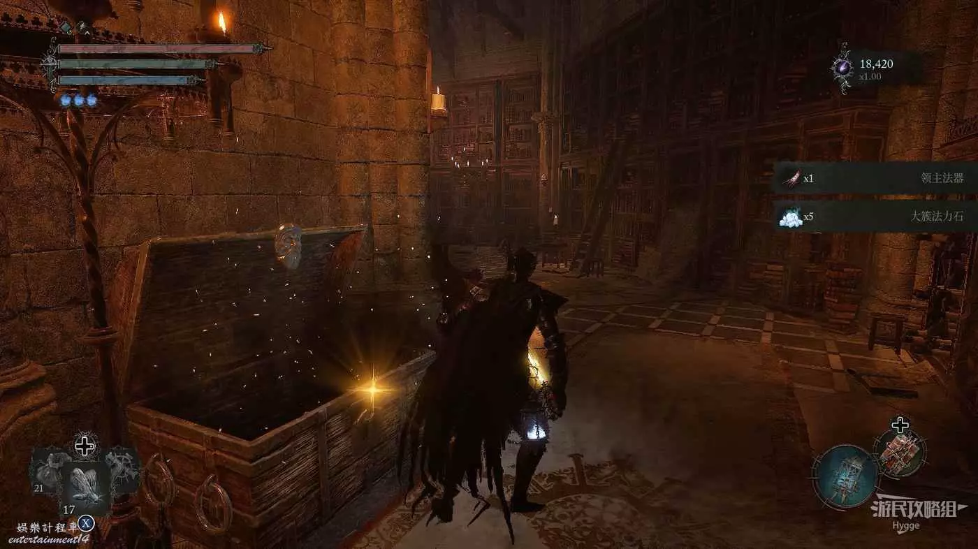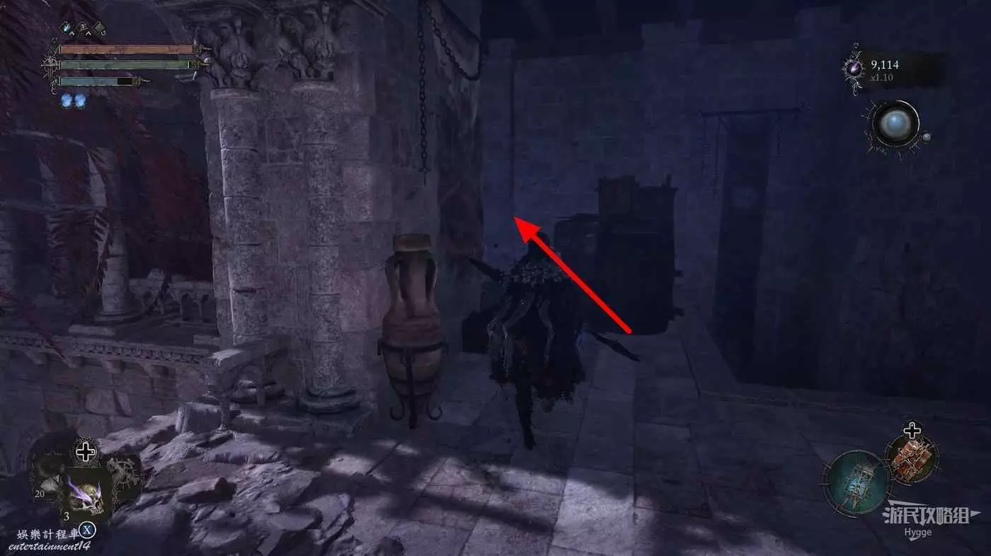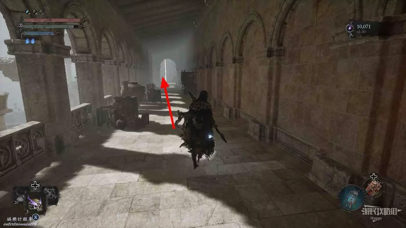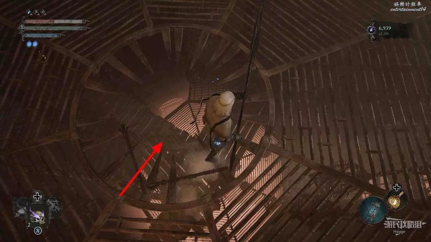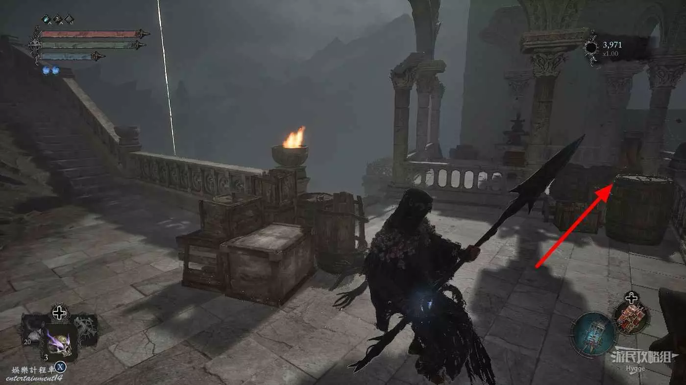 回到剛剛擊殺燃燒先知的平臺,前往城堡另一側的走廊,破壞木板進入後方的房間裡。