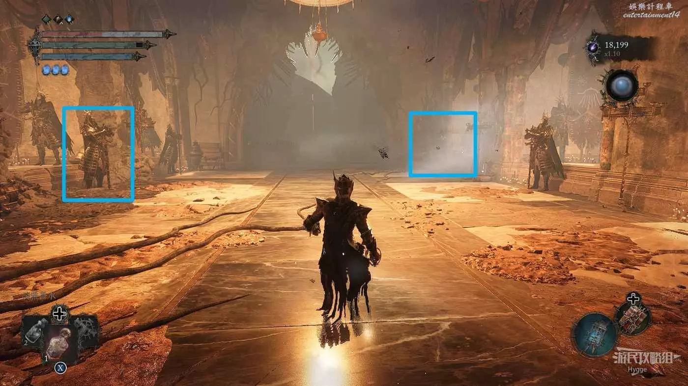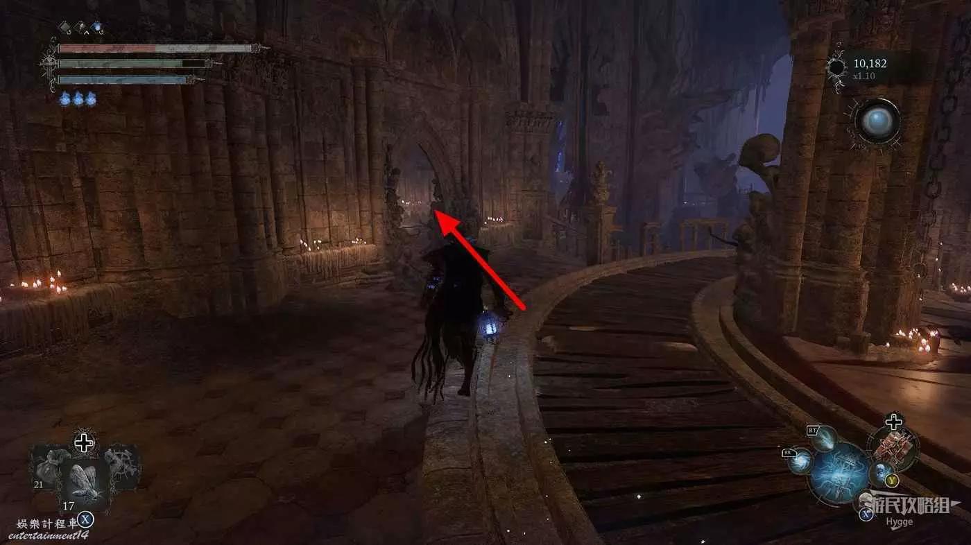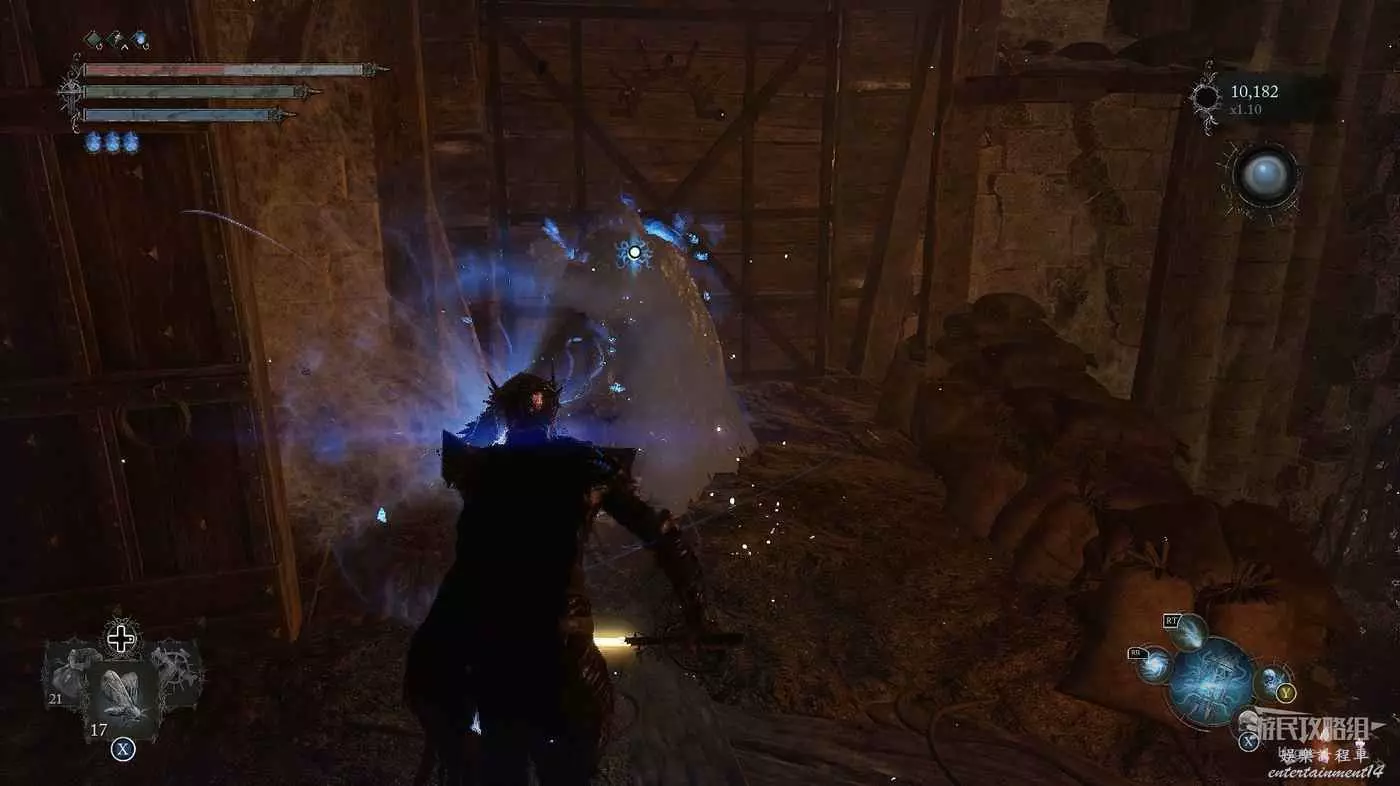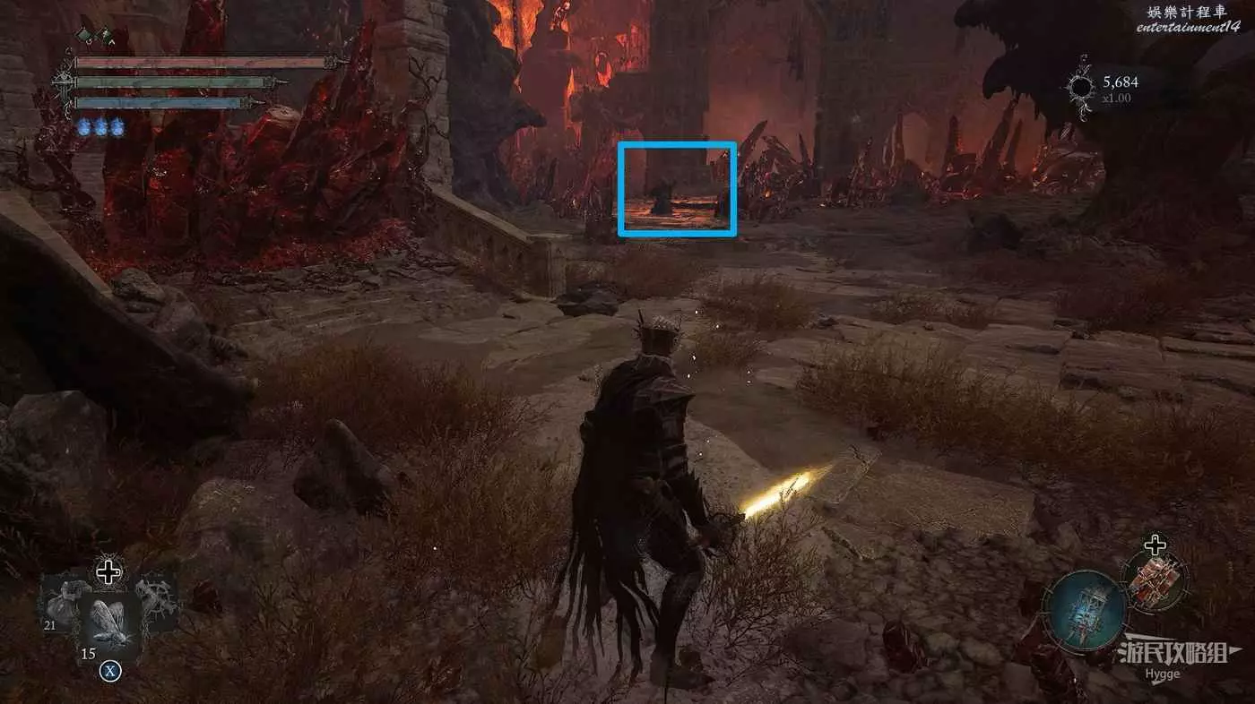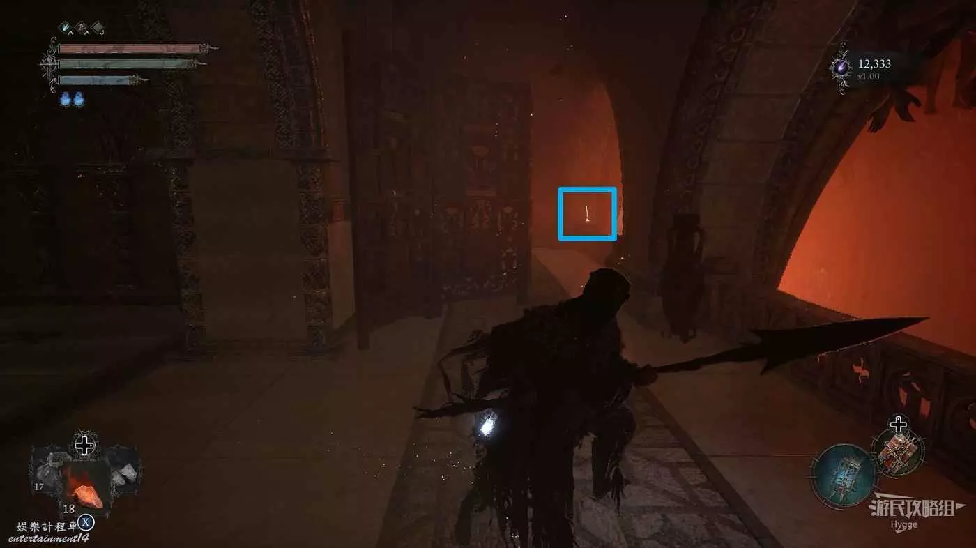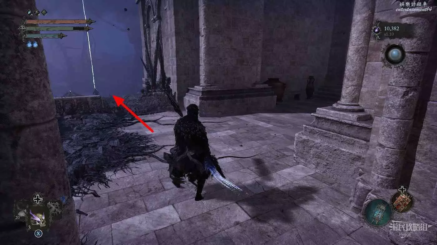 回到剛剛擊殺燃燒先知的平臺,前往城堡另一側的走廊,破壞木板進入後方的房間裡。
