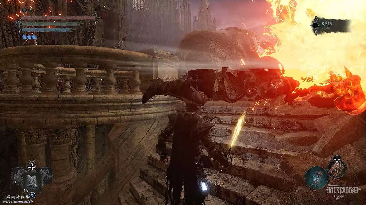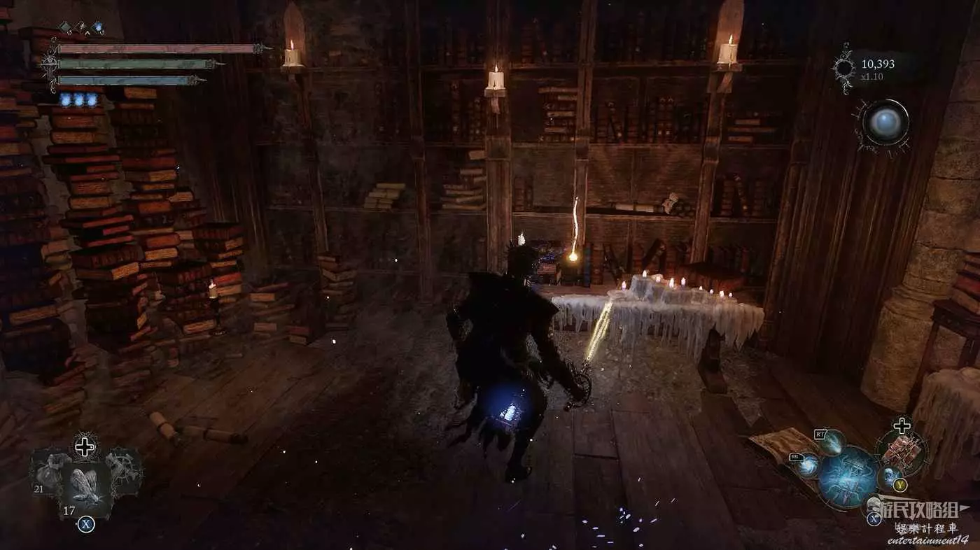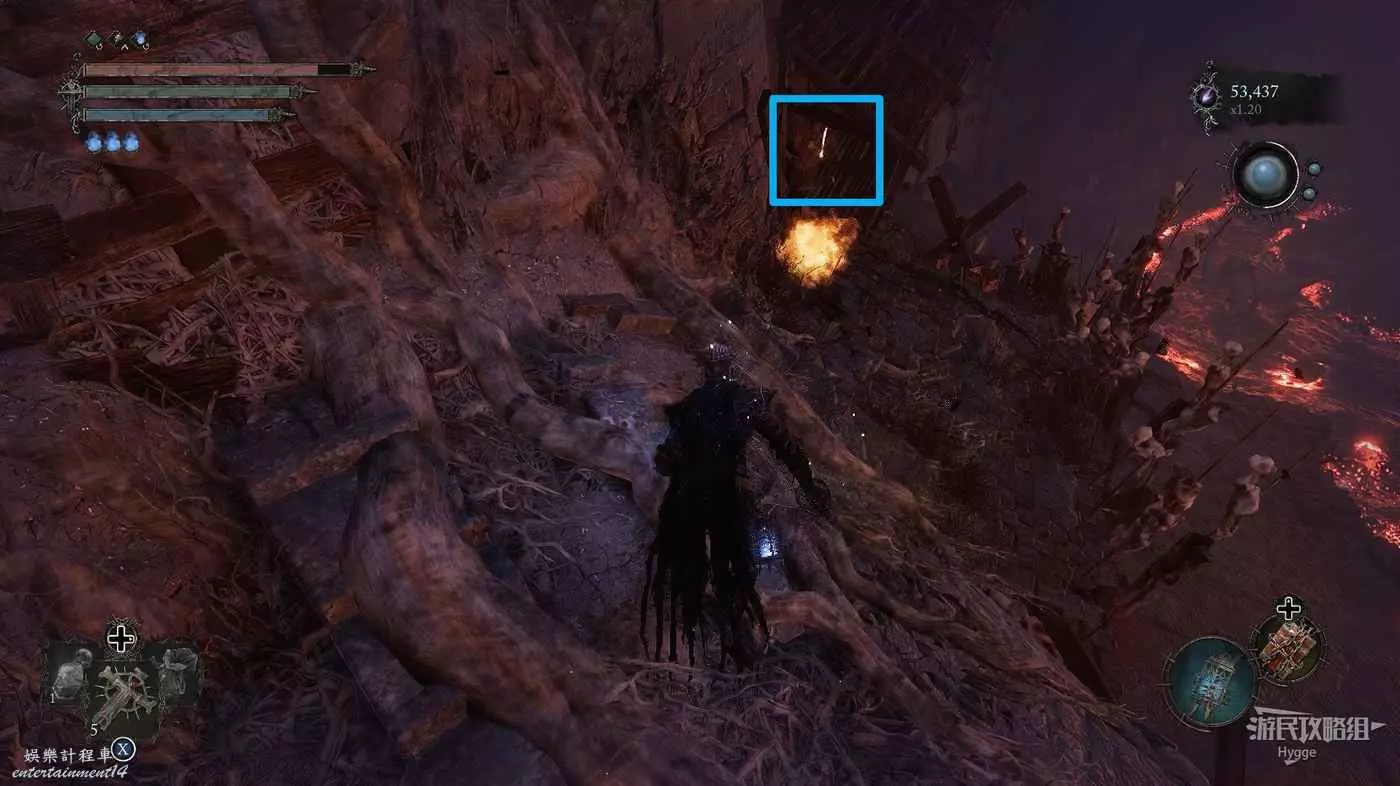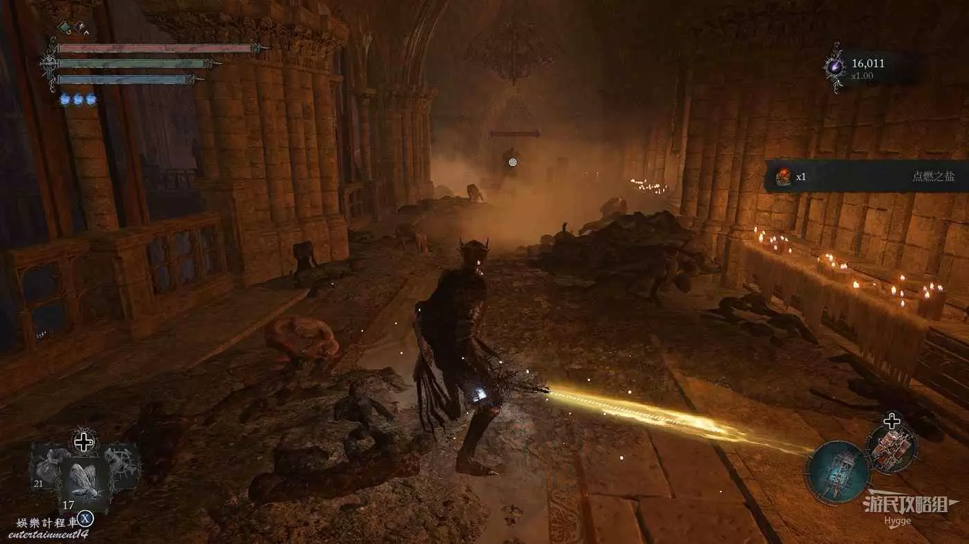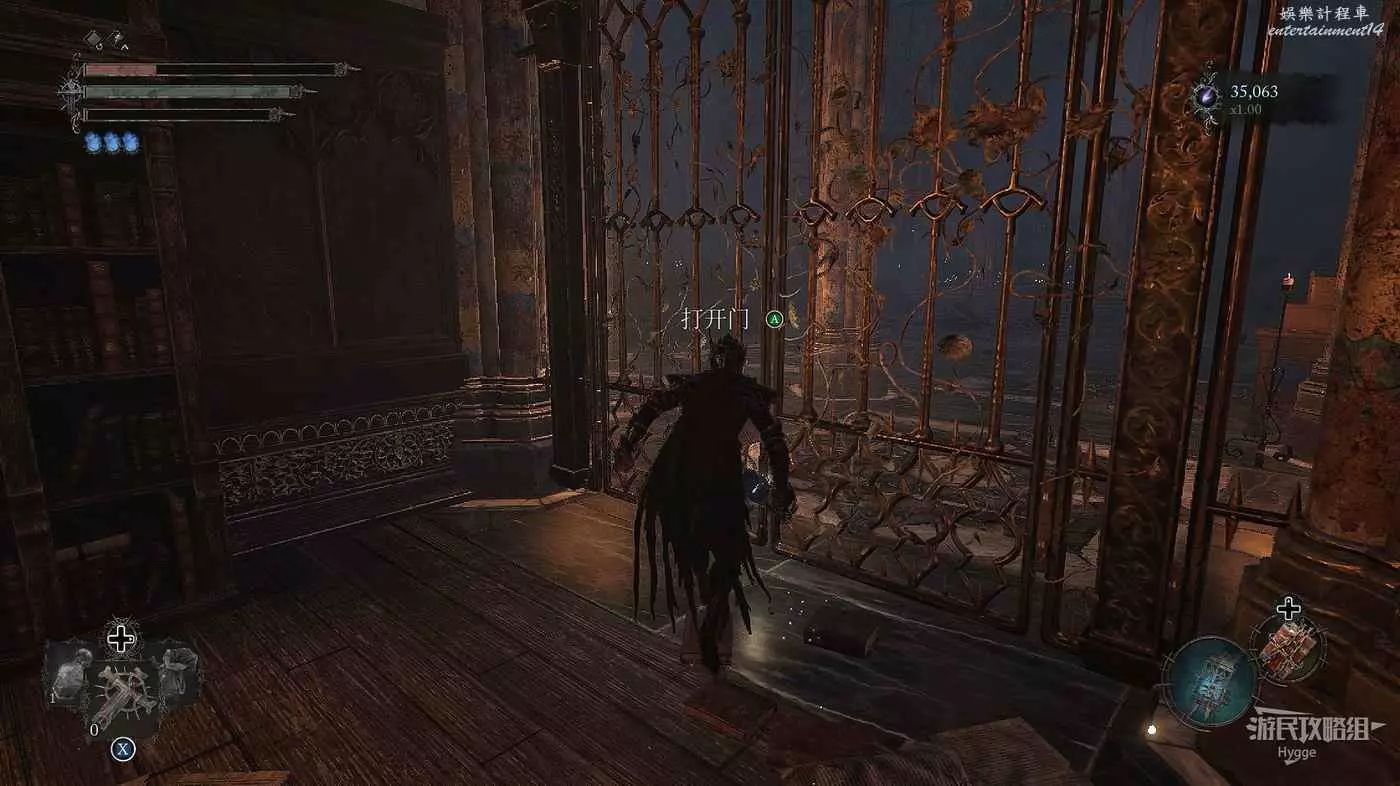 回到剛剛擊殺燃燒先知的平臺,前往城堡另一側的走廊,破壞木板進入後方的房間裡。