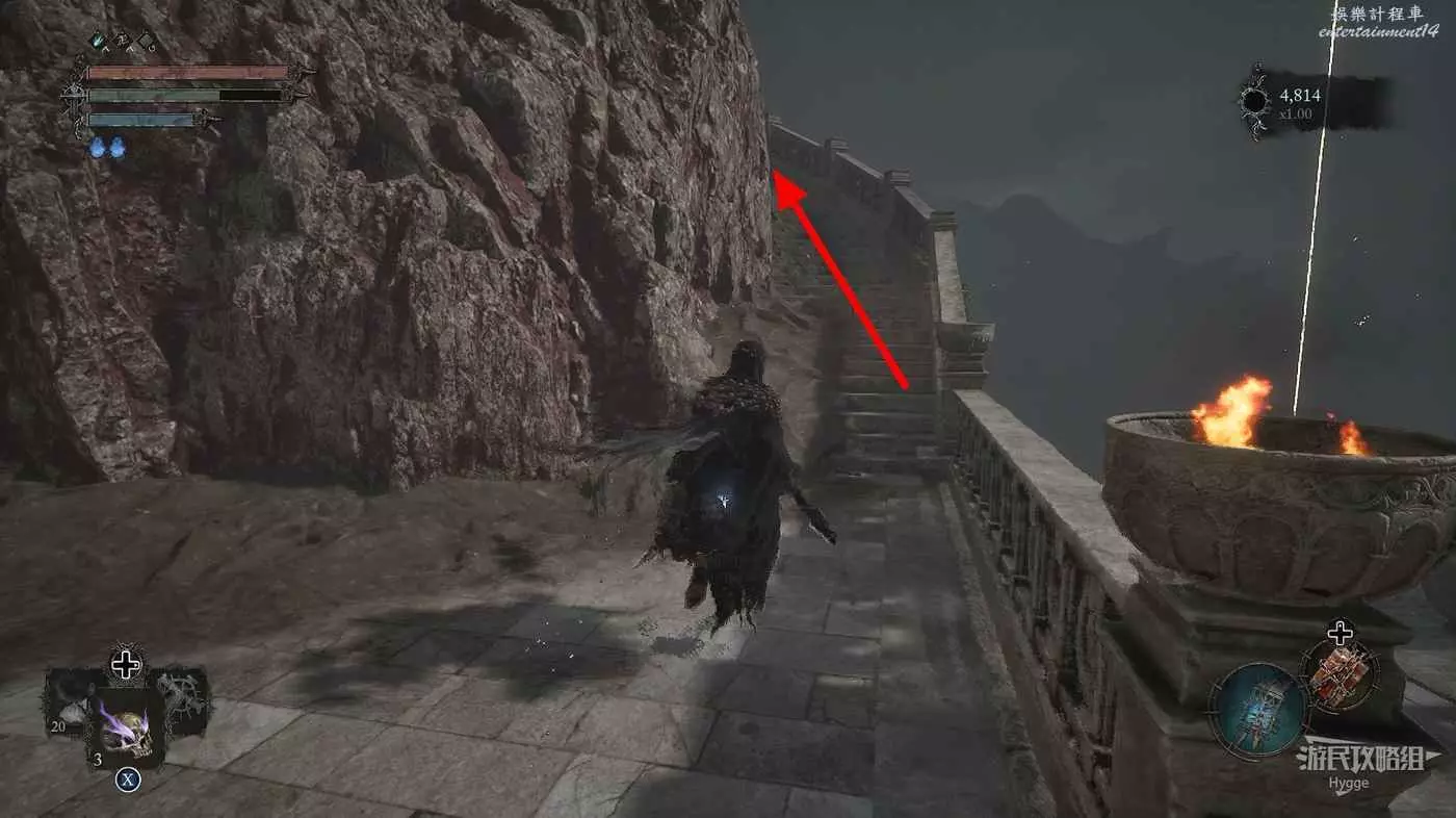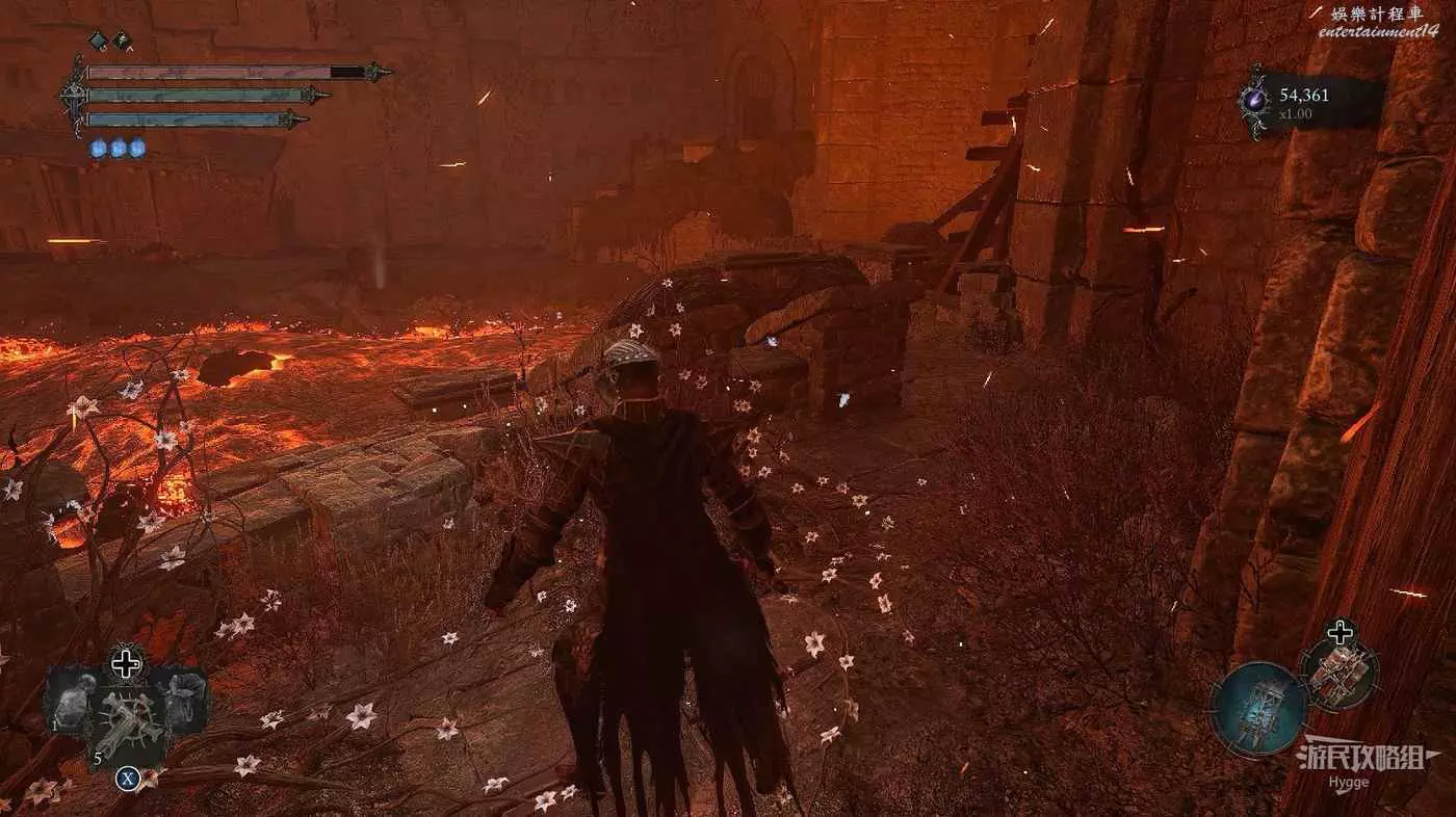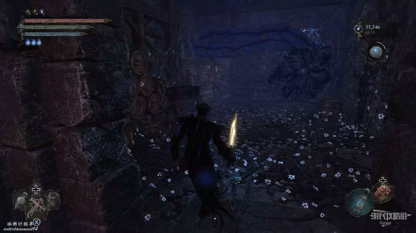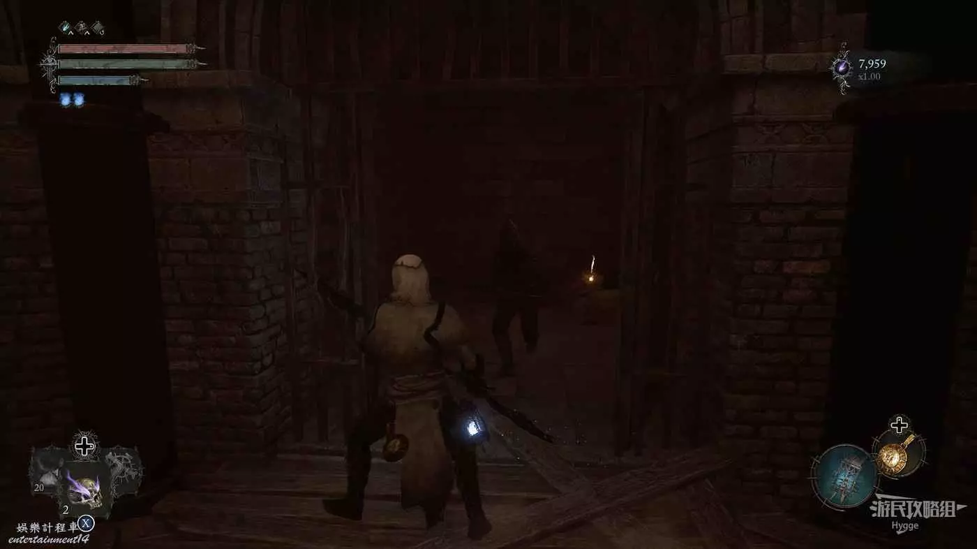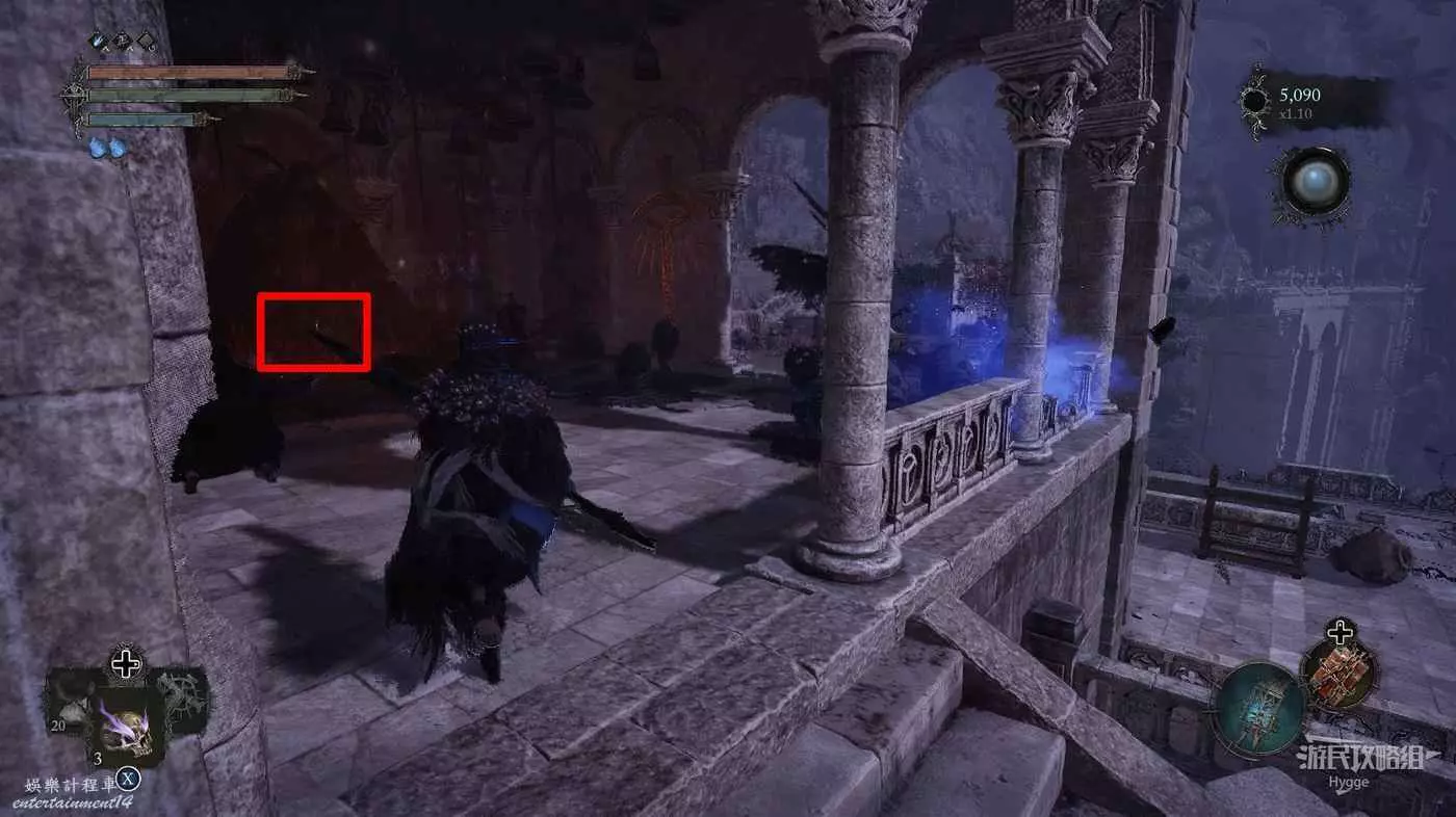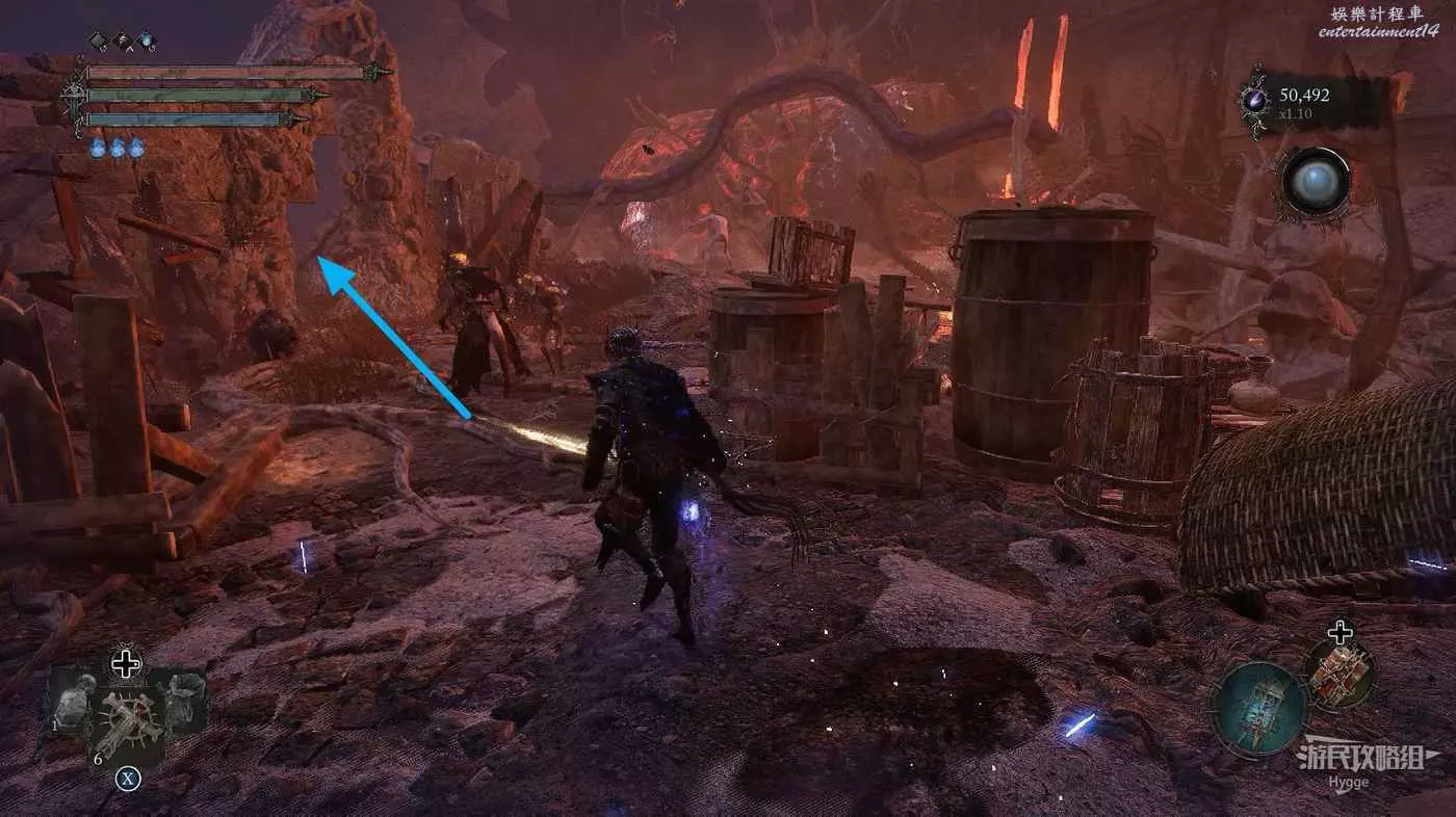 回到剛剛擊殺燃燒先知的平臺,前往城堡另一側的走廊,破壞木板進入後方的房間裡。