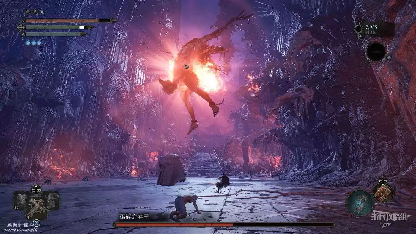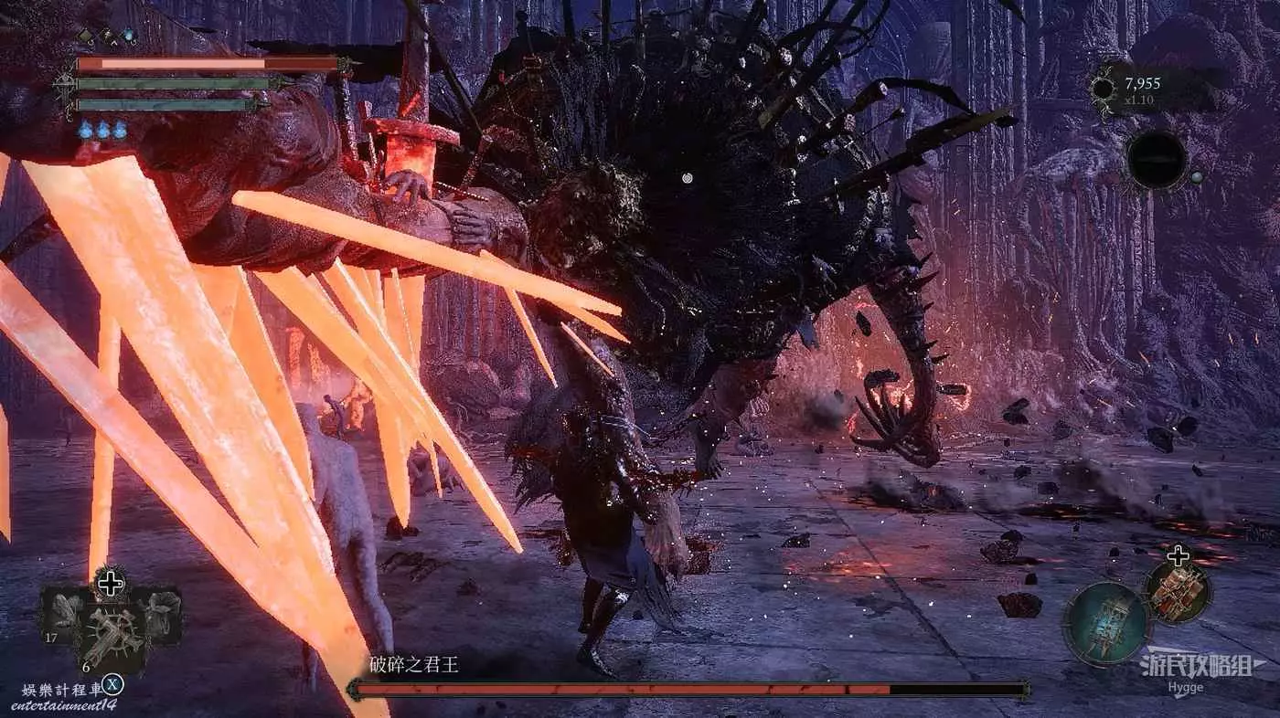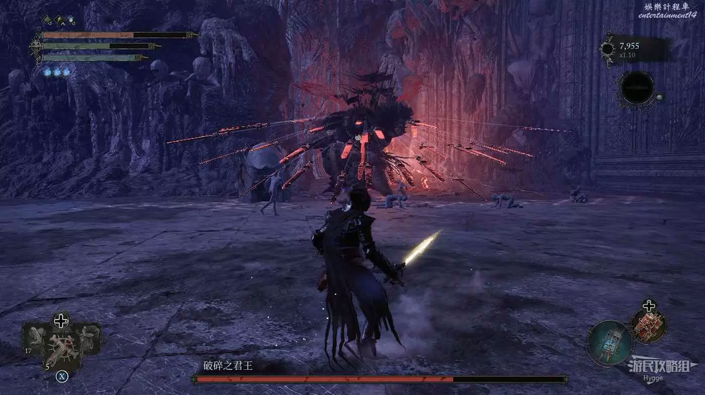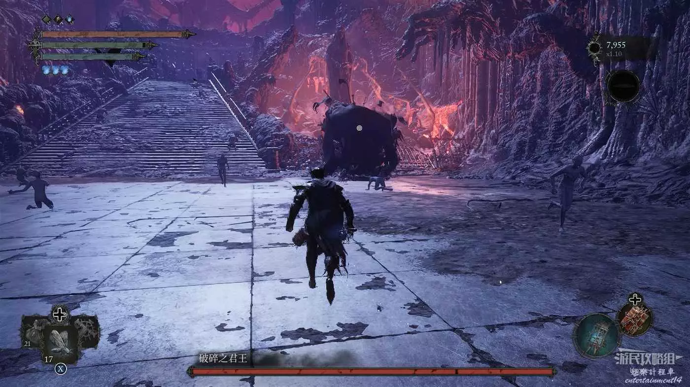 沿著平臺繼續向上,進入BOSS戰。此處的BOSS為【破碎之君王】,在剛剛進入戰鬥時破碎君王會背對我們,此時可以先上去偷幾刀。
