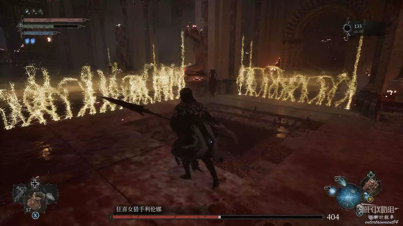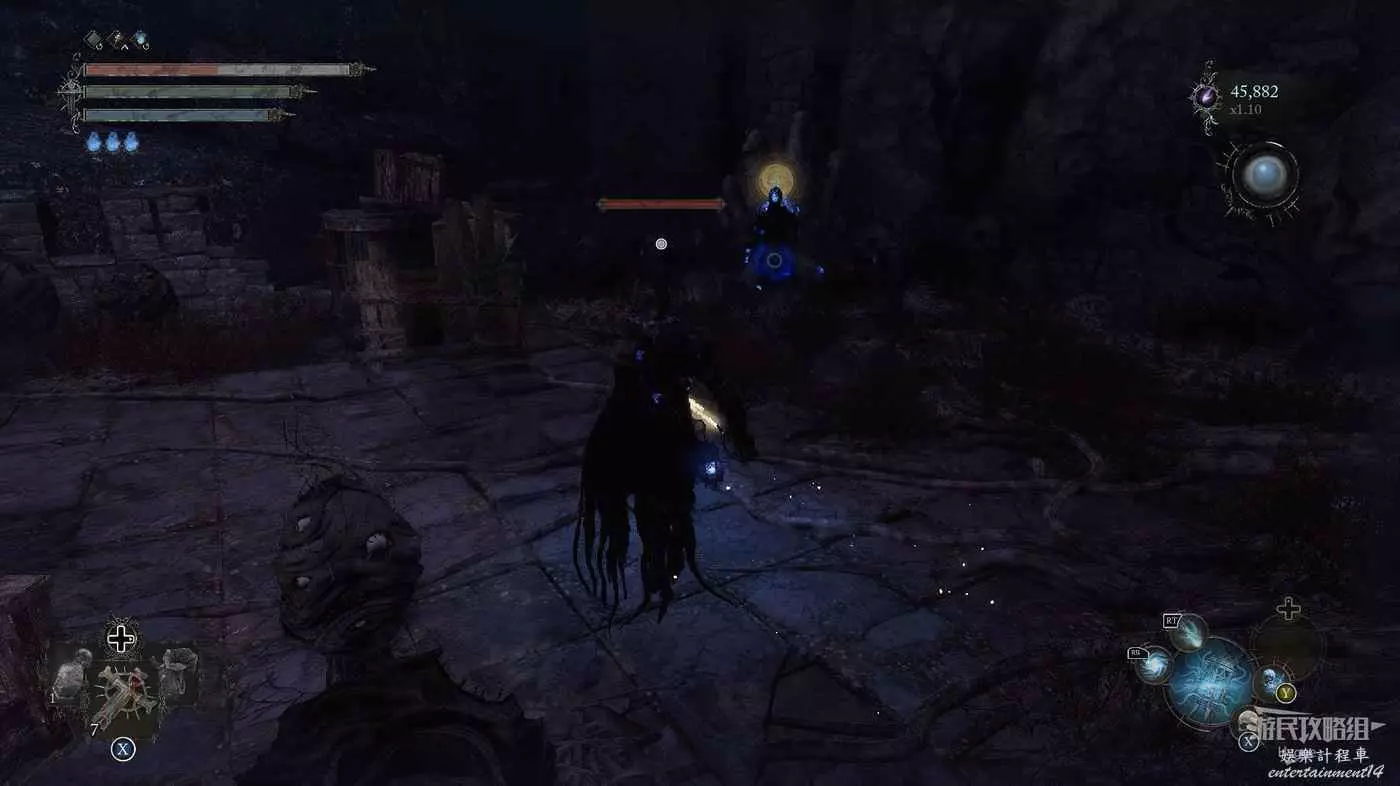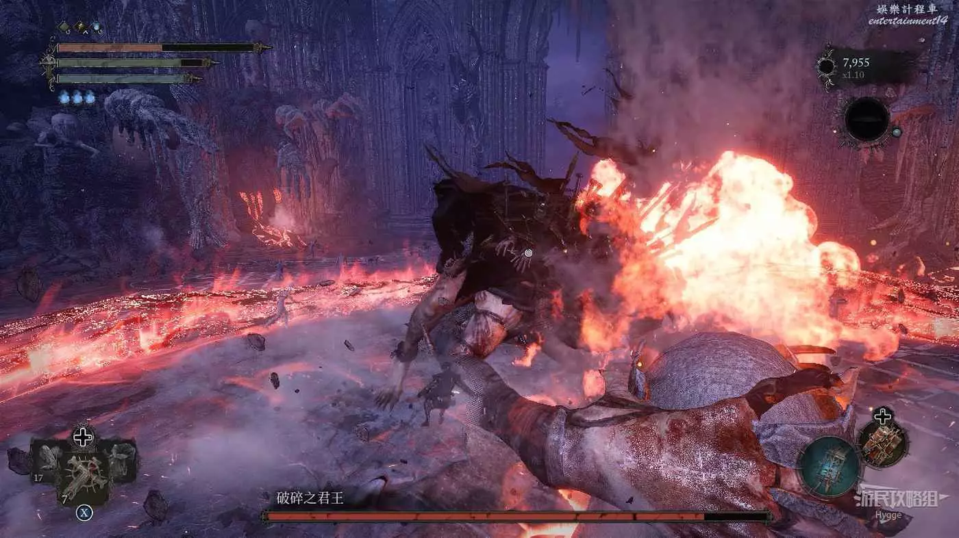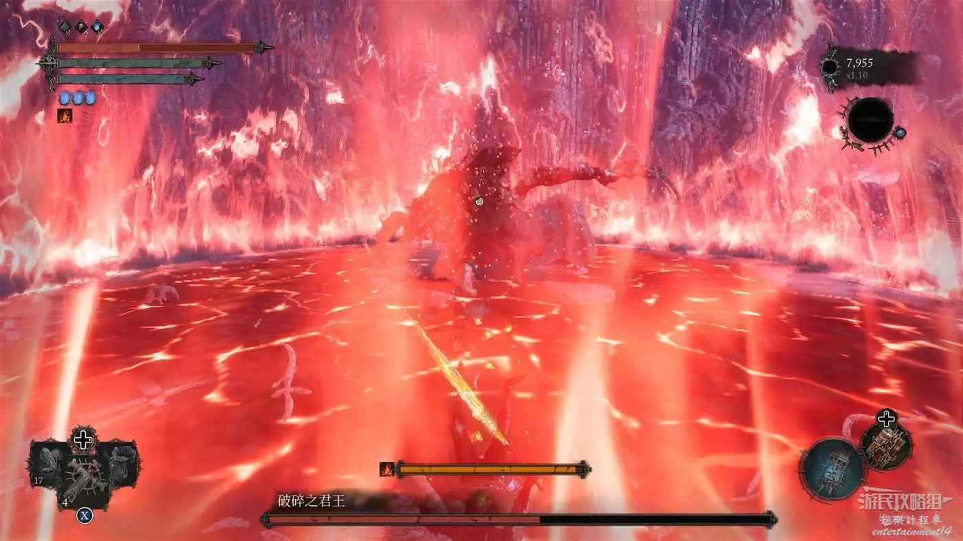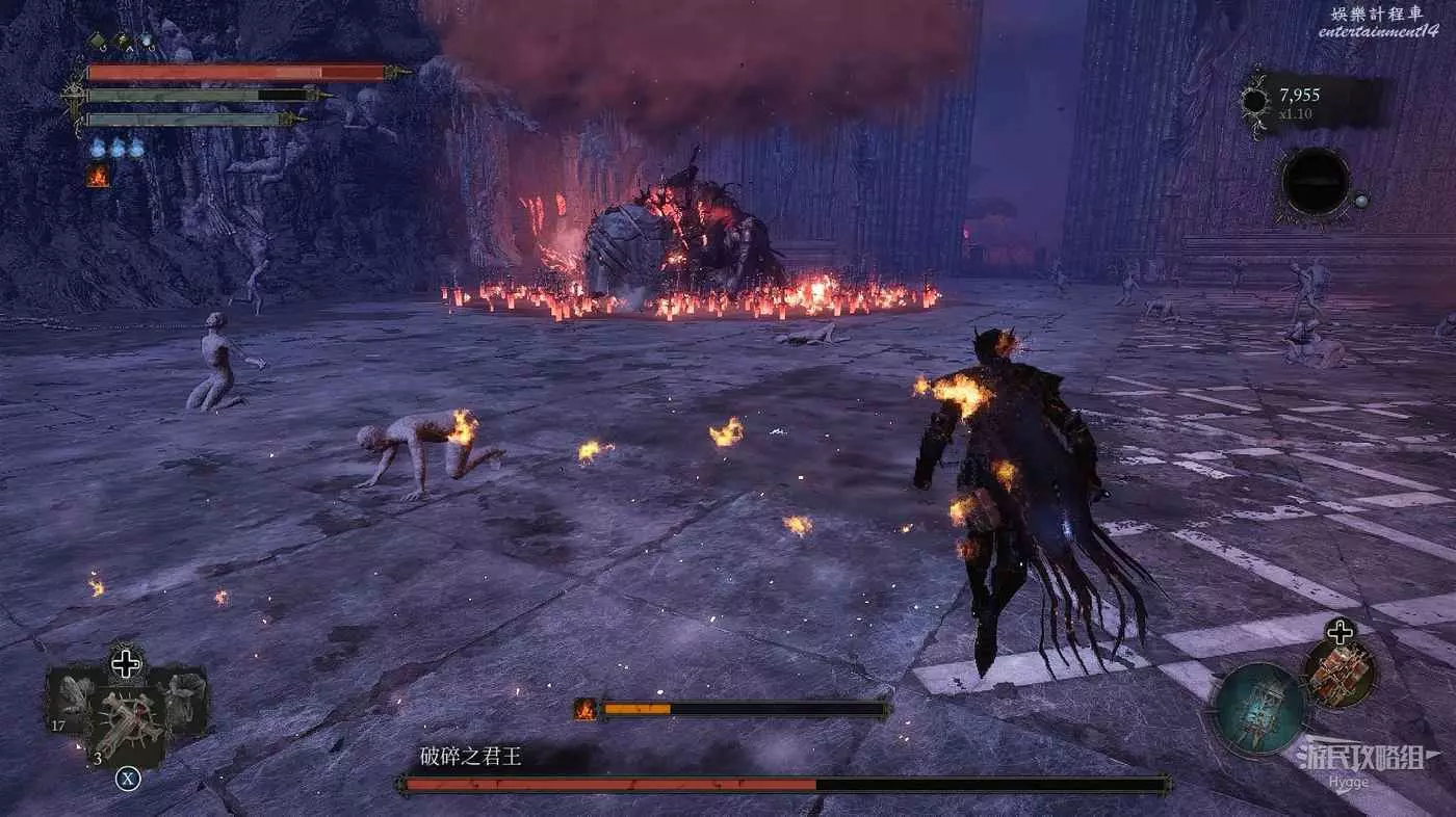 沿著平臺繼續向上,進入BOSS戰。此處的BOSS為【破碎之君王】,在剛剛進入戰鬥時破碎君王會背對我們,此時可以先上去偷幾刀。