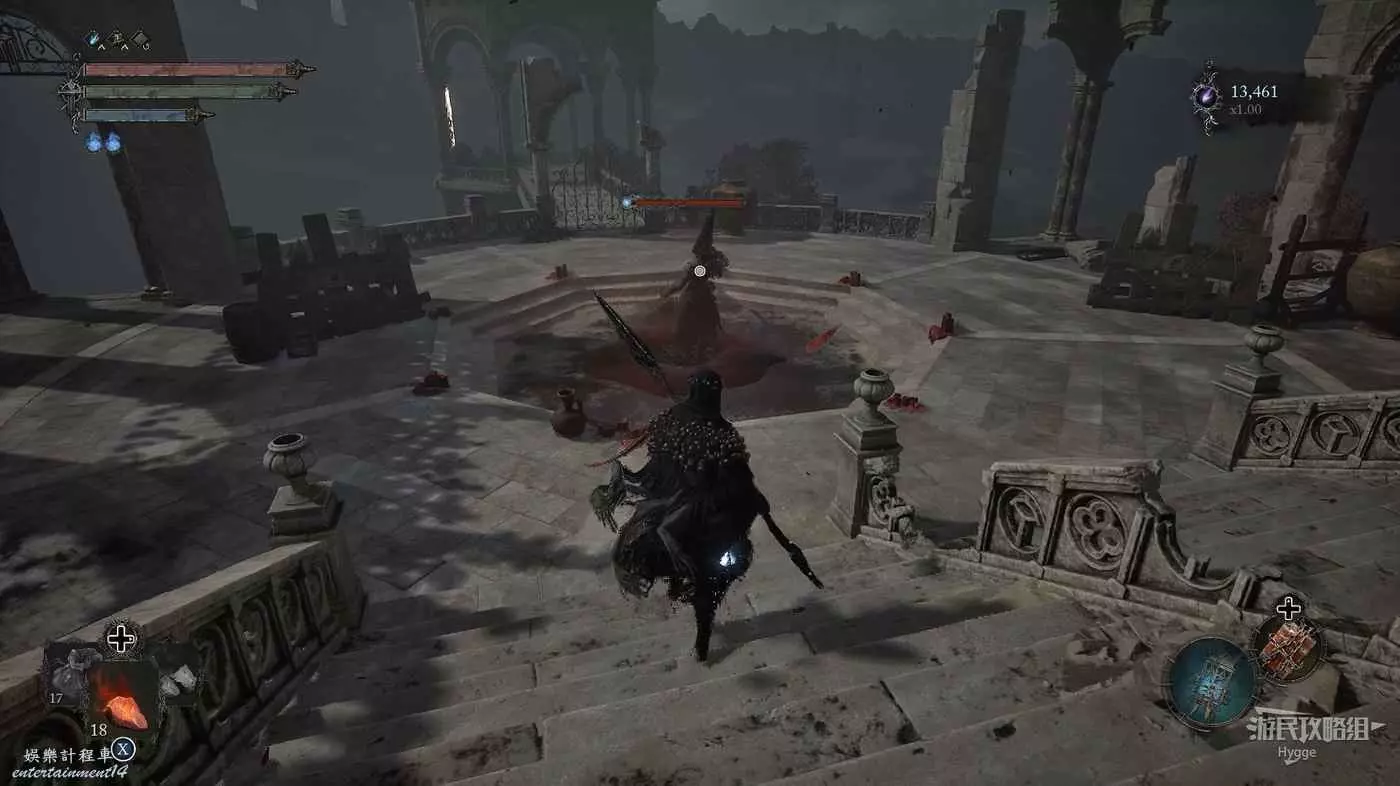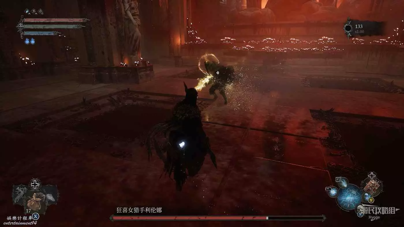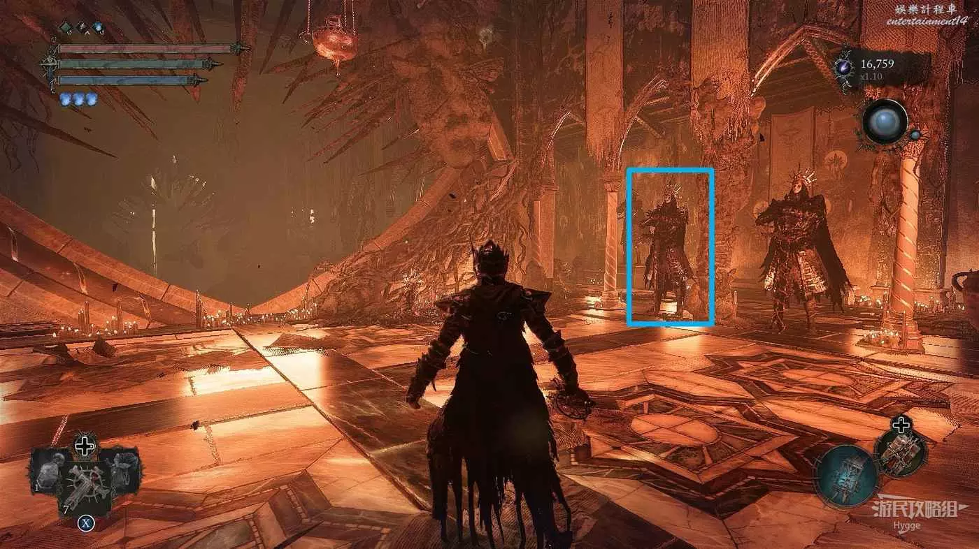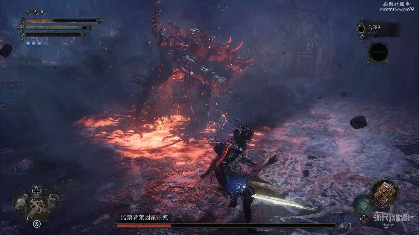 沿著平臺繼續向上,進入BOSS戰。此處的BOSS為【破碎之君王】,在剛剛進入戰鬥時破碎君王會背對我們,此時可以先上去偷幾刀。