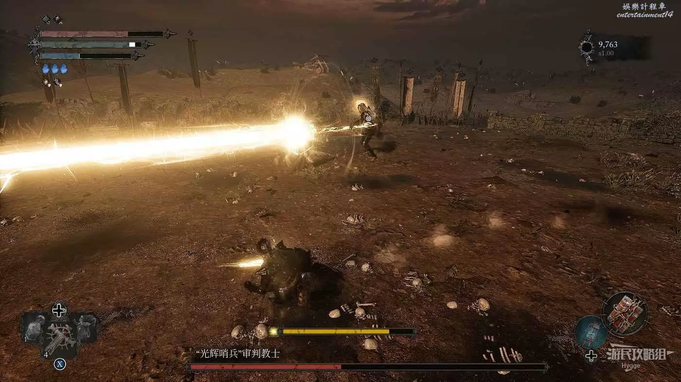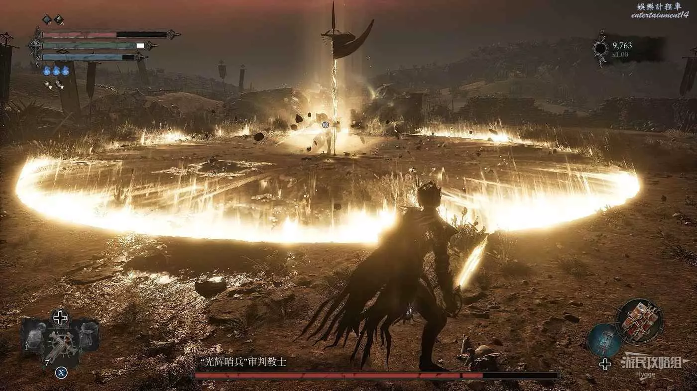 坦克雷德舉起盾牌短暫蓄力後砸向地面,隨後神聖能量會向四周擴散,及時翻滾即可躲避盾牌的砸擊和擴散的神聖衝擊波。