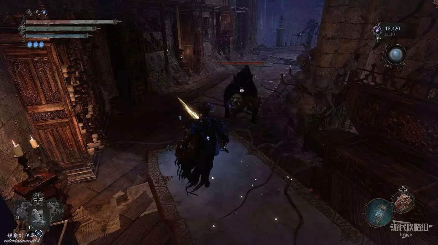 在宴會廳另一頭的房間內的祭壇上可以拿到一些道具,但房間內還有一名巫師和一隻火狼。