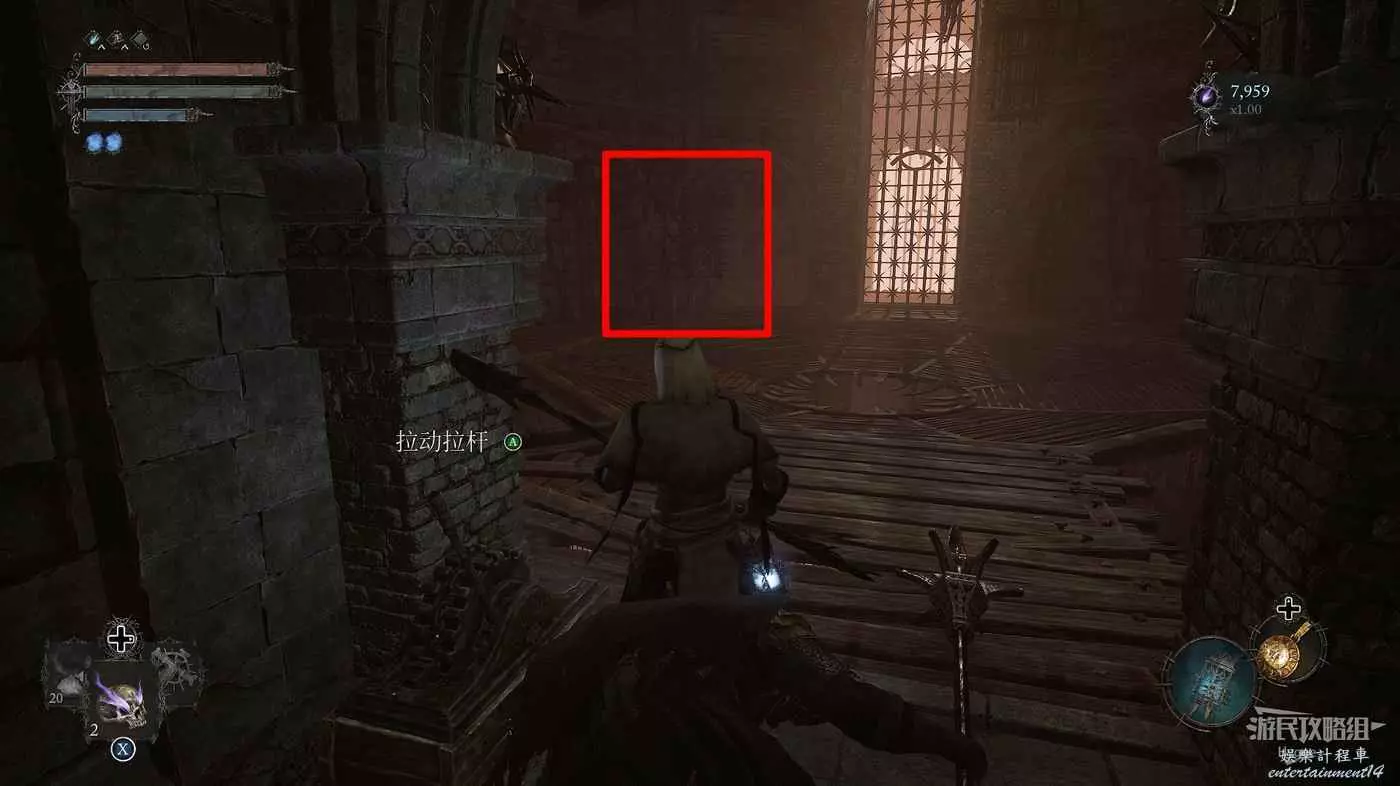 下方又有一名腐屍騎士和一名弩手,拿到【強化守護旗幟標槍】後拉動拉杆將中間的籠子升起。