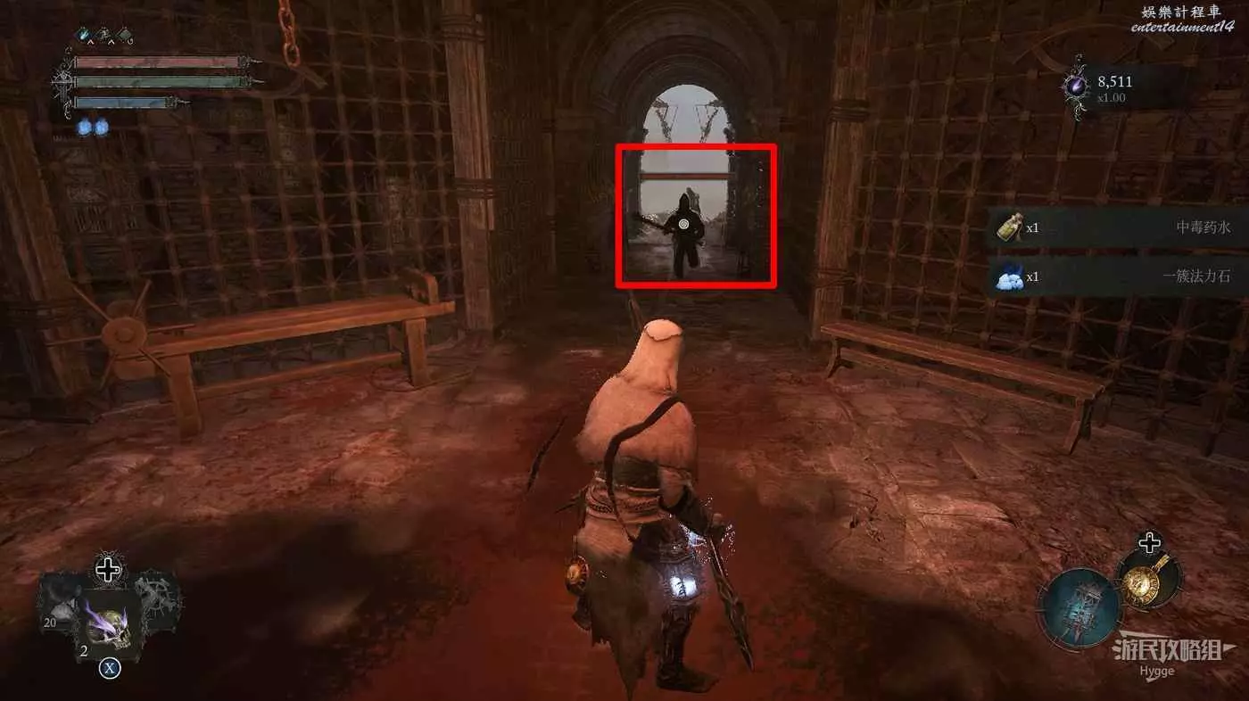 穿過房間後可以來到走廊的另一頭,從背後偷襲擊殺一名巫師。