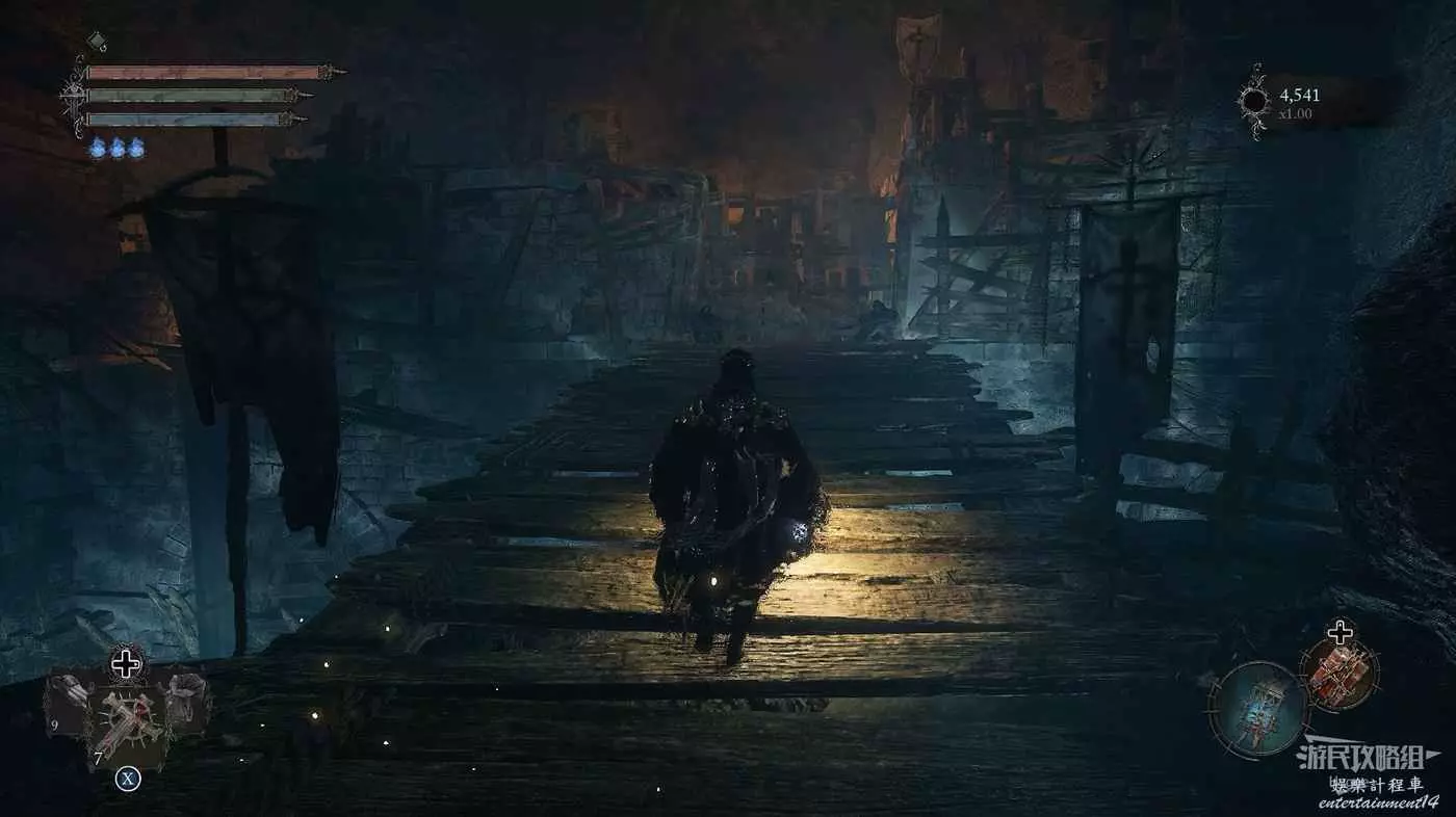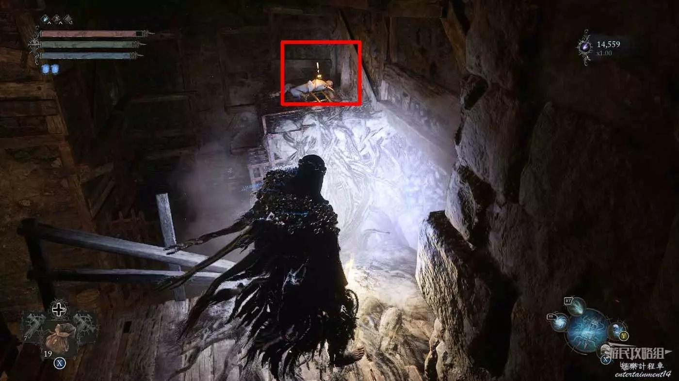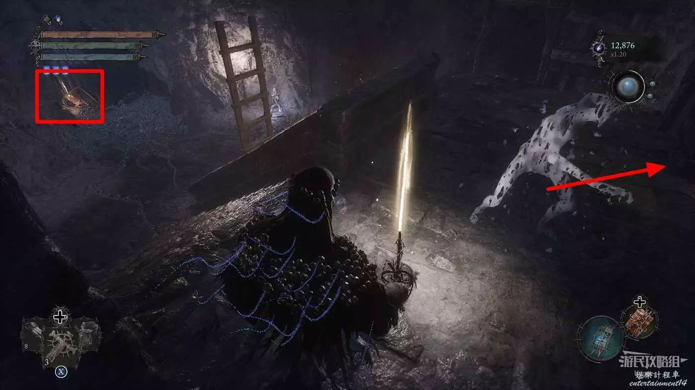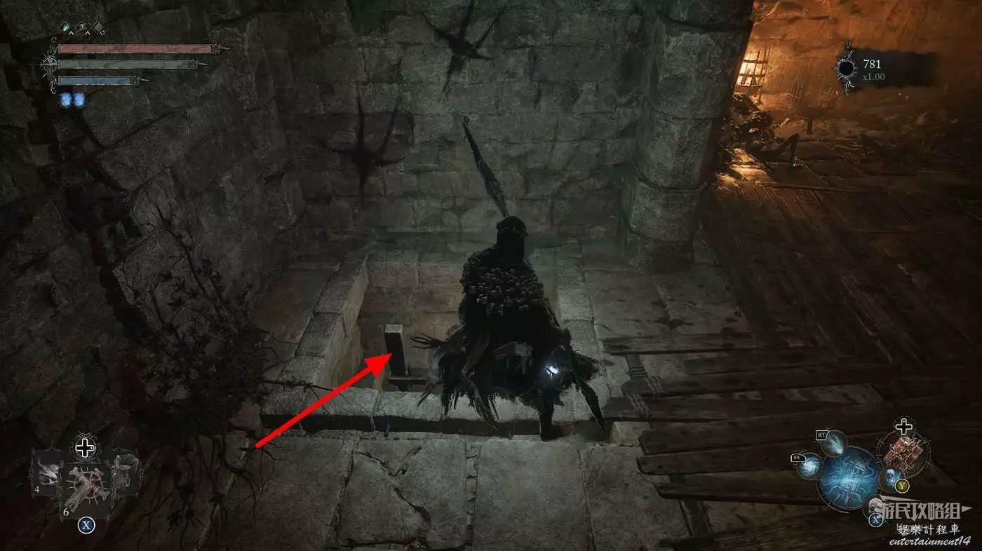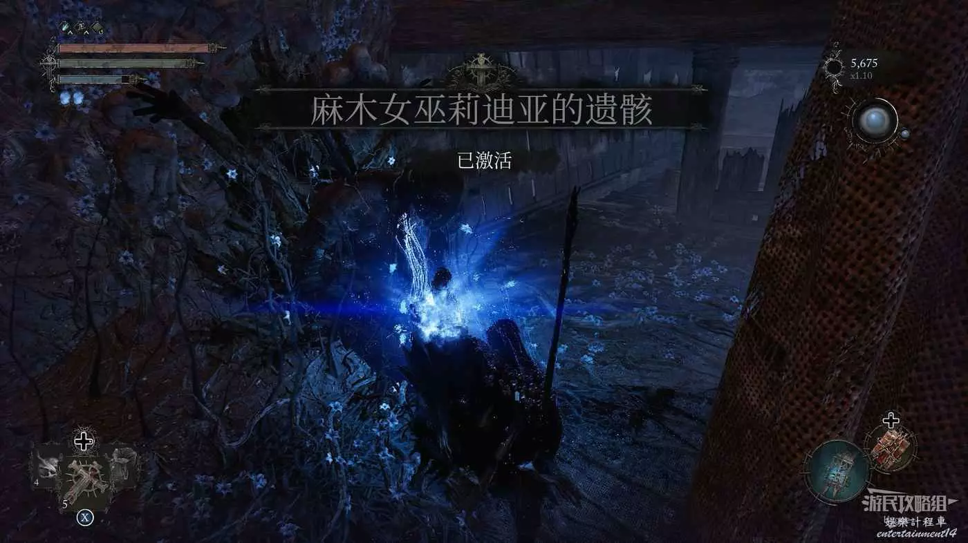 在前方右側的屋子裡先啟動【麻木女巫莉蒂亞遺骸】,然後回到屋外平臺放下梯子前往下層廣場。