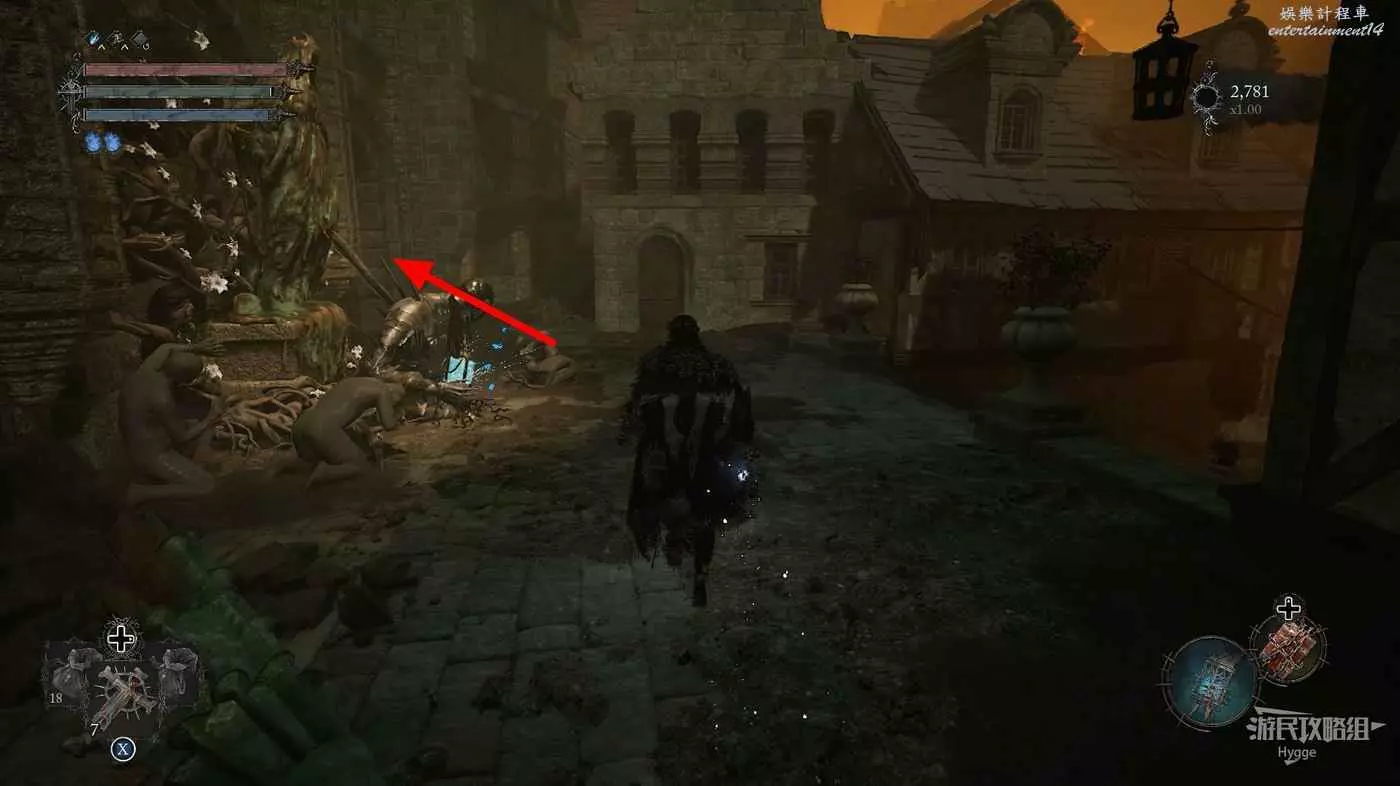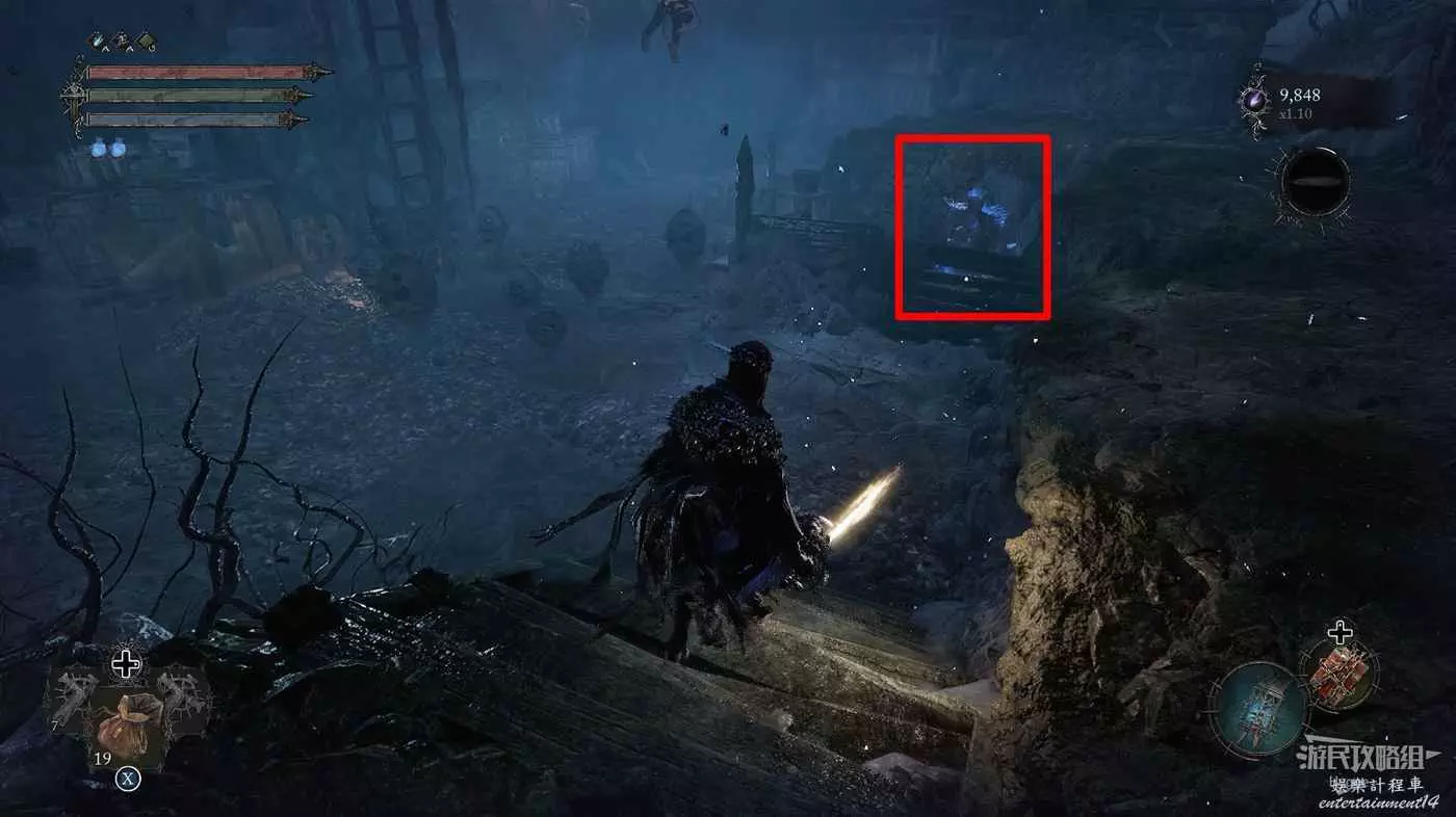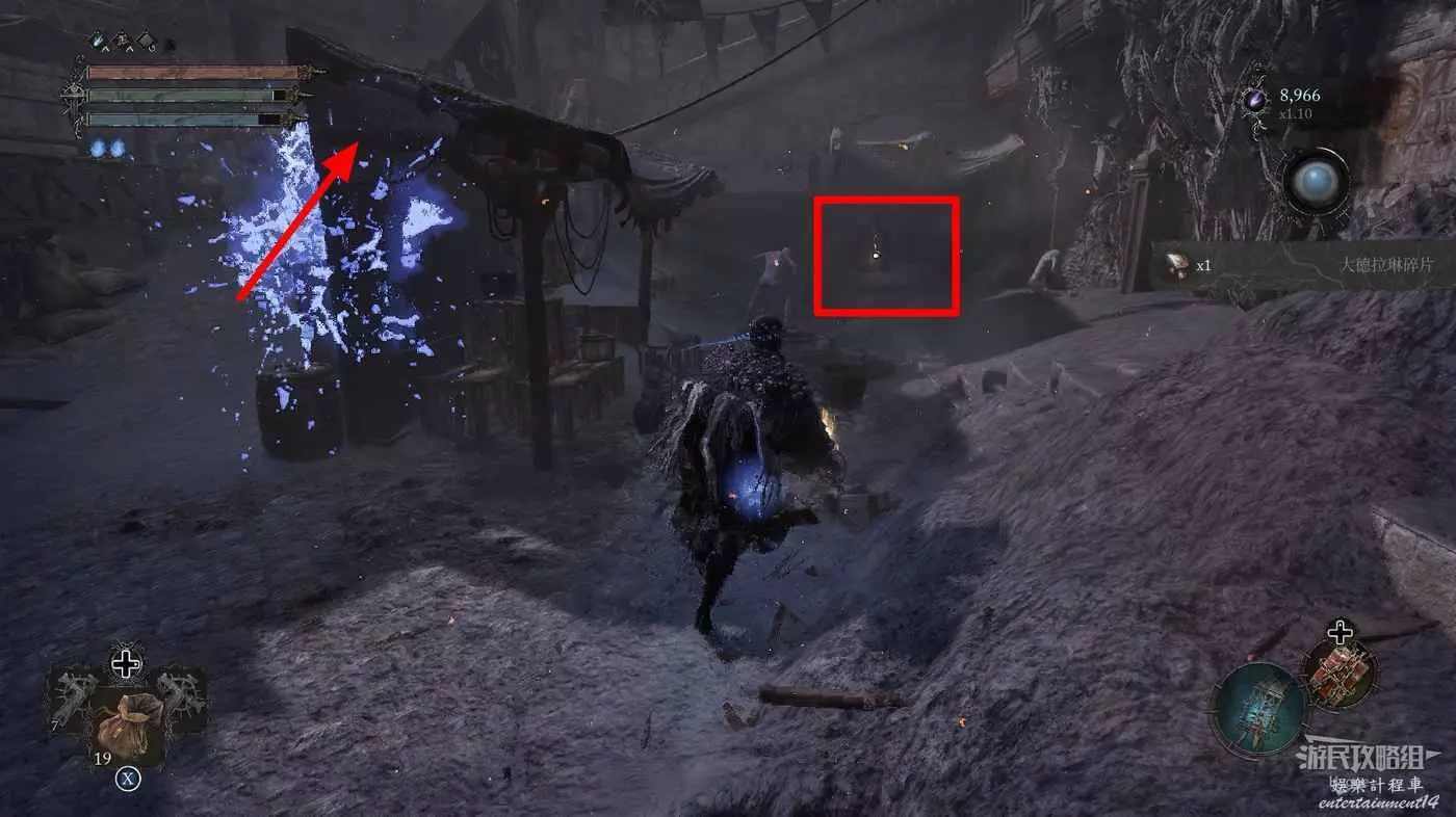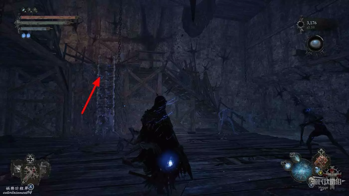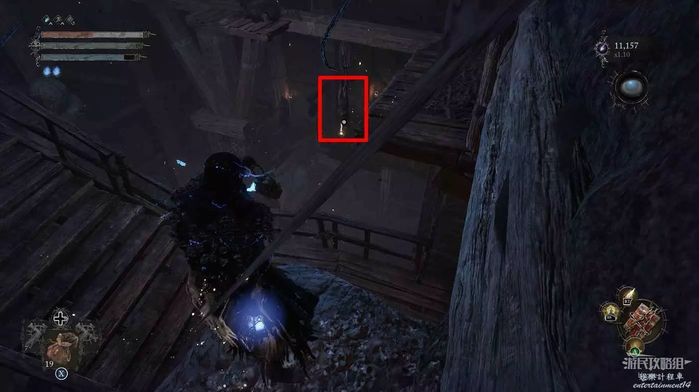 在前方右側的屋子裡先啟動【麻木女巫莉蒂亞遺骸】,然後回到屋外平臺放下梯子前往下層廣場。