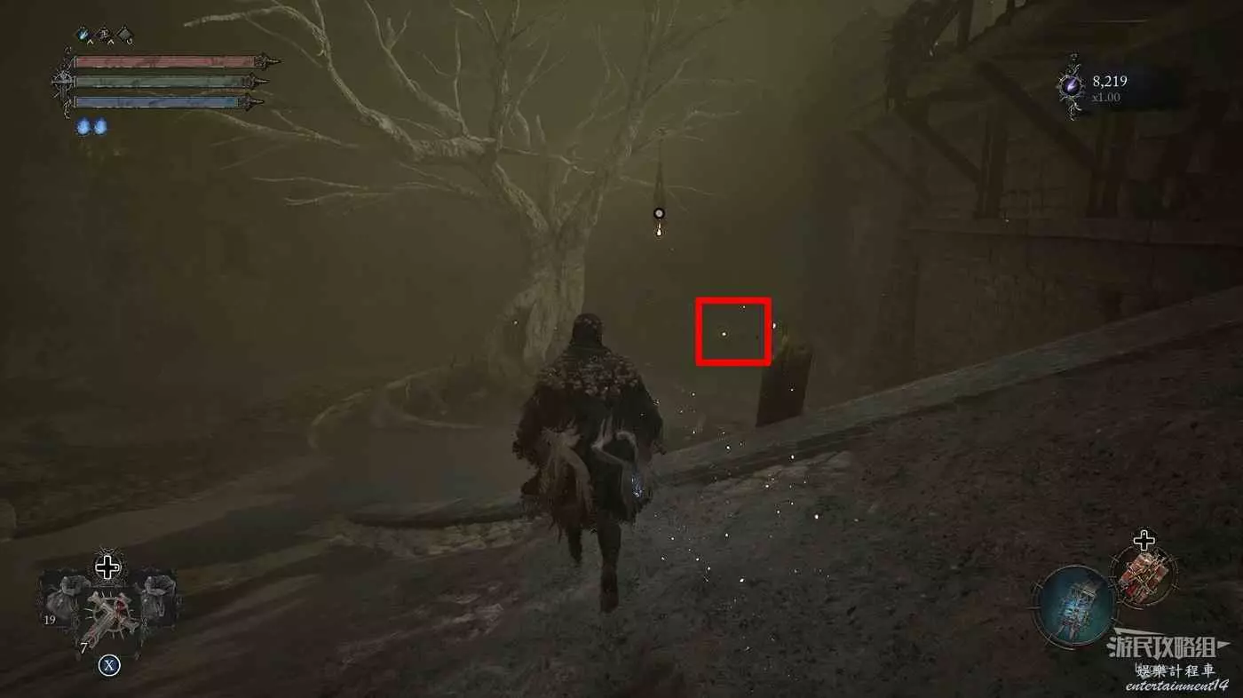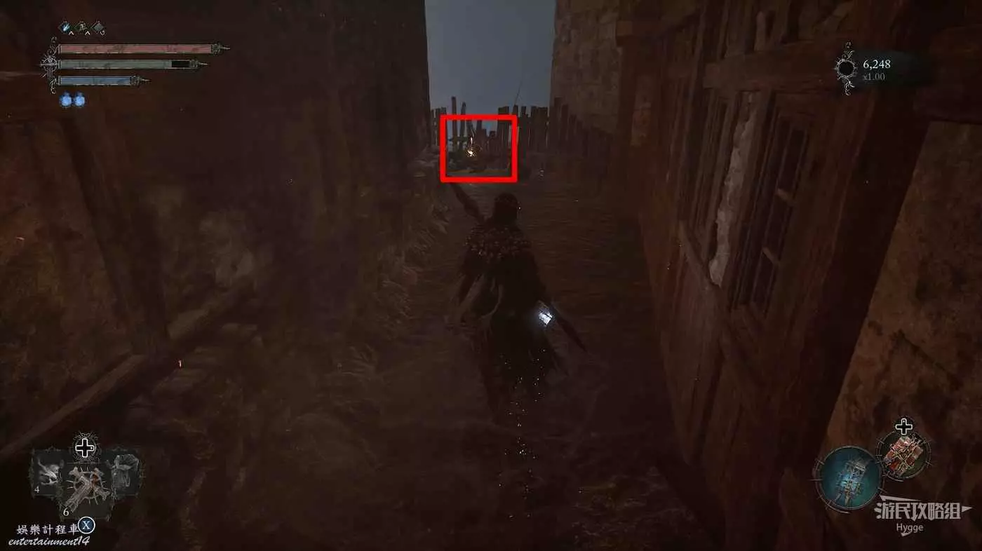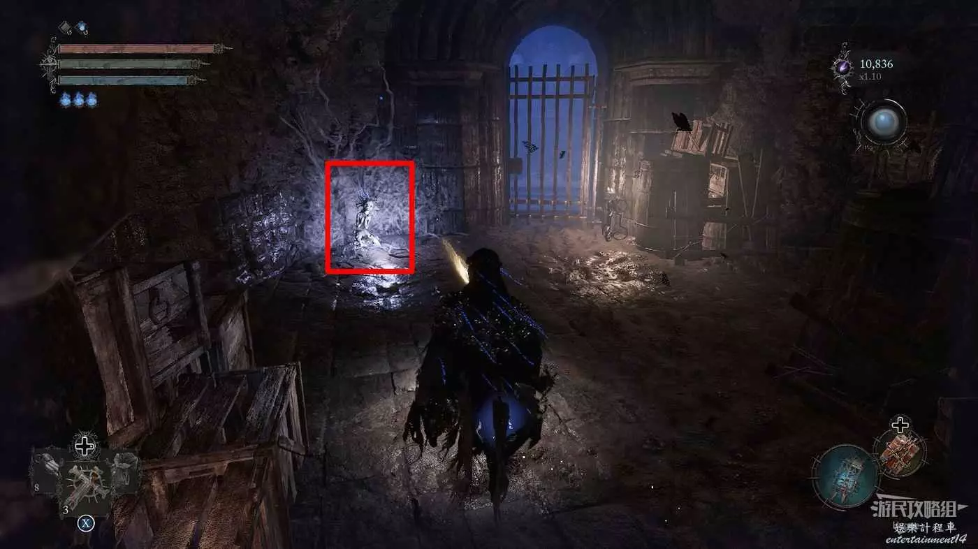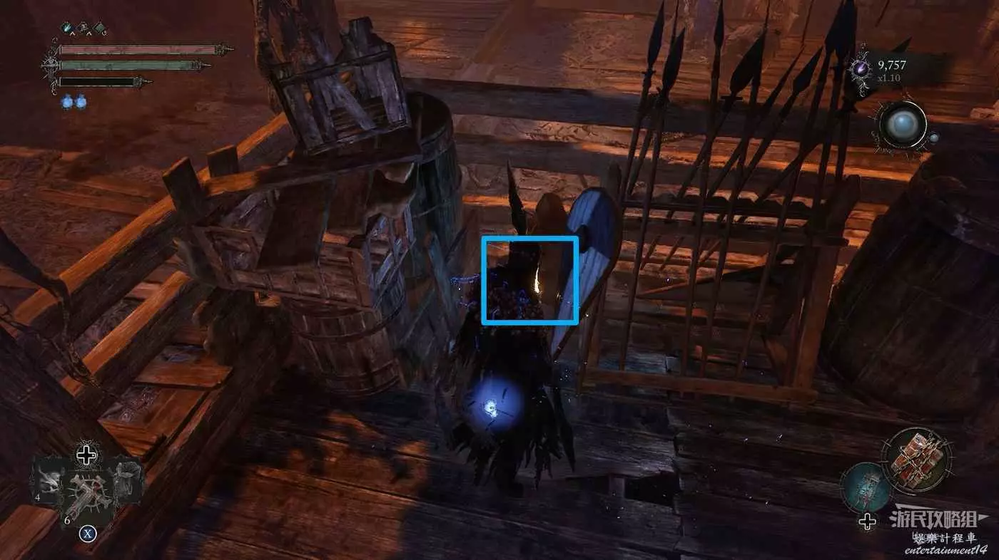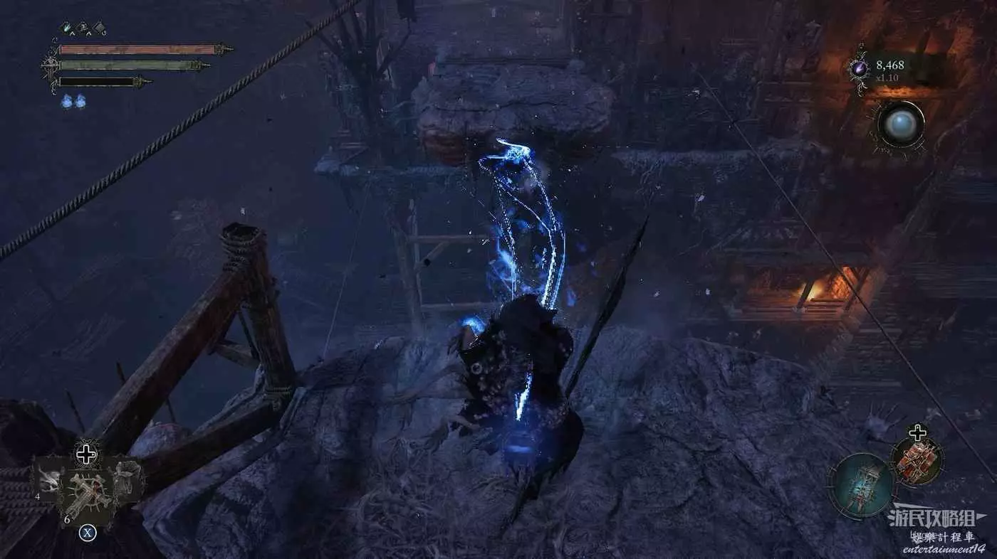 在前方右側的屋子裡先啟動【麻木女巫莉蒂亞遺骸】,然後回到屋外平臺放下梯子前往下層廣場。