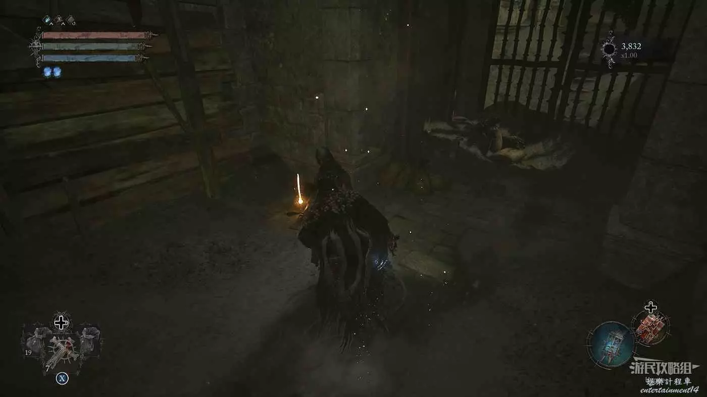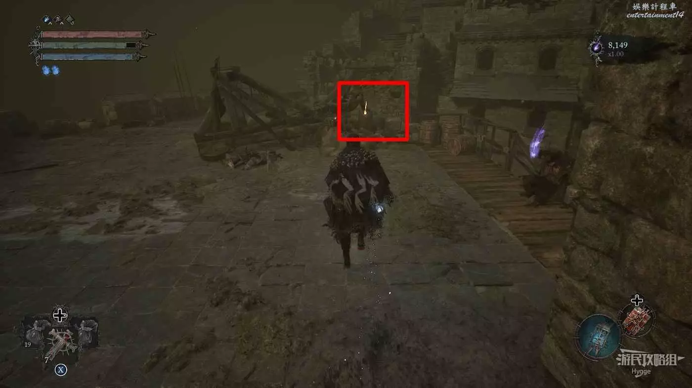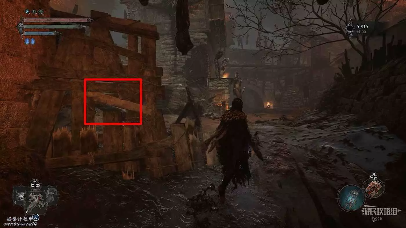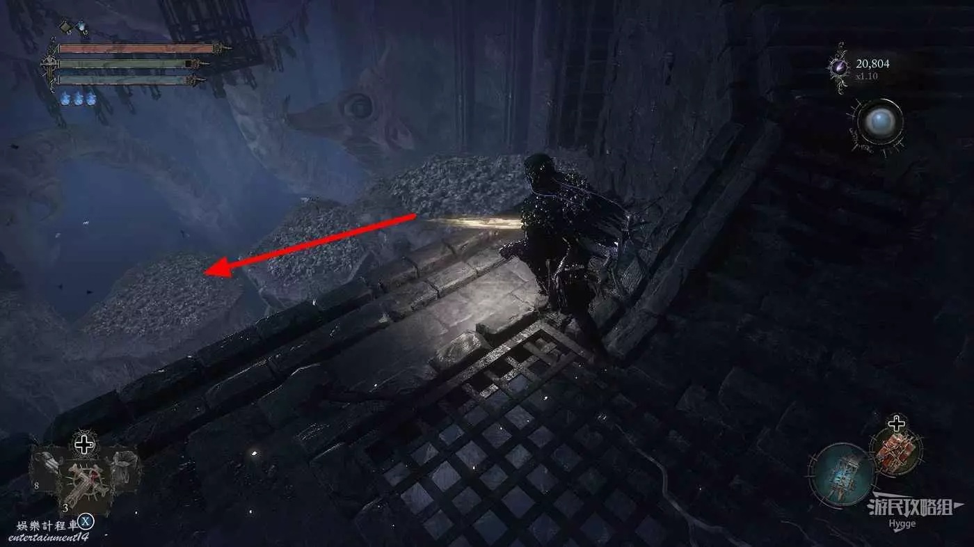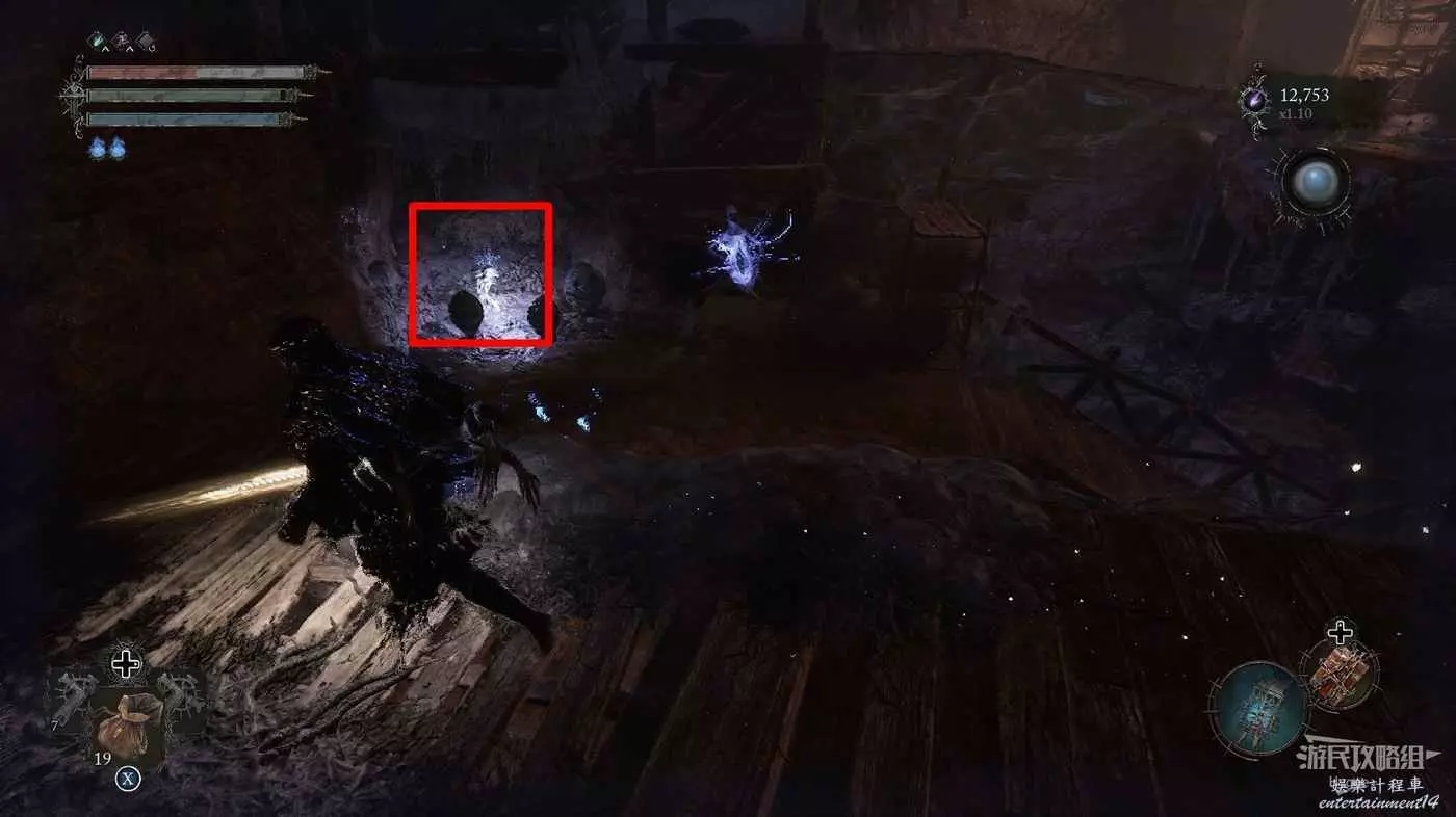 在前方右側的屋子裡先啟動【麻木女巫莉蒂亞遺骸】,然後回到屋外平臺放下梯子前往下層廣場。